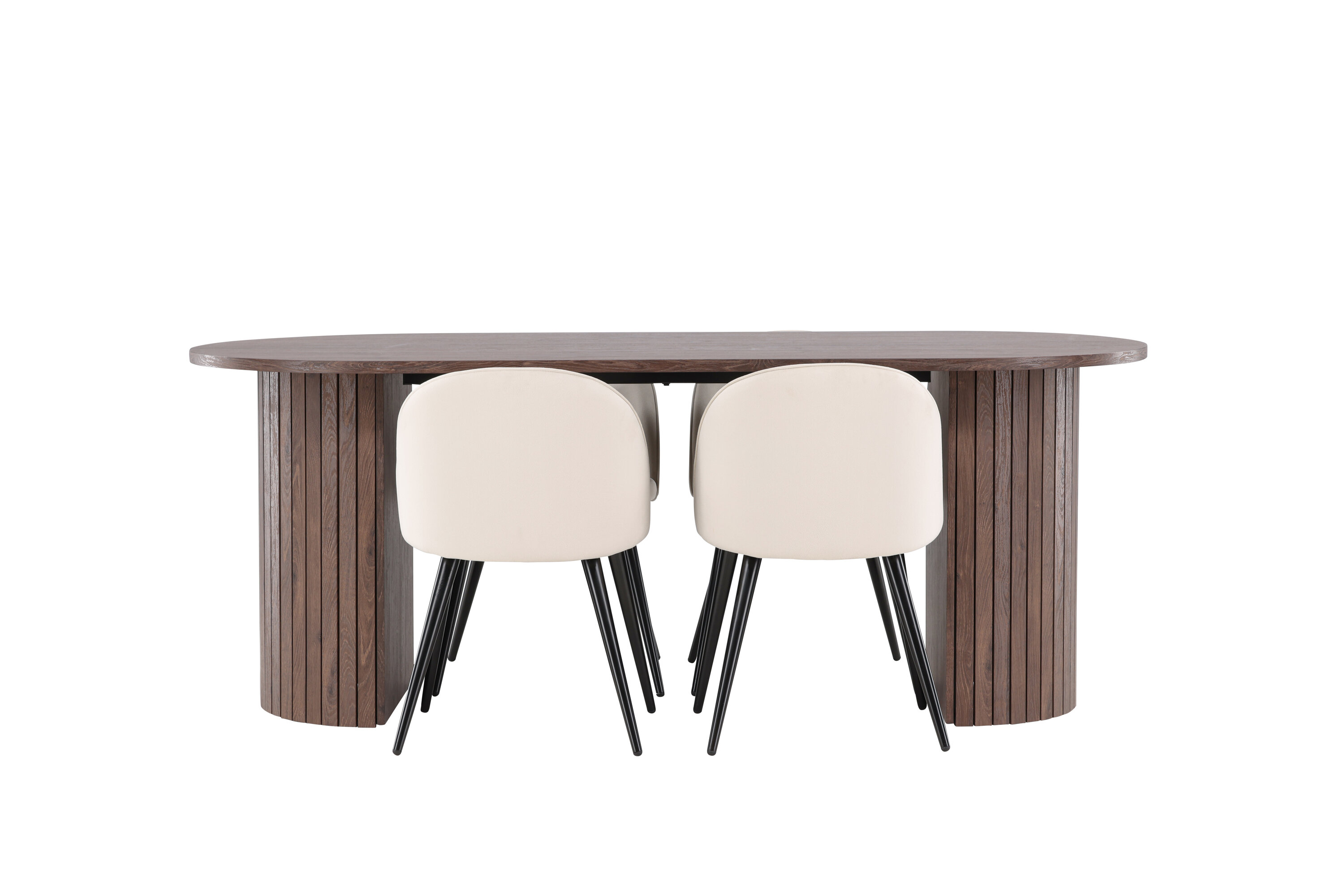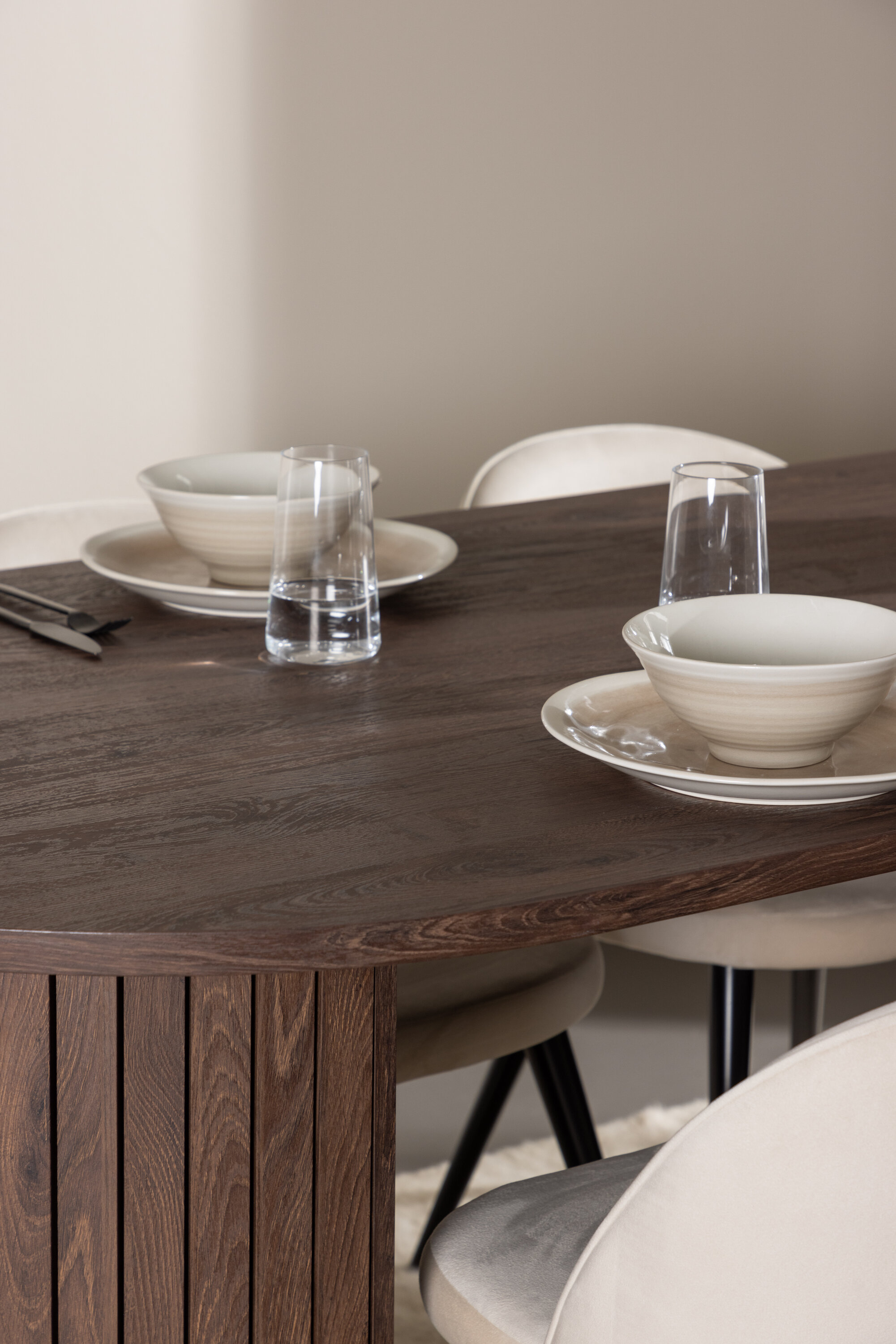 Avasta täiuslik söögikomplekt Velveti söögitoolide ja Häröni söögilauaga – moodsa elegantsi ja mugavuse kombinatsioon sinu koju. Stiilse beeži värvi sametest söögitoolidel on täielikult polsterdatud disain, millel on sametkangast veidi ümar seljatugi ja iste, samuti musta pulbervärvitud metallist jalad. Need toolid on nii mugavad kui ka pilkupüüdvad, mistõttu on need ideaalsed teie söögitoas kutsuva ja hubase atmosfääri loomiseks. Vajalik kerge kokkupanek. Hooldusnõuanded: Sametil on kalduvus kuhja mahapanekul survejälgi jääda, mis on seda tüüpi materjali puhul täiesti normaalne. Sõltuvalt sellest, kuidas valgus langeb, võib kangas nihkuda erinevates toonides. Komplektis Häröni söögilaud, kus valmivad kogukonna õitsengud ja mälestused. Suurte mõõtmetega 200×90 cm laud pakub palju ruumi nii pere kui sõprade kogumiseks meeldivateks õhtusöökideks ja pikkadeks vestlusteks. Häröni söögilaud on elegantses mokavärvis, mis annab teie ruumile maalähedase ja neutraalse tunde. Lauaplaat on valmistatud MDF-st ja seda toetavad tugevad terasest jalad, mis tagavad stabiilsuse kõikide söögikordade ja koosviibimiste ajal. Looge selle söögikomplektiga sõpruse ja koosolemise atmosfäär, kus igast söögikorrast saab eriline hetk, mida mäletada. Olgu igapäevaseks söögiks või pidulikuks sündmuseks, Velvet söögitoolid ja Härön söögilaud on teie kodu süda, kus tugevdatakse suhteid ja jagatakse rõõmu.