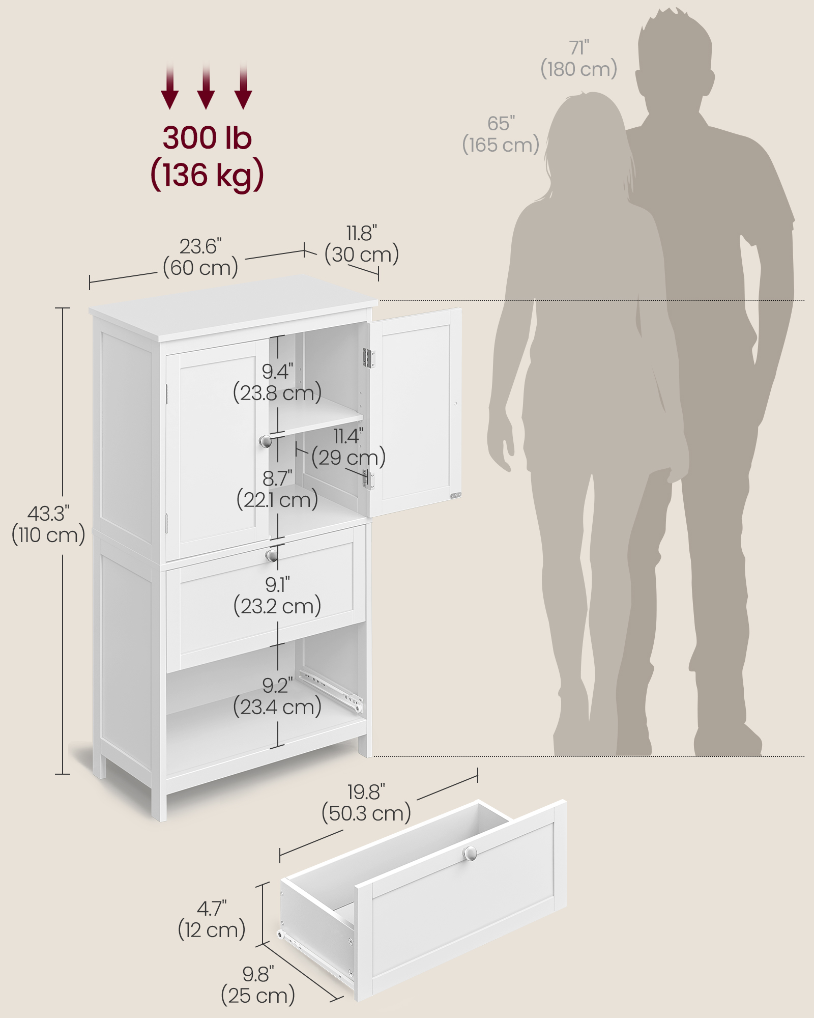 Spetsifikatsioonid: Värvus: Valge Materjal: MDF (keskmise tihedusega puitkiudplaat) Toote mõõdud: 11,8”S x 23,6”L x 43,3”K (30 x 60 x 110 cm) Toote kaal: 40,8 naela (18,5 kg) Pealispinna maksimaalne staatiline kandevõime: 300 naela (136 kg) Pakisisu: 1 x vannitoakapp 1 x tarvikute kott 1 x ümberminekuvastane komplekt 1 x juhend