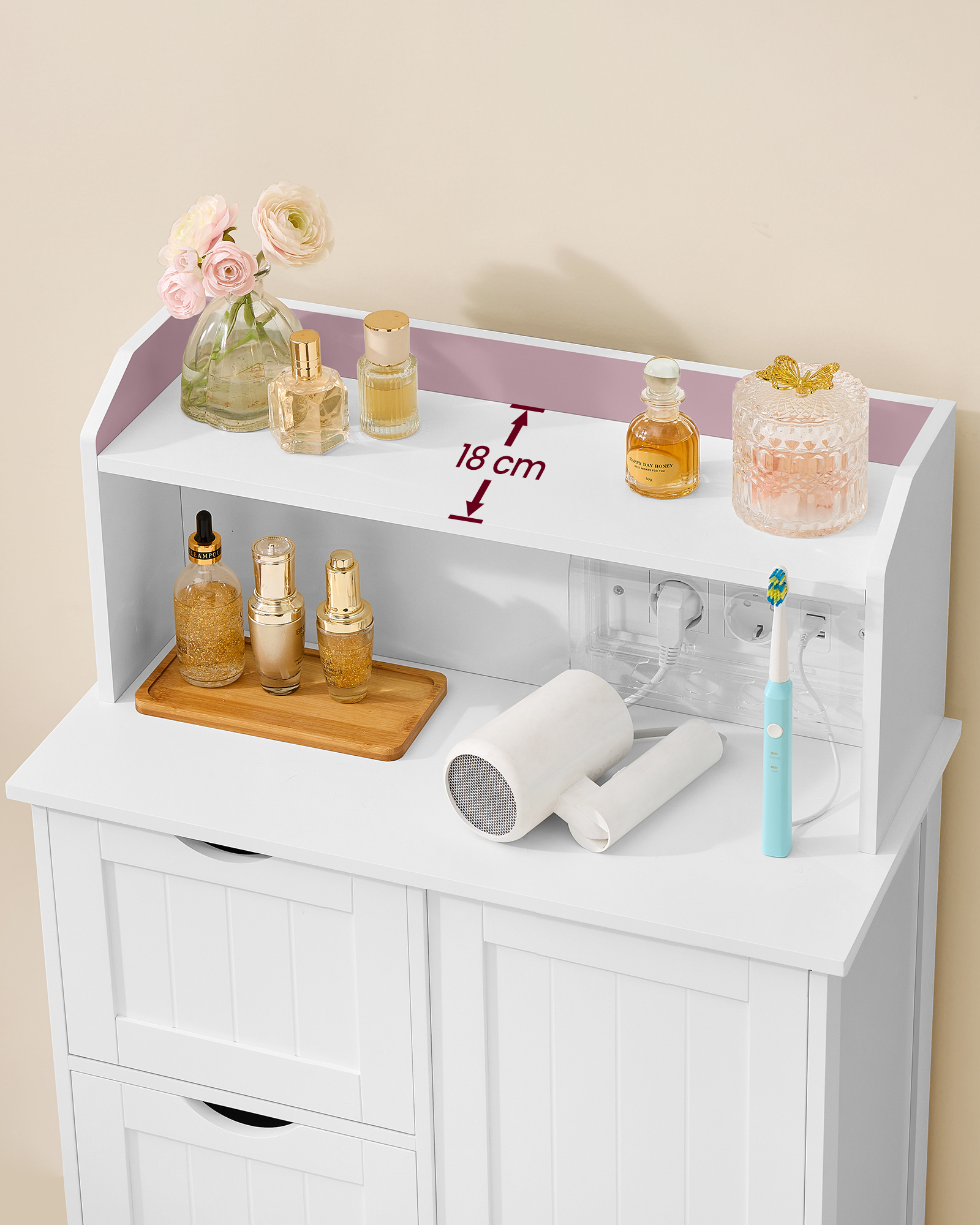 Toote andmed: Värvus: Pilvevalge Materjal: MDF (keskmise tihedusega puitkiudplaat) Suurus: 30 x 60 x 100 cm (S x L x K) Kaal: 16 kg Ülemise avatud riiuli maksimaalne staatiline kandevõime: 15 kg Teise avatud riiuli maksimaalne staatiline kandevõime: 10 kg Iga sisemise riiuli maksimaalne staatiline kandevõime: 5 kg Sahtli maksimaalne staatiline kandevõime: 5 kg Pakisisu: 1 x Vannitoakapp 1 x Lisatarvikute komplekt 1 x Kallutusvastane seadeldis 1 x Kasutusjuhend