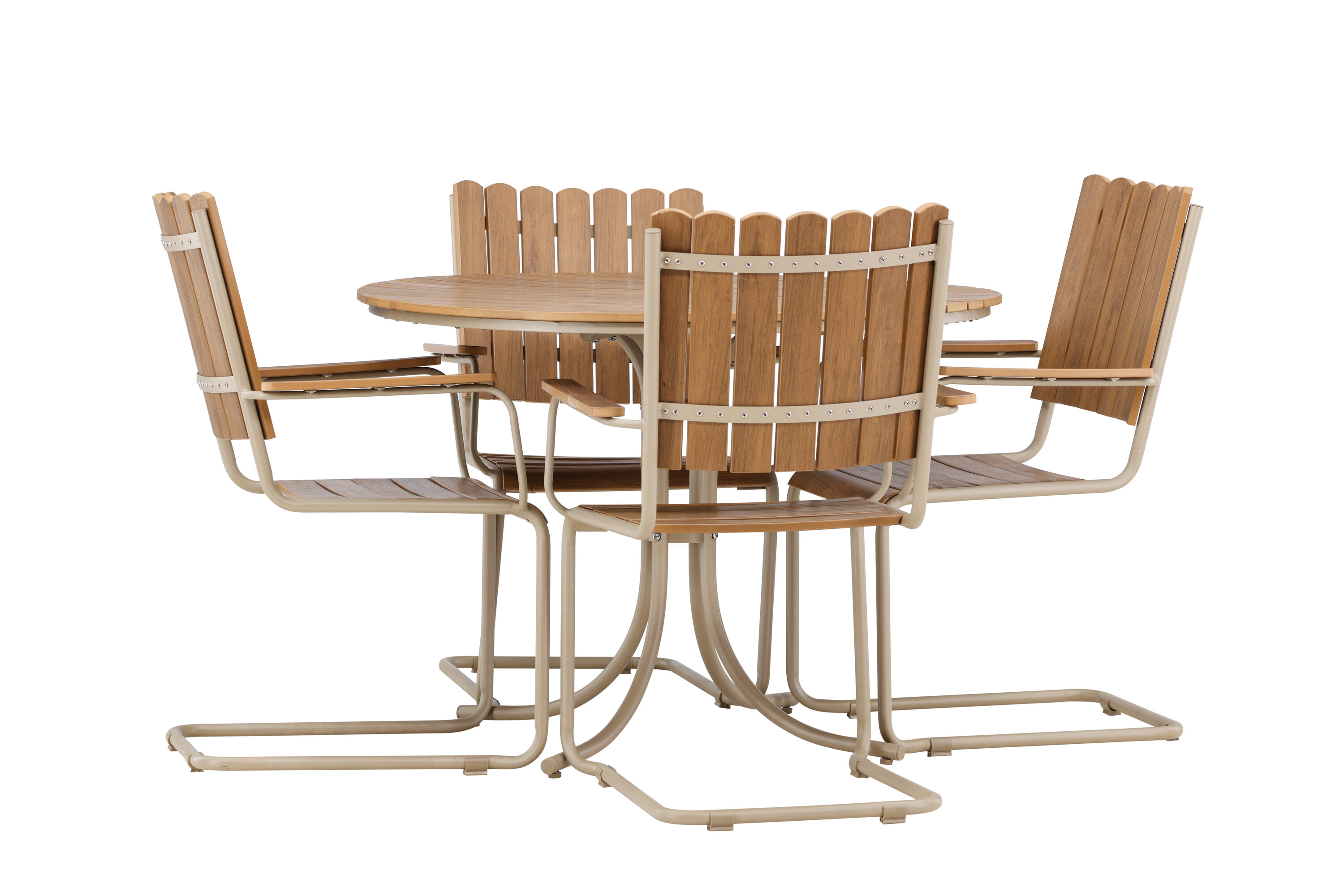 Holmsund on ideaalne söögikomplekt neile, kes soovivad ühendada funktsionaalsuse elegantse disainiga. Ümar laud, mille läbimõõt on 110 cm, pakub palju ruumi neljale inimesele ning sobib ideaalselt õhtusöökideks ja seltskondlikeks koosviibimisteks. Stiilne beež värv lisab moodsa ja kutsuva puudutuse, mis sulandub sujuvalt enamikesse kodukeskkondadesse.