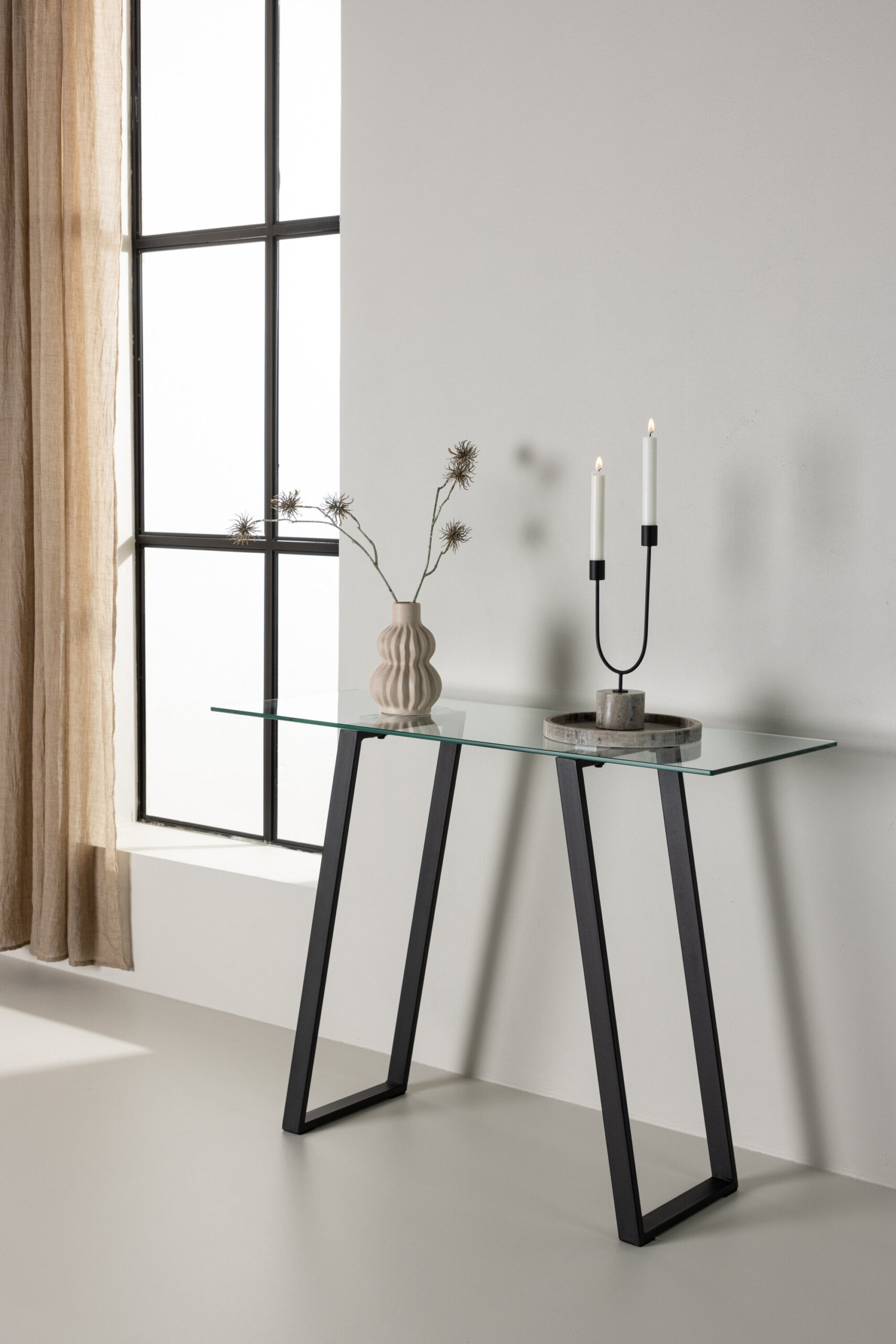 Elegantne läbipaistev klaaskate loob õhulise ja särava atmosfääri, tuues samal ajal esile dekoratiivse musta terasraami. Klaasi ja terase kombinatsioon annab keeruka ja kaasaegse disaini, mis avaldab muljet kõigile, kes seda näevad.