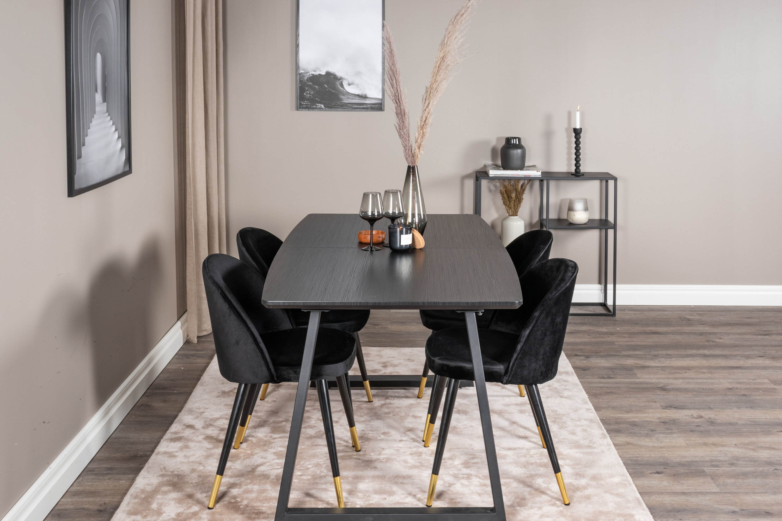 Meie pikendatav söögilaud Inca, siin koos meie luksuslike söögitoolidega sarjast Velvet, mille alumises osas on stiilsed detailid. Siit saate toidugrupi, mis sisendab otse luksust ja elegantsi.