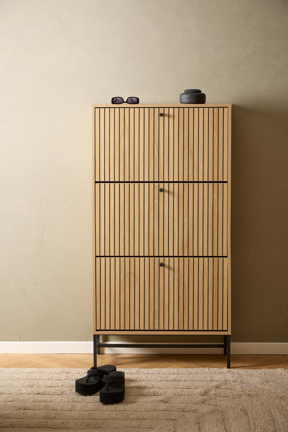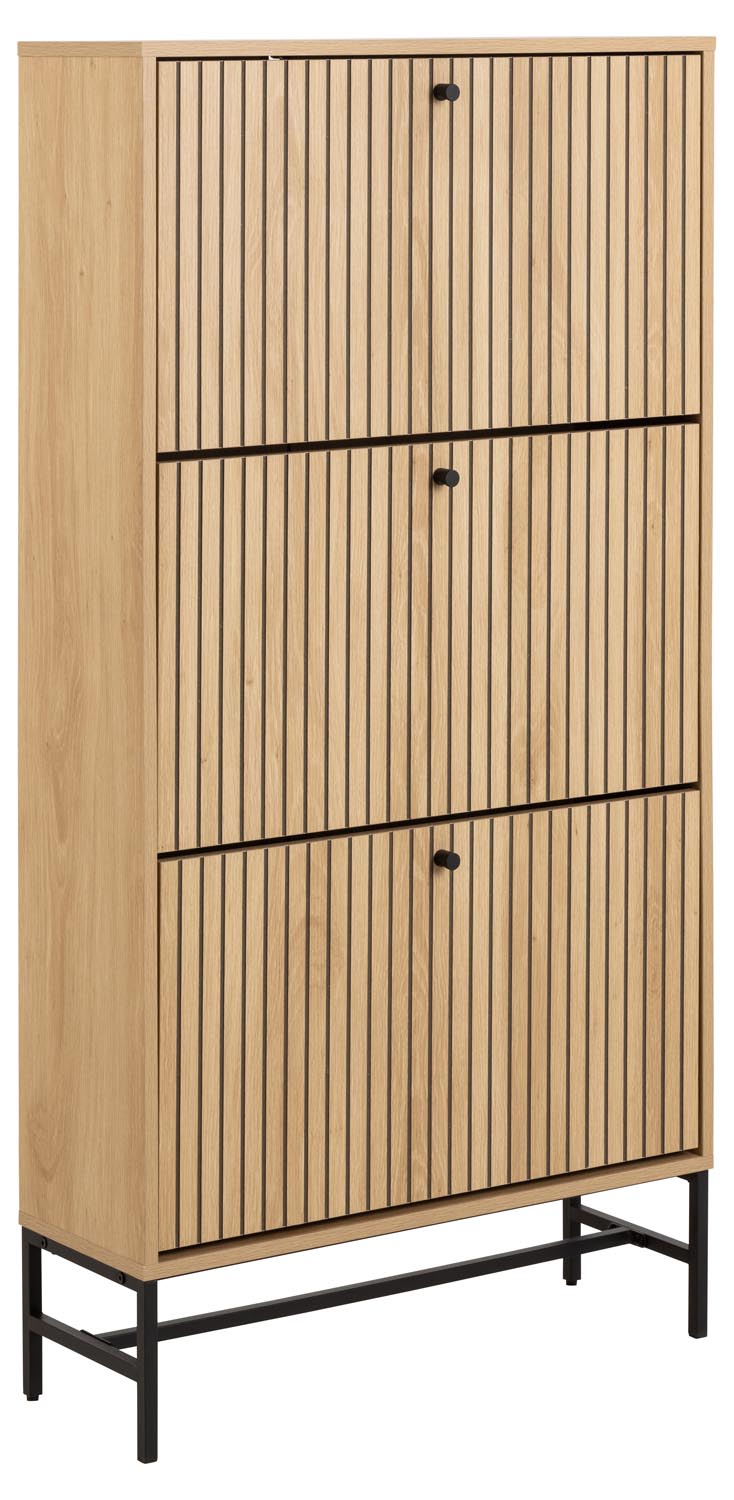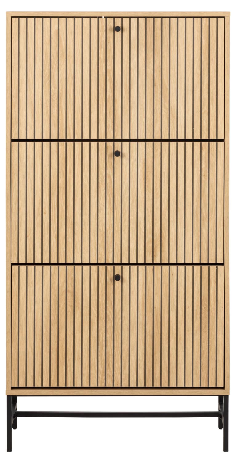 Jalanõudekapp muudab iga esiku stiilsemaks ja lisab praktilisust. Kapp aitab ruumi efektiivselt kasutada ja hoida jalanõud silma alt ära. Kapp on valmistatud tamme melamiinist. Alus on valmistatud mattmustast pulbervärvitud terasest. Mõõdud 71,6x25xH140,4cm.
