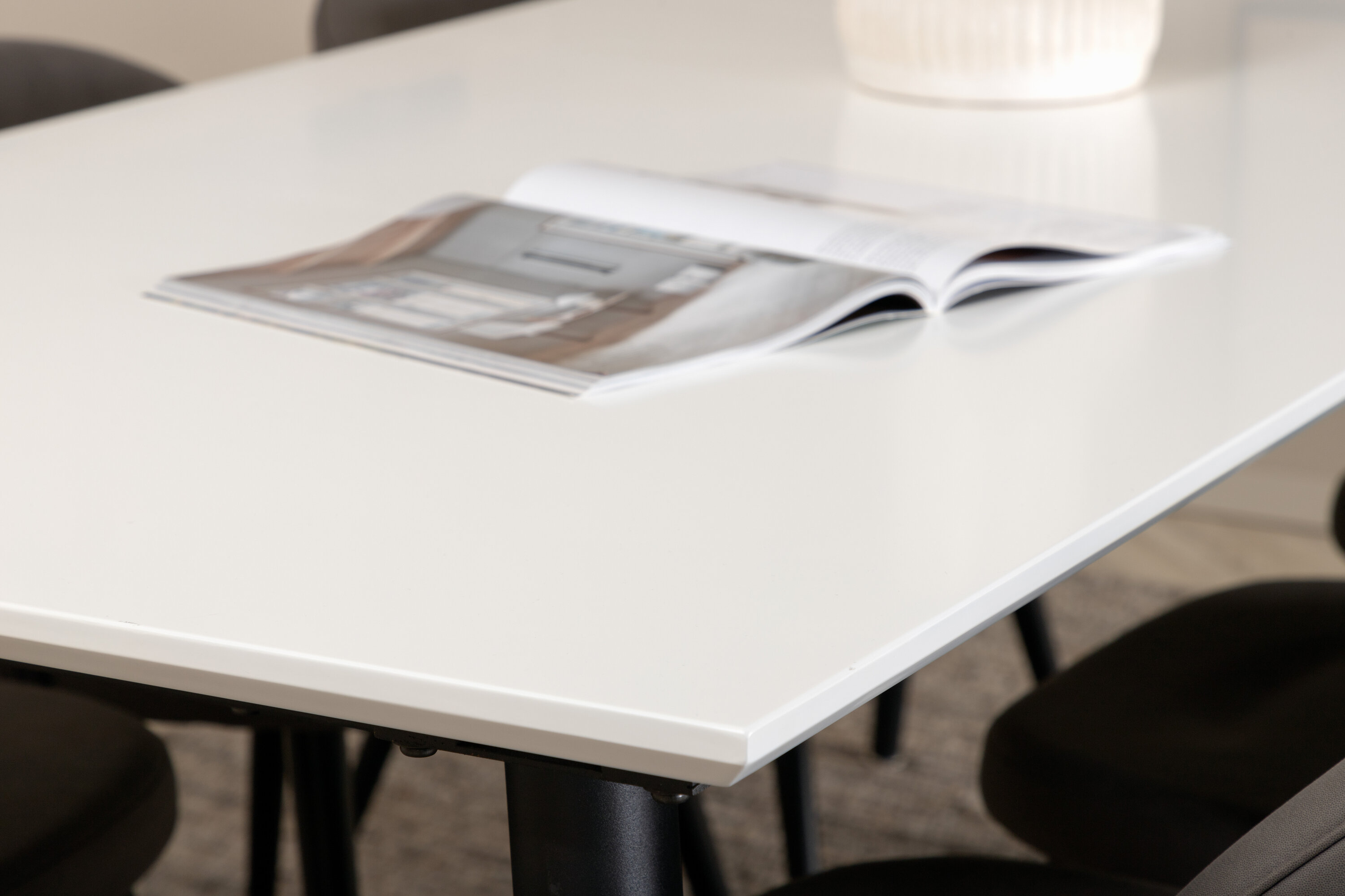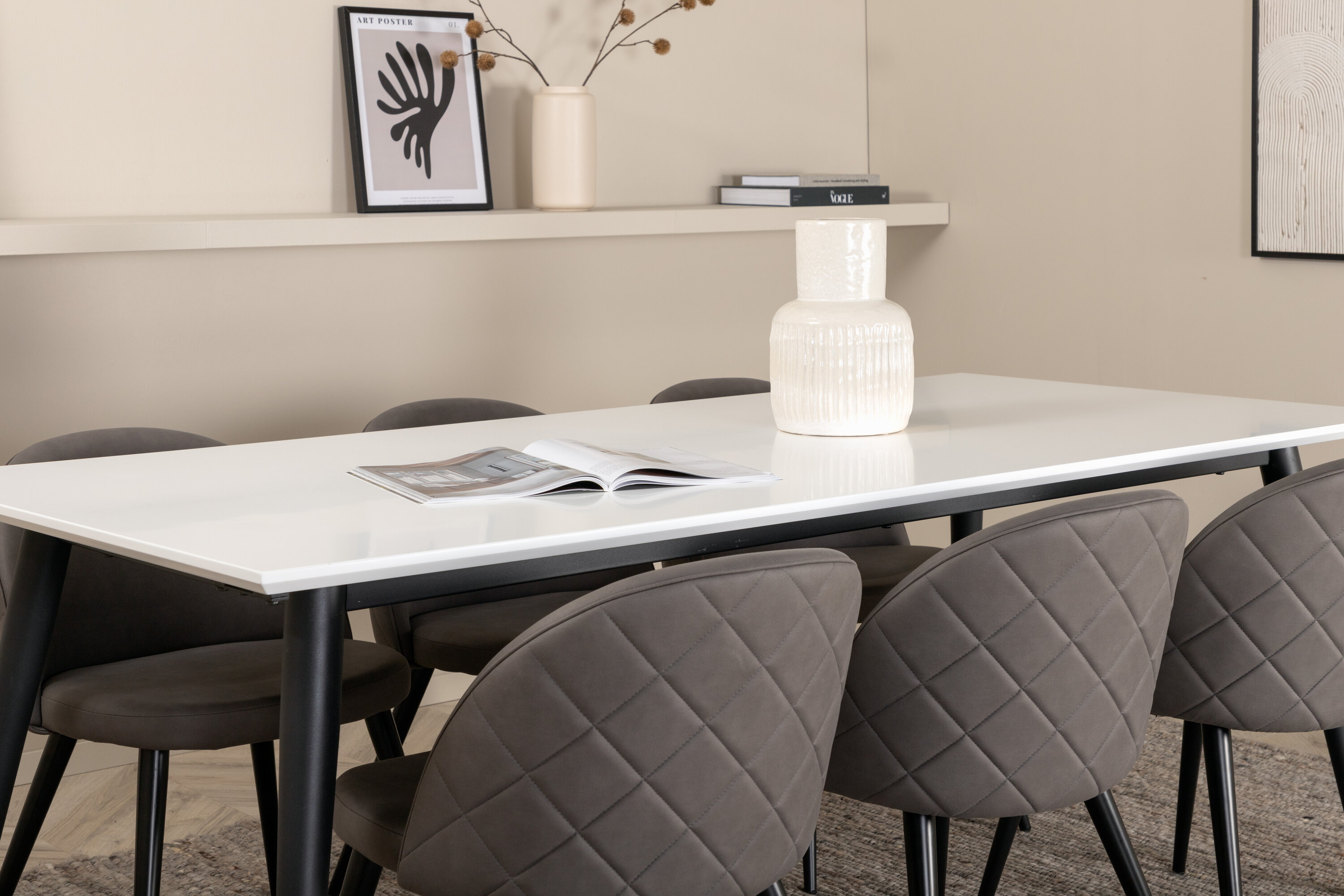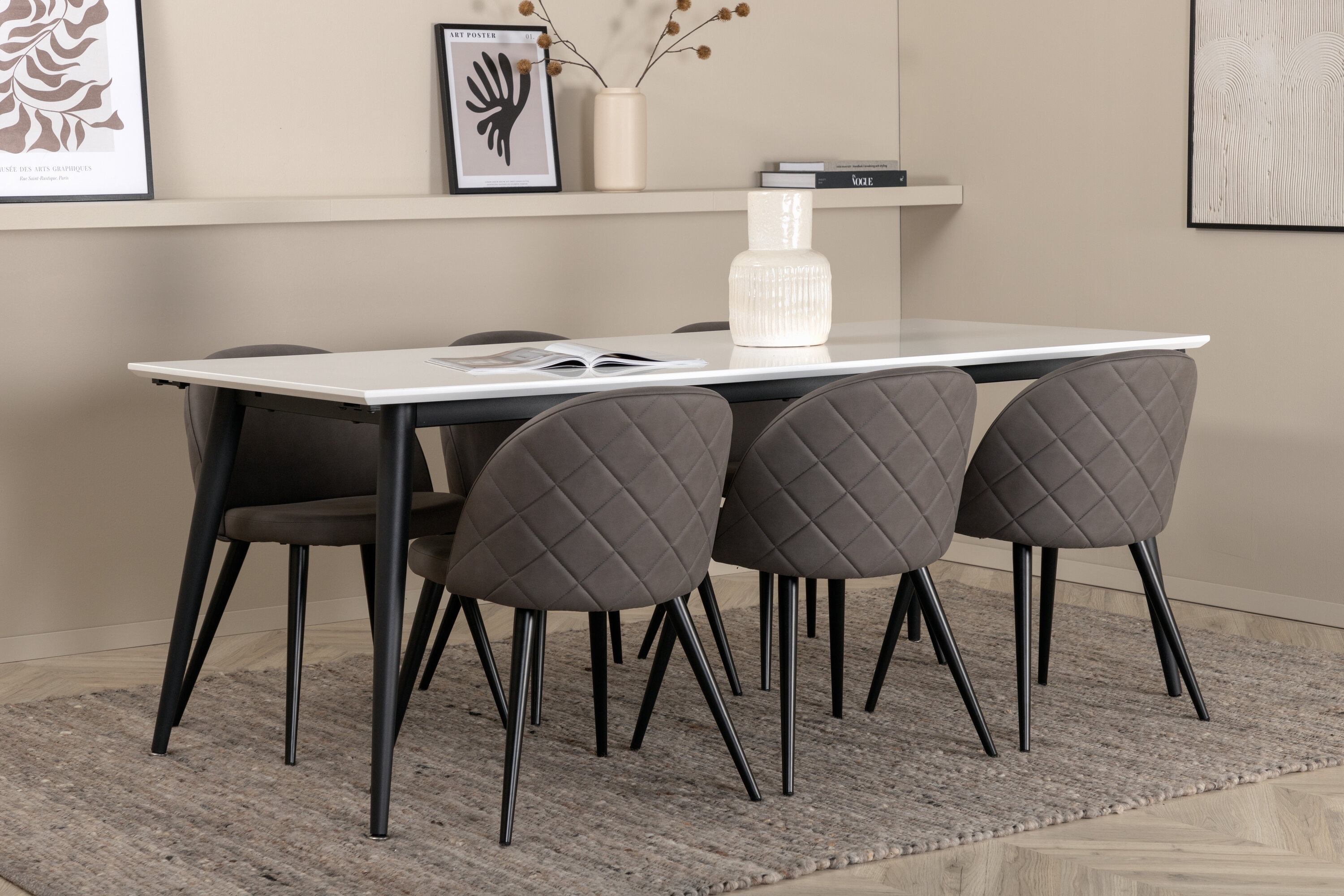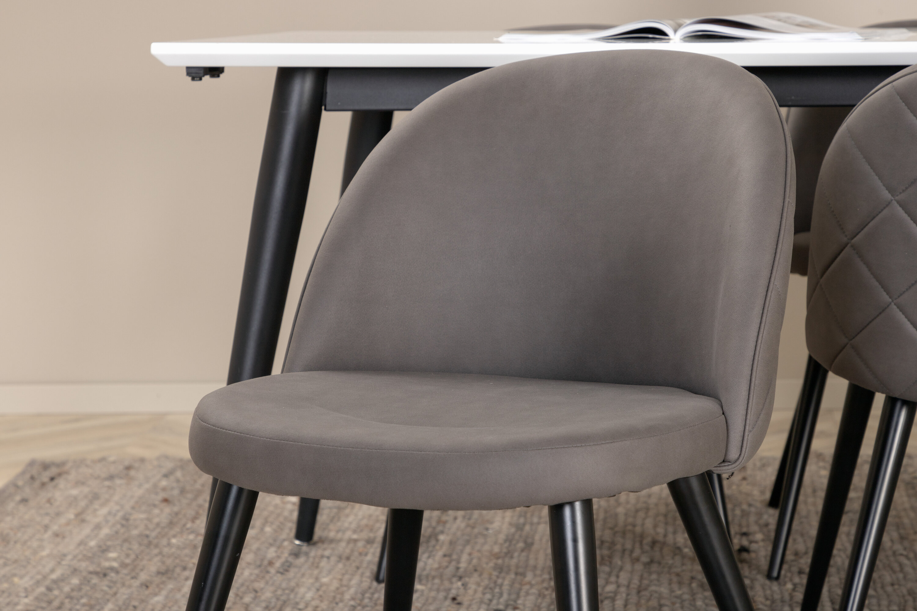 Loo kodu südames kodune ja kutsuv õhkkond! Jimmy söögilaud on turvaline kaart igaks juhuks. Valgest HPL- ja MDF-spoonist pikendatava pealisplaadi ning kergelt laienevate mustast metallist jalgadega laud sobib suurepäraselt igasse interjööri ja kodudesse. Laua mõõdud: Pikkus Pikendatav vahemikus: 195cm kuni 285cm, laius: 90cm, kõrgus: 76cm. Siin on ideaalne kombinatsioon 6 meie populaarse Velvet Stitches söögitooliga. Mustad metallist toolijalad on laienenud skandinaavialiku disainiga ja hallist mikrokiust istmetel on tooli seljatoel stiilne dekoorõmblus. Tooli mõõdud: kõrgus: 76,5 cm, istme kõrgus: 46,5 cm, laius: 50 cm, sügavus: 57 cm.