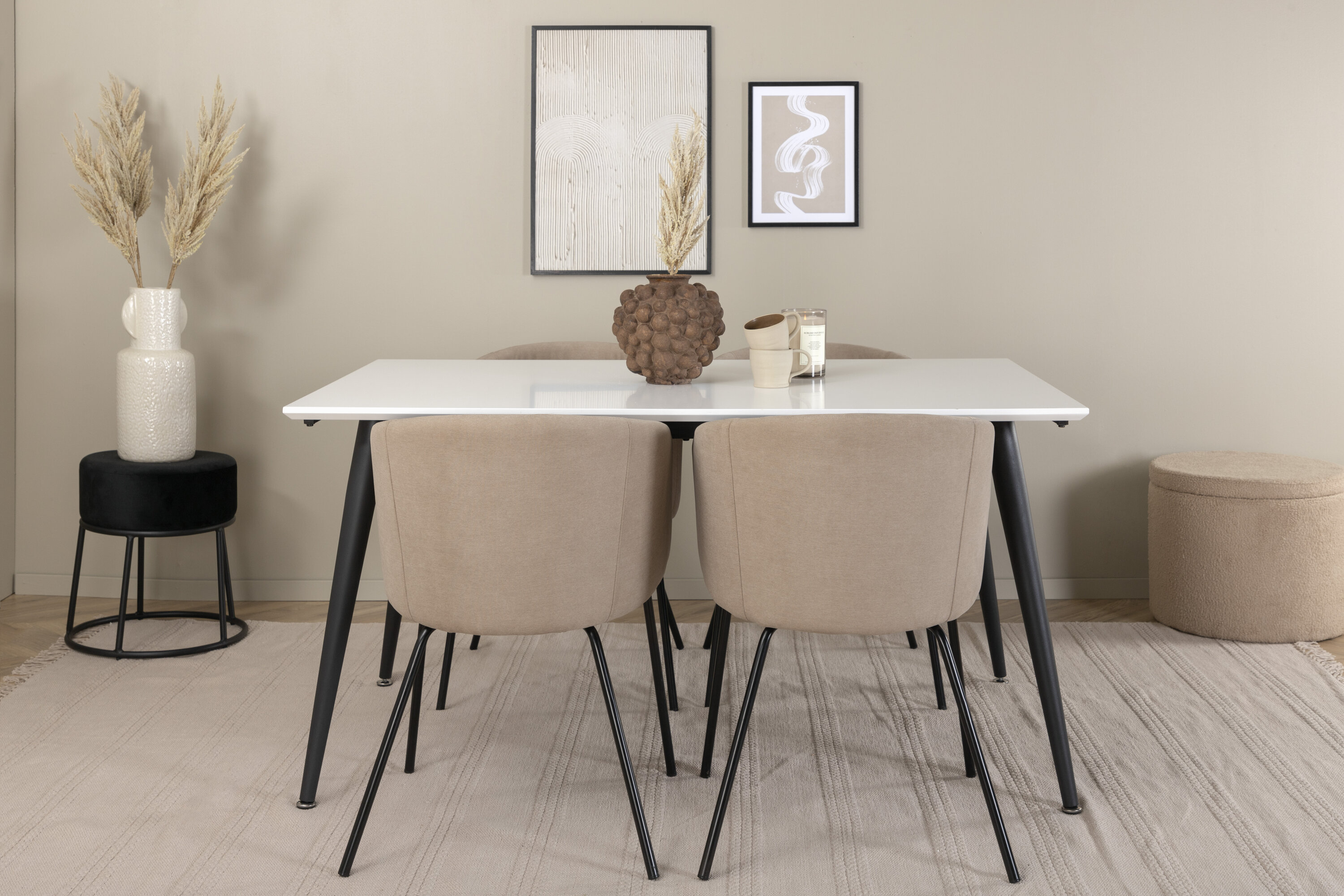 Meie populaarsed luksusliku disainiga söögitoolid Berit pikendavad mõnusaid õhtusöögihetki! Toolil on suur istmesügavus, beežist sametist iste ja stiilne kitsas mustast rauast toolijalg. Tooli mõõdud: kõrgus: 78 cm, istme kõrgus: 49 cm, laius: 55 cm, sügavus: 55 cm. Siin on 6 söögitooli sobitatud klassikalise söögilaua Jimmyga – turvaline kaart igaks juhuks! Valgest HPL- ja MDF-spoonist pikendatava pealisplaadi ning kergelt laienevate mustast metallist jalgadega laud sobib suurepäraselt igasse interjööri ja kodudesse. Laua mõõtmed: Pikkus Pikendatav vahemikus: 150 cm kuni 240 cm, laius: 90 cm, kõrgus: 76 cm.