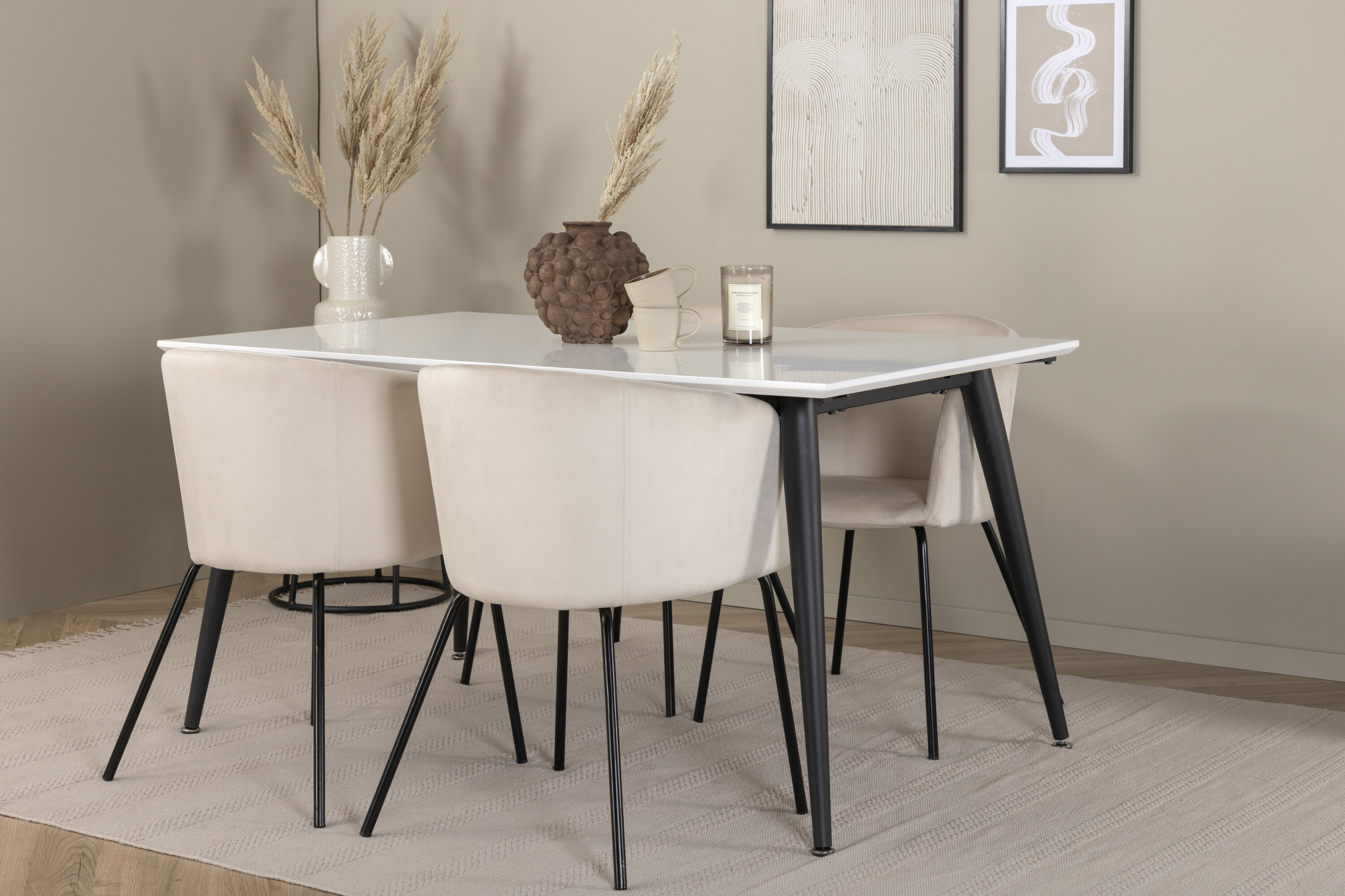 Meie populaarsed luksusliku disainiga söögitoolid Berit pikendavad mõnusaid õhtusöögihetki! Toolil on suur istmesügavus, beežist sametist iste ja stiilne kitsas mustast rauast toolijalg. Tooli mõõdud: kõrgus: 78 cm, istme kõrgus: 49 cm, laius: 55 cm, sügavus: 55 cm. Siin on 4 söögitooli sobitatud klassikalise söögilaua Jimmyga – turvaline kaart igaks juhuks! Valgest HPL- ja MDF-spoonist pikendatava pealisplaadi ning kergelt laienevate mustast metallist jalgadega laud sobib suurepäraselt igasse interjööri ja kodudesse. Laua mõõtmed: Pikkus Pikendatav vahemikus: 150 cm kuni 240 cm, laius: 90 cm, kõrgus: 76 cm.