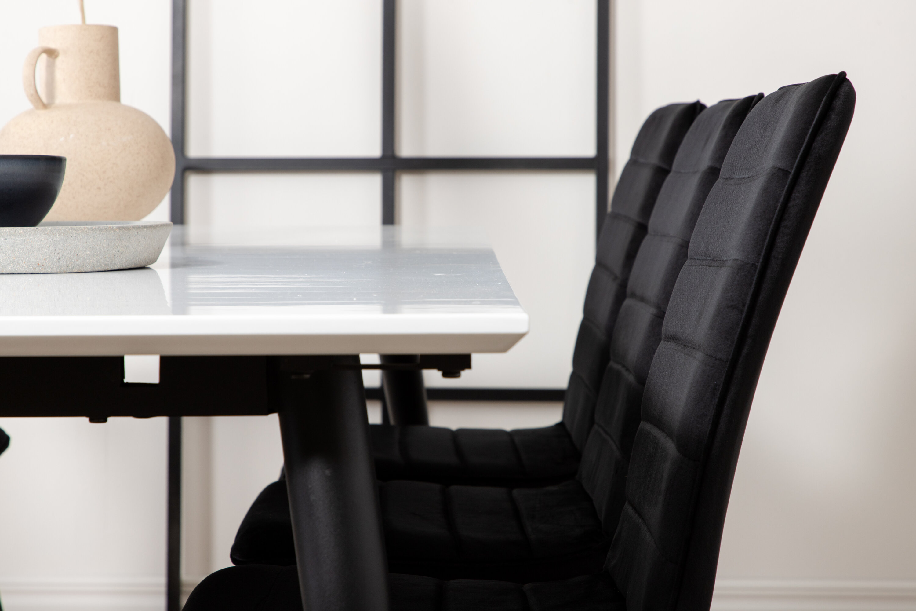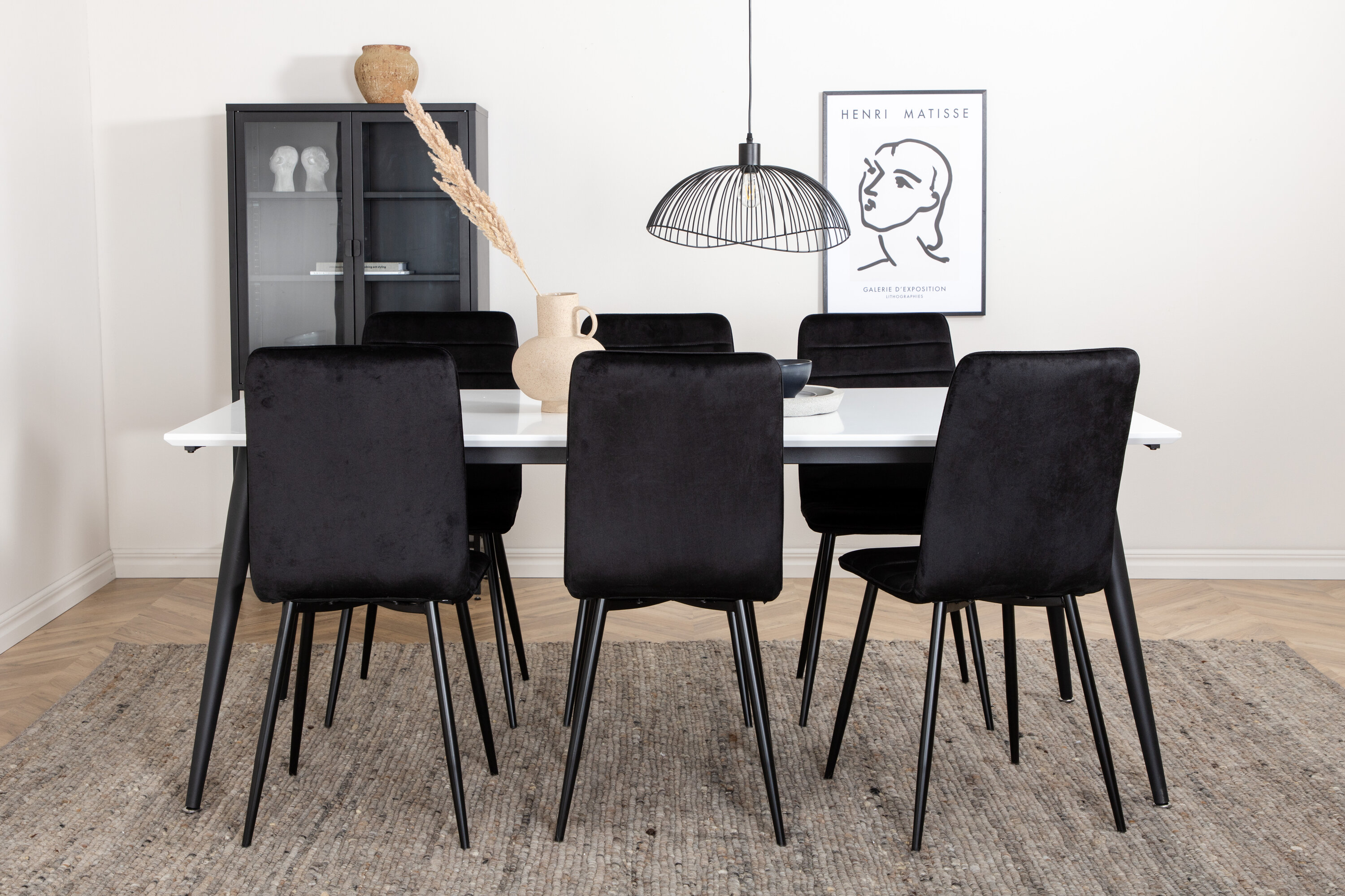 Meie klassikaline ja kaasaegne Skandinaavia disainiga söögilaud Jimmy sarjast, kogu pere saab õhtusöögile ja suhtlemisele. Laud on pikendatav ja sellel on valge HPL- ja MDF-plaadist lauaplaat ning mustad, kergelt laienevad rauast lauajalad. Laua mõõdud: Pikkus Pikendatav vahemikus: 195cm kuni 285cm, laius: 90cm, kõrgus: 76cm. Siin on maitsev kombinatsioon 6 Windu luksuslikust söögitoolist, millel on mustad rauast toolijalad ja mustad pehmest sametkangast istmed. Tooli mõõdud: kõrgus: 94 cm, istme kõrgus: 47 cm, laius: 43 cm, sügavus: 49 cm. Toolide kõrge istumismugavus kutsub teid pikkadele ja imelistele hetkedele suhtlemiseks!