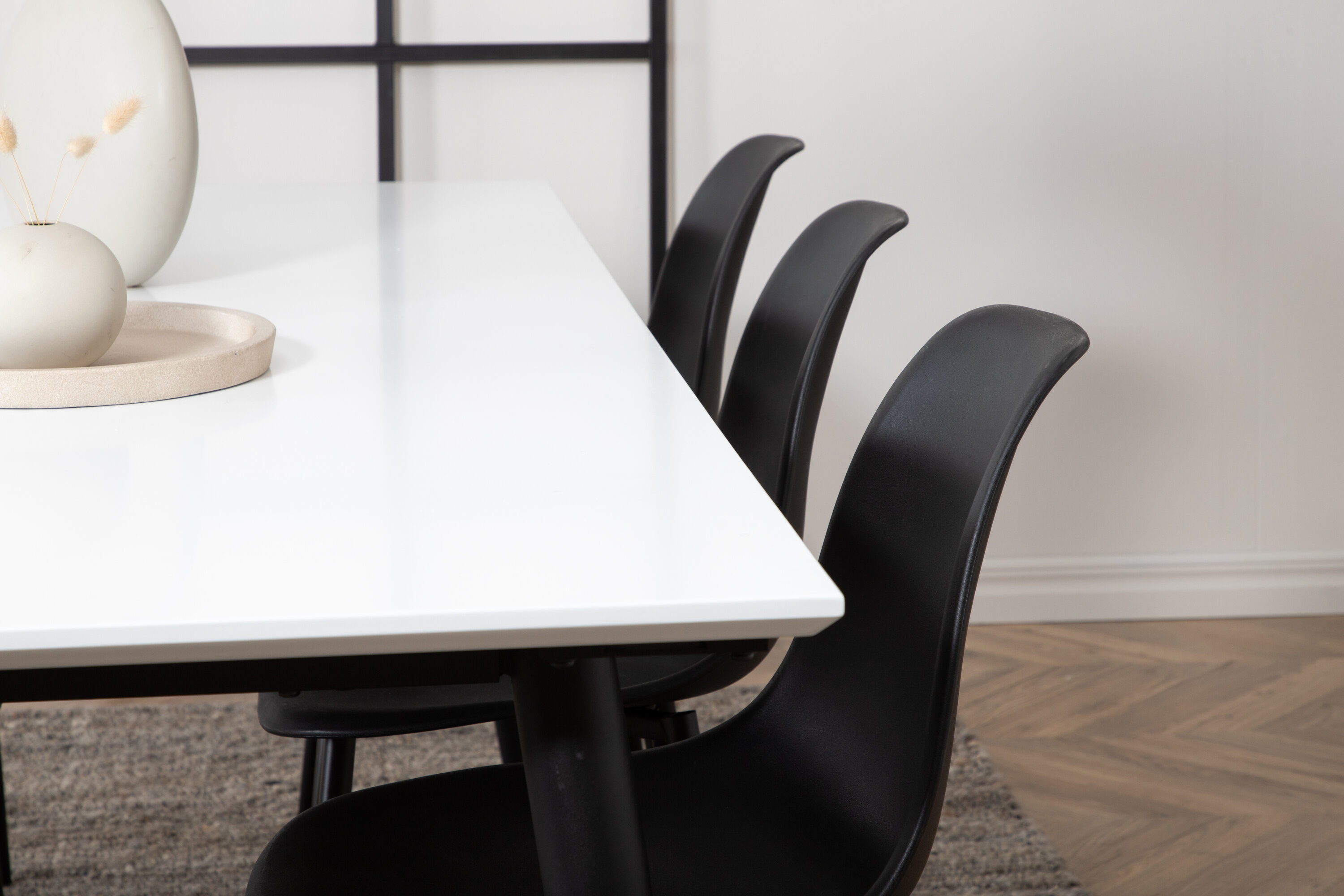 Sisusta elutuba pere toidugrupiga kaasaegse tunnetusega! Söögilaual Jimmy on klassikaline ristkülikukujuline disain sobivates värvides valge ja must. Skandinaavia disainiga laual on valgest HPL-st ja MDF-st lauaplaat ning mustad, kergelt laienevad rauast lauajalad. Laua mõõdud: Pikkus Pikendatav vahemikus: 195cm kuni 285cm, laius: 90cm, kõrgus: 76cm. Siin on laud sobitatud 6 Polari seeria söögitooliga, mis on ühtlaselt musta värvi. Tooli iste on praktilisest plastikust ja tooli jalad rauast. Tooli mõõdud: kõrgus: 81 cm, istme kõrgus: 46 cm, laius: 45,5 cm, sügavus: 58 cm. Laiendage oma õhtusöögikutseid ja upuge koos lähedastega meeldivasse toidugruppi.
