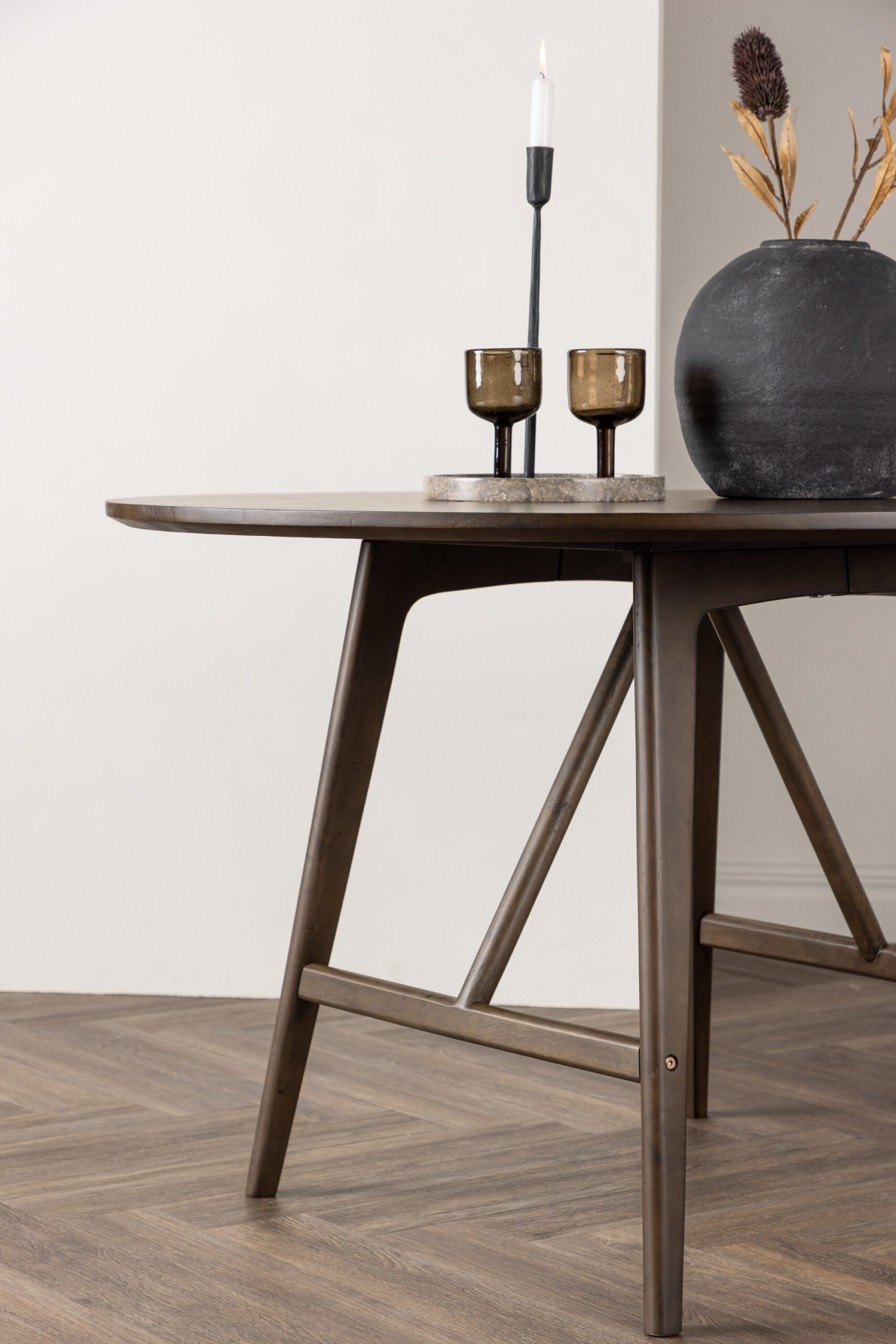 Ümmargune söögilaud sobib suurepäraselt seltskondlike ja kutsuvate hetkede loomiseks igal söögikorral – siin ei satu keegi äärepealt! Kaseidonil on moodne pähklikarva värv, mis sobib kenasti kaasaegse koduga. Ümmargusel lauaplaadil on matt viimistlus ja jalad on kergelt laienenud stabiliseeriva raamiga, mis on ühtlaselt valmistatud MDF-st ja kummipuidust. Sobitage paari mugava söögitooliga ja saate oma koju tervikliku söögigrupi!