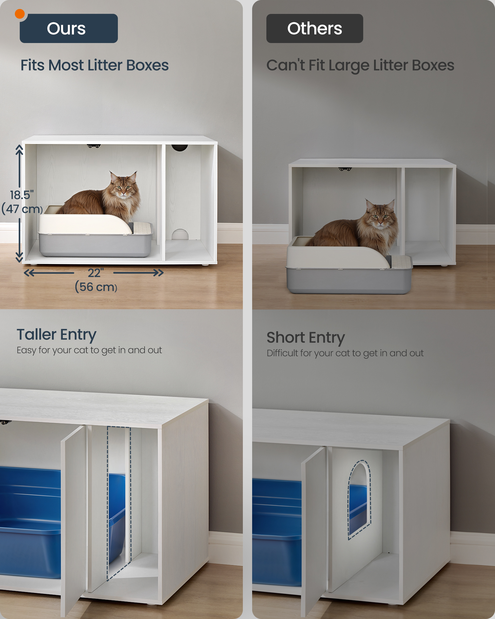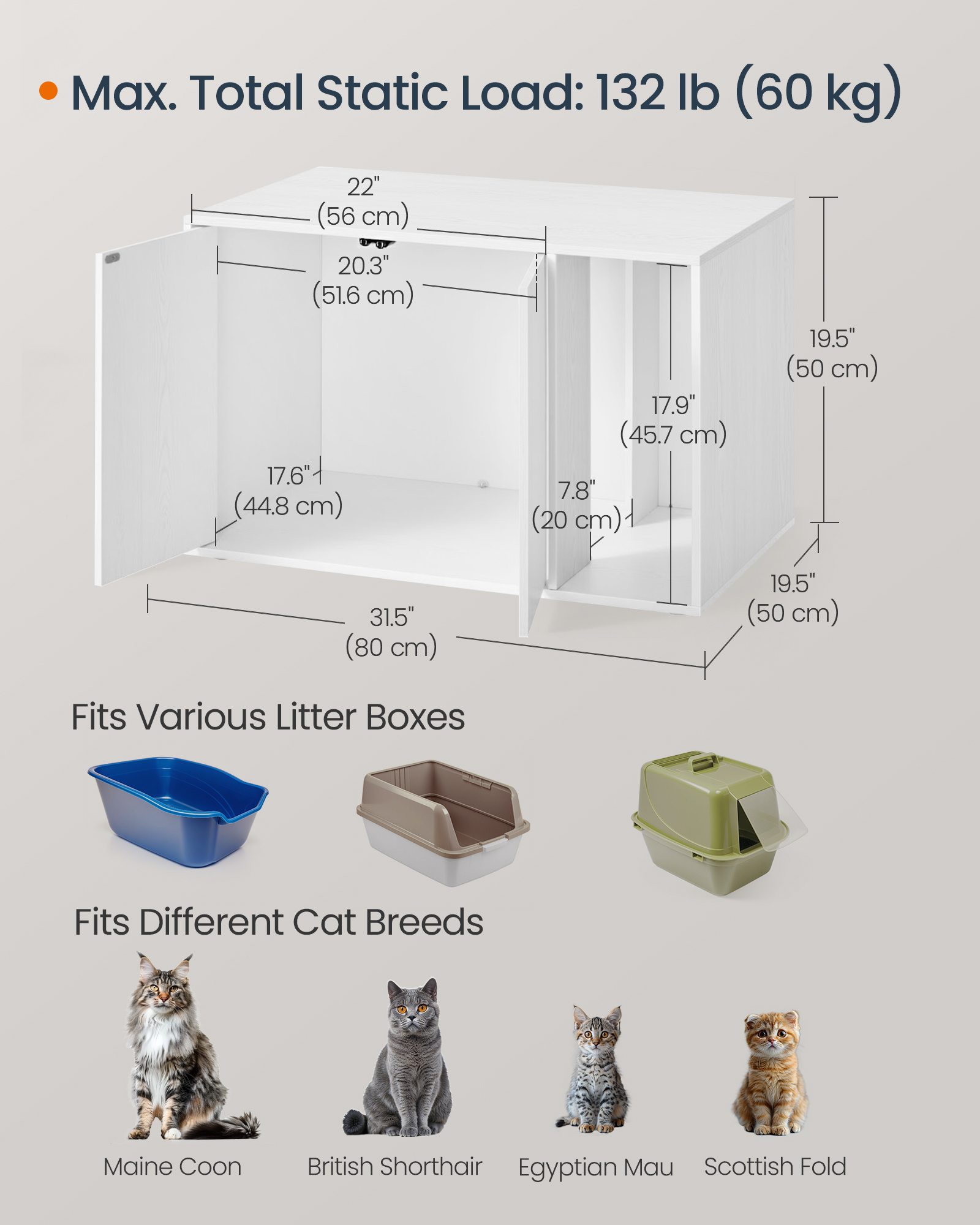 Toote andmed: – Värvus: Lumivalgeke. – Materjal: puitlaastplaat. Üldmõõtmed: 80P x 50L x 50K (cm) – Põhisahtli mõõtmed: 56 x 47 x 47 cm (P x L x K) – Kaal: 17,1 kg. – Maksimaalne koormus: staatiline kogukoormus: 60 kg. Pakend sisaldab: 1 x liivakast, 1 x lisatarvikute komplekt, 1 x kasutusjuhend (inglise keele teksti saatmine pole garanteeritud).