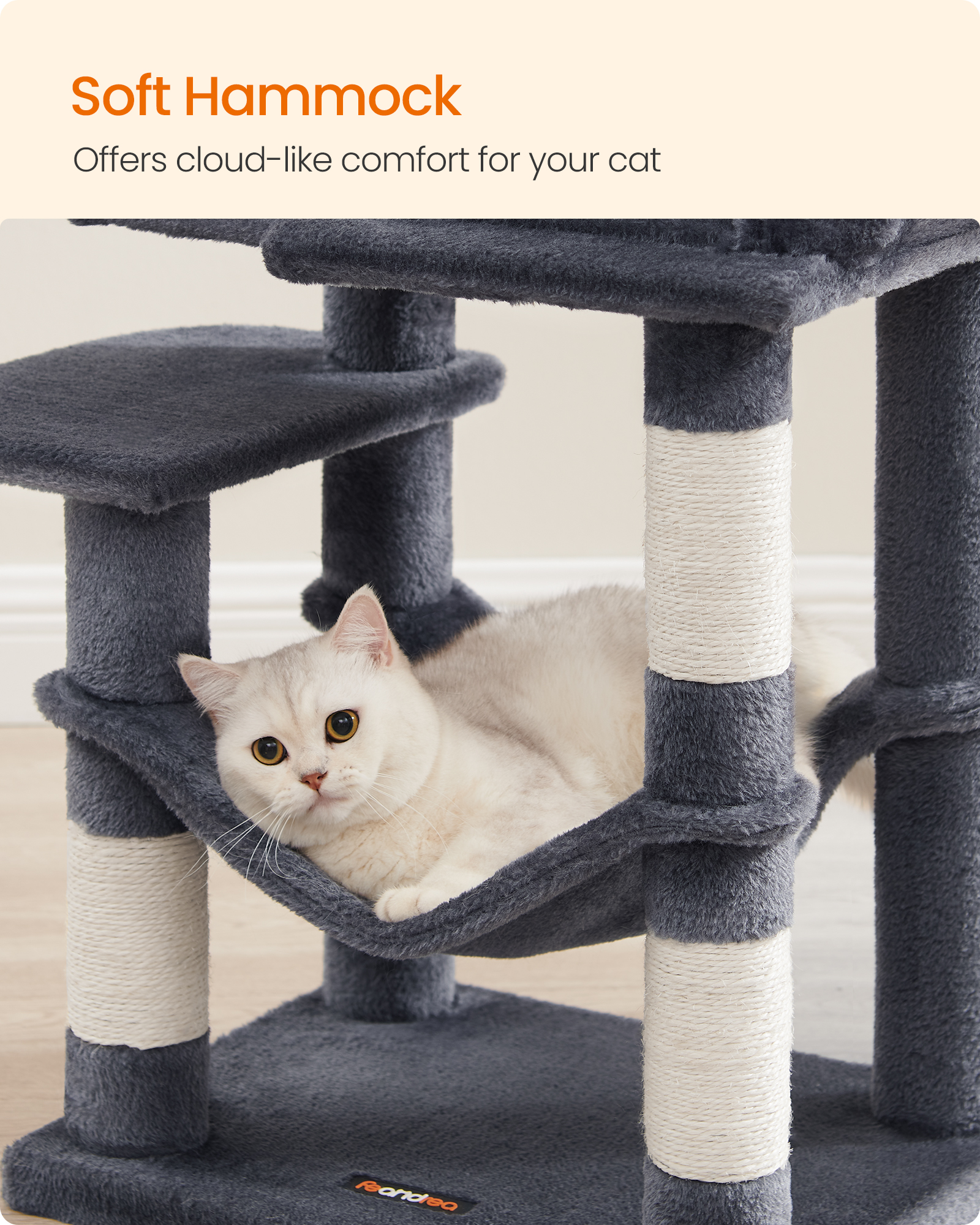 Spetsifikatsioonid: – Värvus: Suitsuhall – Materjal: Puitlaastplaat, plüüs, sisal – Toote mõõdud: 45 x 35 x 112 cm (P x L x K) – Toote kaal: 10 kg – Maksimaalne staatiline kandevõime: 40 kg – Ideaalne kasside arv: Kuni 4 kassi (igaüks ≤ 5 kg) Pakisisu: – 1 x Kassipuu – 1 x Ümberkukkumisvastane komplekt – 1 x Lisatarvikute komplekt – 1 x Kasutusjuhend Feandrea Märkused: – Kui teie karvane sõber hakkab pompomi või kummipaela närima või sööma, eemaldage need ja hoidke neid mõnda aega oma karvase sõbra käeulatusest eemal. – Kui kassi koobas on kriimustatud ja pahatahtlike käppade poolt kahjustatud, parandage või vahetage see enne edasist kasutamist, et vältida oma karvase sõbra vigastamise ohtu. – Kuna kassid armastavad hüpata ja mängida, kinnitage kassitorn ohutuks kasutamiseks seinale kaasasoleva ümberkukkumisvastase komplektiga.