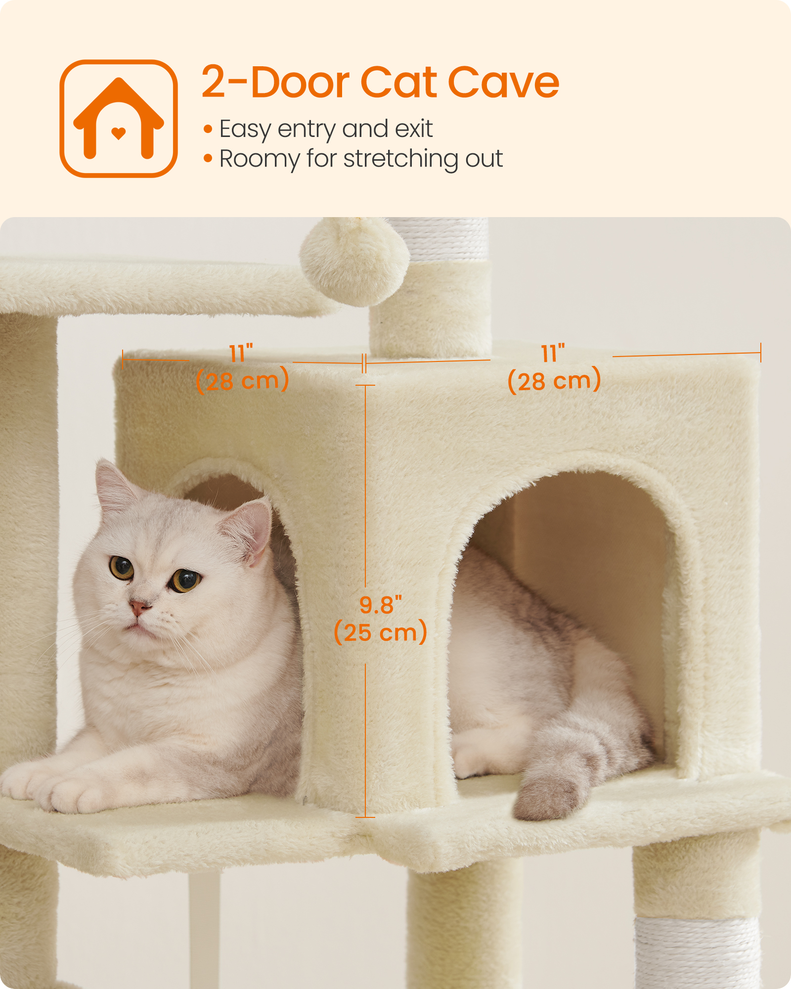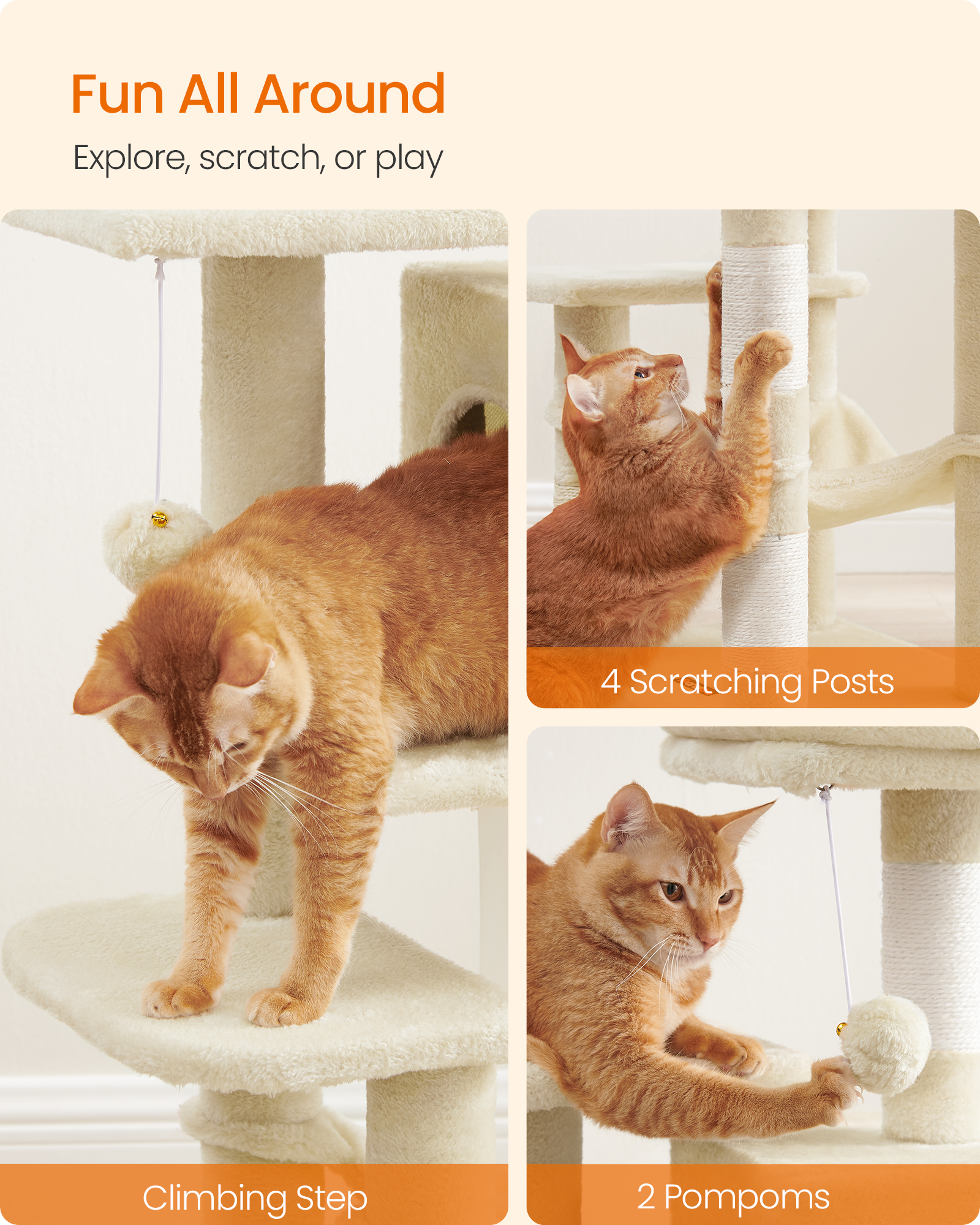 Spetsifikatsioonid: – Värvus: beež – Materjal: puitlaastplaat, plüüs, sisal – Toote mõõdud: 45 x 35 x 112 cm – Toote kaal: 8,8 kg – Maksimaalne staatiline kandevõime: 40 kg – Ideaalne kasside arv: kuni 4 kassi, igaüks ≤ 5 kg Pakisisu: – 1 x kassipuu – 1 x ümberkukkumisvastane komplekt – 1 x lisatarvikute komplekt – 1 x juhend Feandrea Märkused: – Kui teie karvane sõber hakkab pompomi või kummipaela närima või sööma, eemaldage need ja hoidke neid mõnda aega oma karvase sõbra käeulatusest eemal. – Kui kassi koobas on kriimustatud ja pahatahtlike käppade poolt kahjustatud, parandage või vahetage see enne edasist kasutamist, et vältida oma karvase sõbra vigastamise ohtu. – Kuna kassid armastavad hüpata ja mängida, kinnitage kassitorn ohutuks kasutamiseks seinale kaasasoleva ümberkukkumisvastase komplektiga.