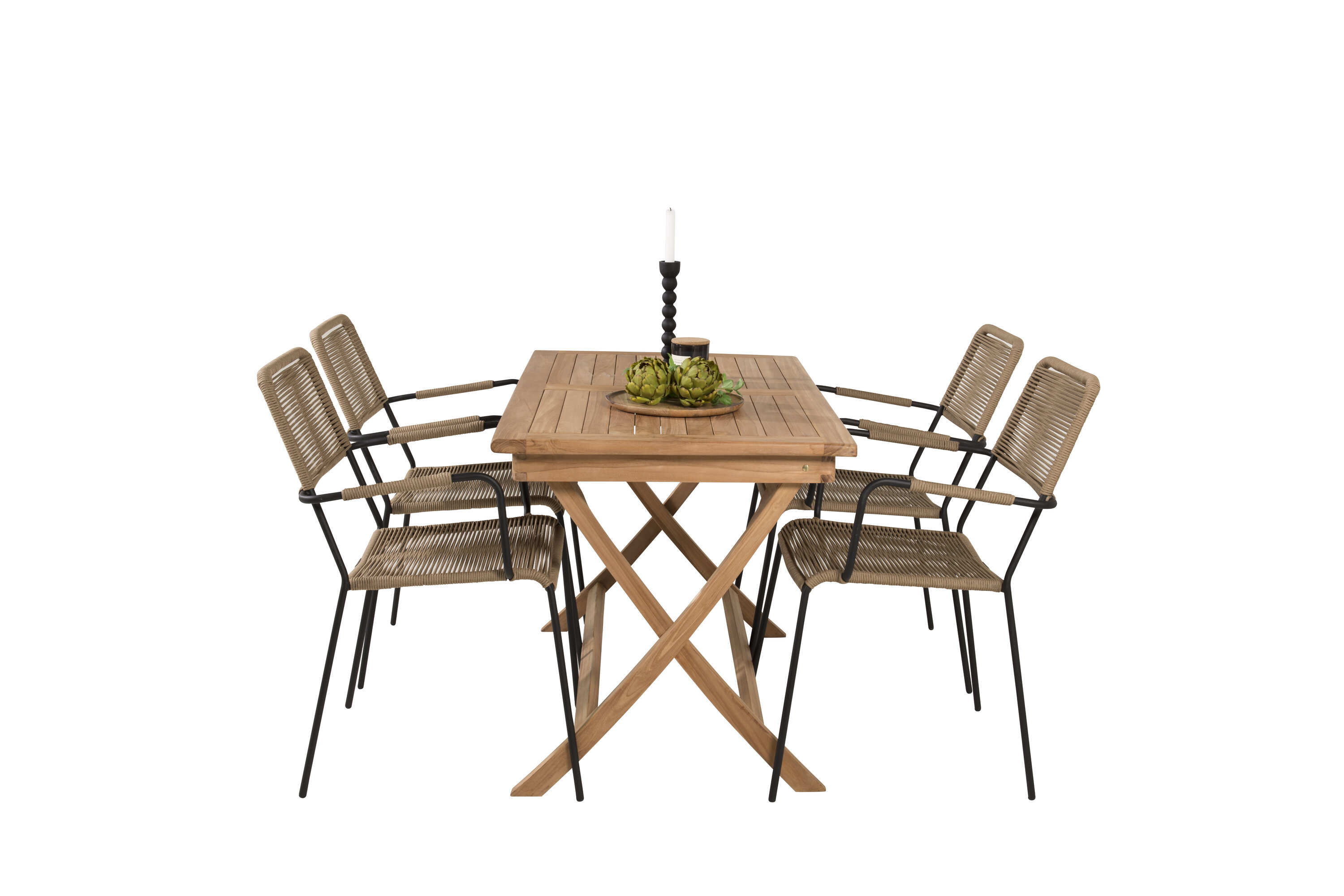 Sisusta siseõu maalähedastes toonides Skandinaavia disainiga toidugrupiga! Meie populaarsel ristkülikukujulisel söögilaual Kenya on ajatu disain ja maitsekas tiikpuust soonik. Ristjalad jätavad ühtlase ja võluva mulje. Mõõdud: 120×70 cm. Siin sihvakas kombinatsioonis Lindose sarja maitsvate söögitoolidega. Toolidel on integreeritud mustast terasest käetoed ja vastupidavast lattevärvi köiest iste. Sisusta terrassil kutsuvalt ja loo pilkupüüdja, mis avaldab muljet!