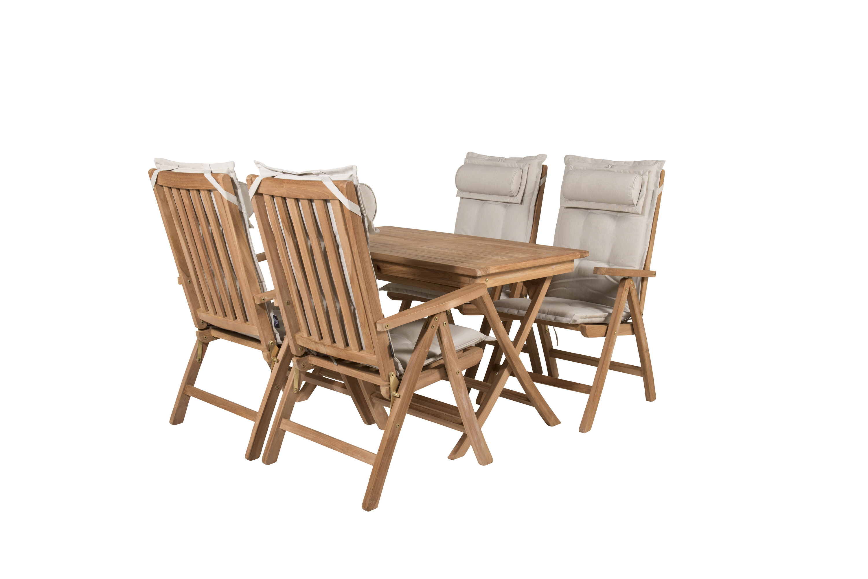 Sisusta siseõu maalähedastes toonides Skandinaavia disainiga toidugrupiga! Meie populaarsel ristkülikukujulisel söögilaual Kenya on ajatu disain ja maitsekas tiikpuust soonik. Ristjalad jätavad ühtlase ja võluva mulje. Mõõdud: 120×70 cm. Siin sihvakas kombinatsioonis 4 samast sarjast maitsva söögitooliga. Toolid on optimaalseks lõõgastumiseks kokkuklapitavad ja täiendava mugavuse tagamiseks on käetoed. Sisustage terrass kutsuvalt ja looge pilkupüüdja, mis avaldab muljet!