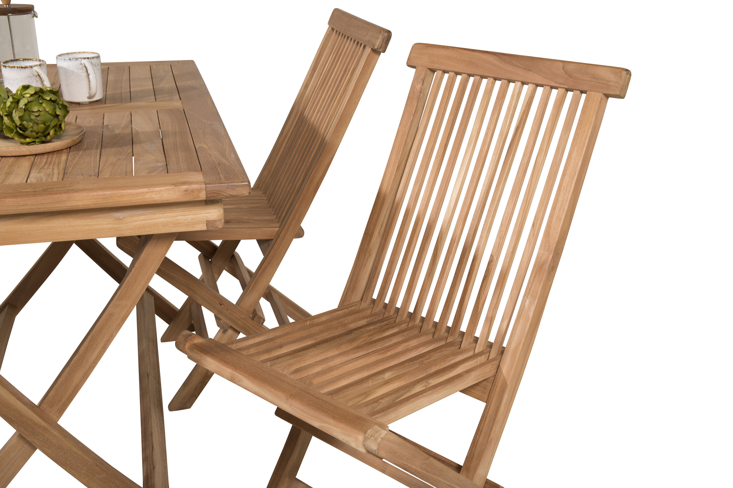 Skandinaavia disainis trendikindel toidugrupp! Meie populaarsel ristkülikukujulisel söögilaual Kenya on ajatu disain ja maitsekas tiikpuust soonik. Ristjalad jätavad ühtlase ja võluva mulje. Mõõdud: 120×70 cm. Siin sihvakas kombinatsioonis 4 samast sarjast maitsva söögitooliga. Toolid on samuti tiikpuust ja praktiliseks hoiustamiseks kokkupandavad. Sisustage terrass kutsuvalt ja looge pilkupüüdja, mis avaldab muljet!