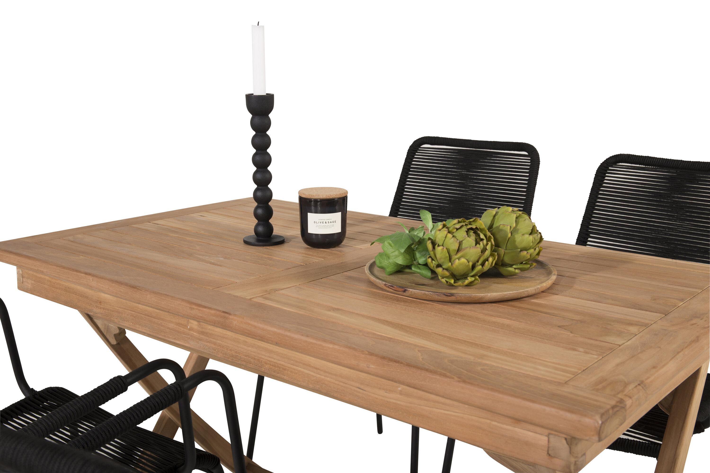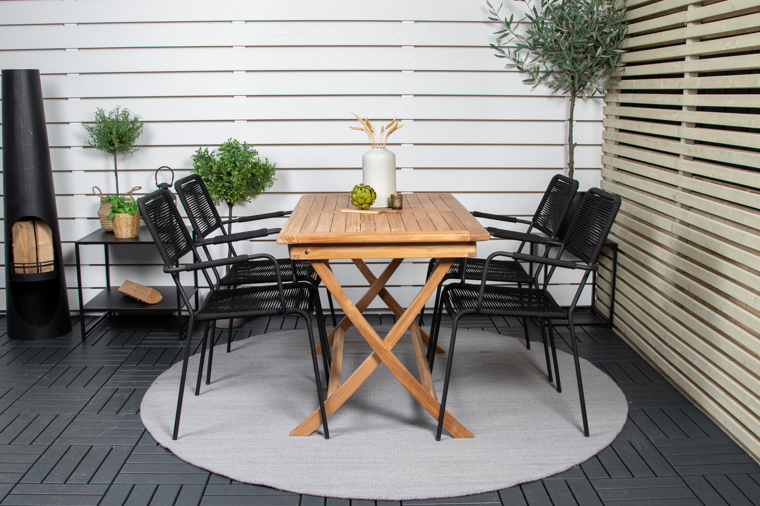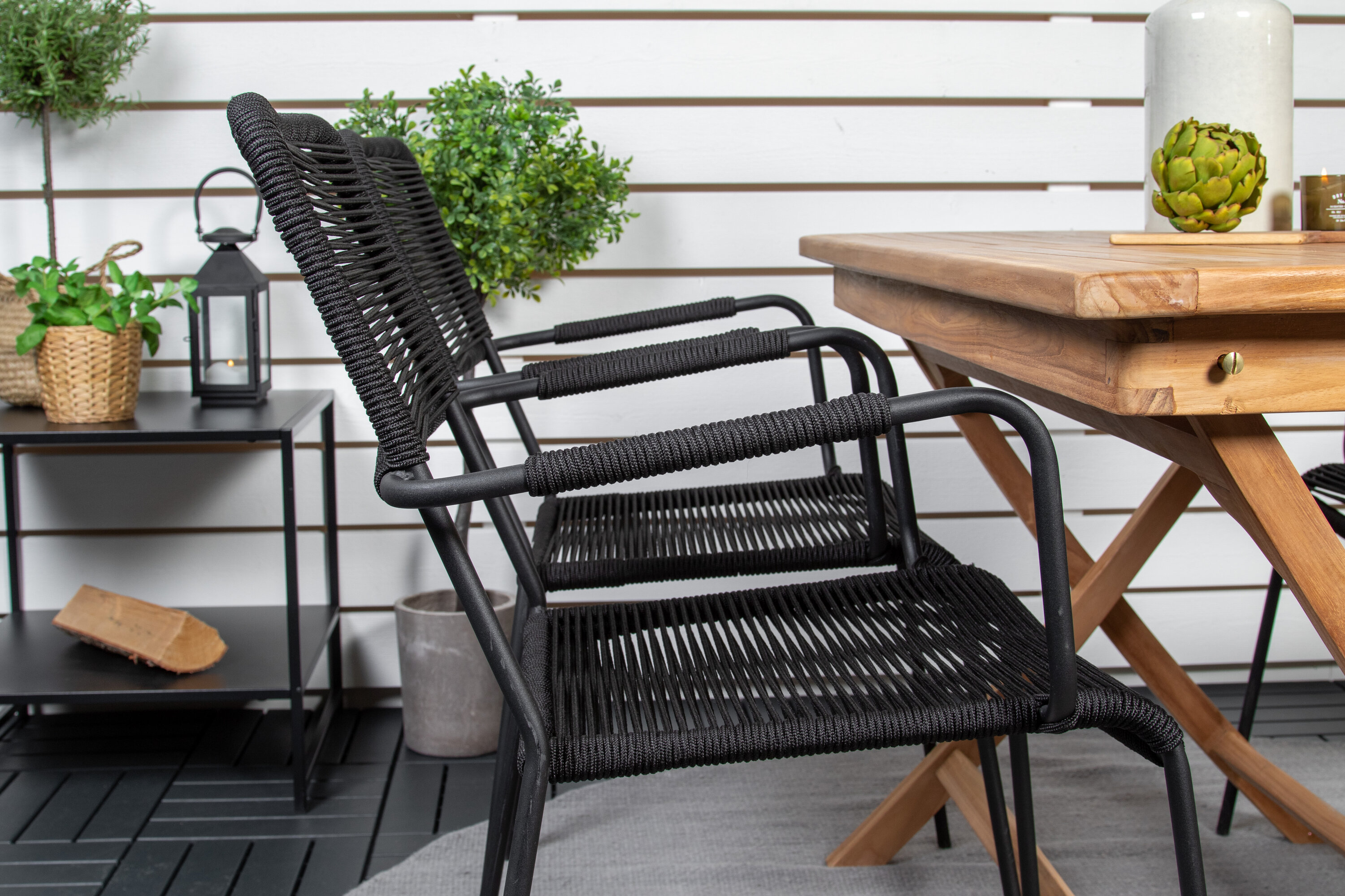 Stiilne, trendikindel ja mugav Skandinaavia disainiga söögigrupp! Meie populaarsel ristkülikukujulisel söögilaual Kenya on ajatu disain ja maitsekas tiikpuust soonik. Ristjalad jätavad ühtlase ja võluva mulje. Mõõdud: 120×70 cm. Siin sihvakas kombinatsioonis Lindose sarja maitsvate söögitoolidega. Toolidel on integreeritud mustast terasest käetoed ja vastupidavast mustast köiest iste. Sisusta terrassil kutsuvalt ja loo pilkupüüdja, mis avaldab muljet!