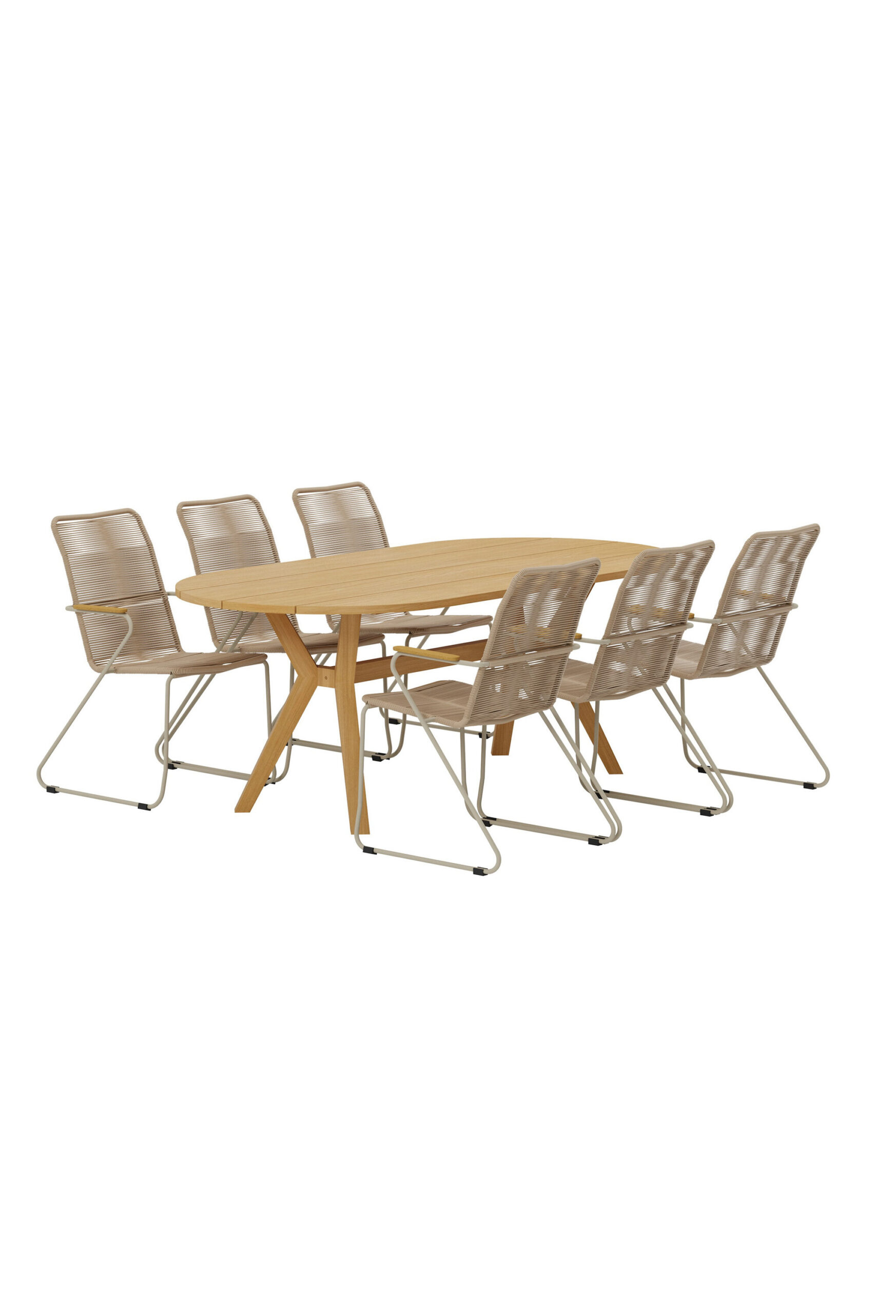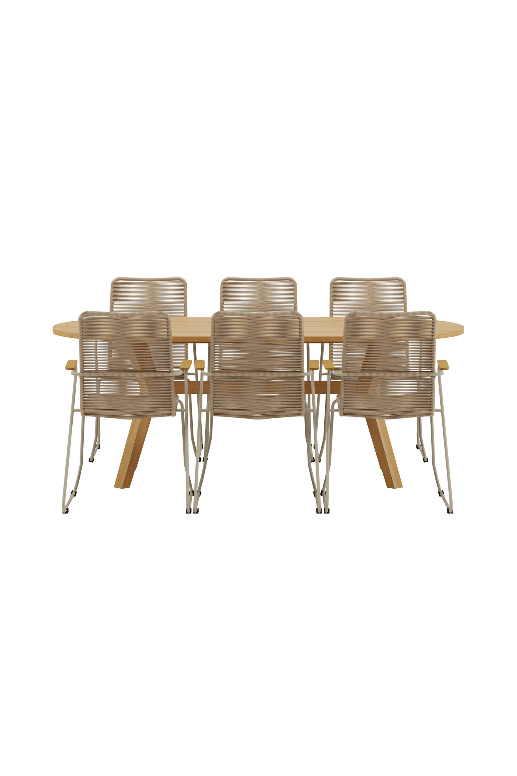 Looge kutsuv ja stiilne söögituba selle elegantse söögikomplektiga, mis ühendab Boisi söögitoolid kauni Kenya söögilauaga. Bois toolid on kaasaegse ja maitseka disainiga terasraami, vastupidavast köiest istme ja seljatoega ning akaatsiapuust käetugedega, mis lisavad sooja ja loomuliku tunde. Maalähedane beež toon sulandub harmooniliselt erinevatesse väliskeskkondadesse ning õrnalt õõtsuv konstruktsioon tagab mugava istumiskogemuse – ideaalne pikkadeks meeldivateks hetkedeks laua taga. Sobiv Kenya söögilaud avaldab muljet oma ajatu kuju ja kauni tiikpuupinnaga, mis loob sooja ja koduse atmosfääri. Pehmed ümarad servad ja tugevad jalad muudavad laua loomulikuks kogunemiskohaks nii igapäevaseks õhtusöögiks kui ka pidulikuks sündmuseks.