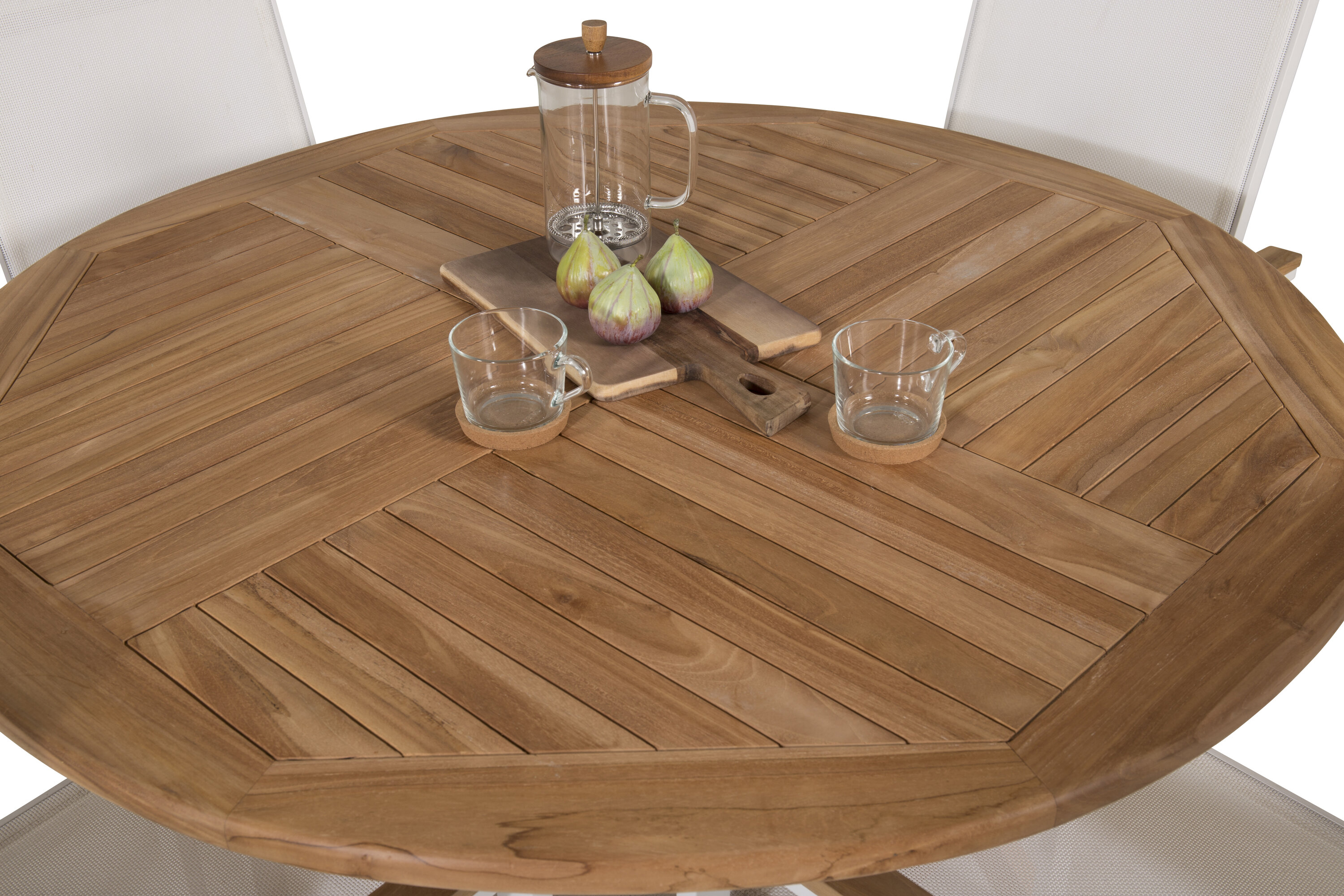 Loo terrassil võluv atmosfäär pere toidugrupiga! Meie ümmargune Kenya söögilaud tagab, et keegi ei satuks äärepealt, ja avaldab muljet oma maitseka skandinaavialiku disainiga. Laud on valmistatud ilusast materjalist tiikpuust ja sellel on soonikkoes variant. Mõõdud: 120ø. Siin koos 4 Skandinaavia disainiga söögitooli Texase sarjast. Valmistatud valgest alumiiniumist, iste tekstiilist ja käetoed dekoratiivsest tiikpuust, mis on kena detail. Tool on ladusaks hoiustamiseks virnastatav. Siin istute kaua ja naudite suveõhtuid!