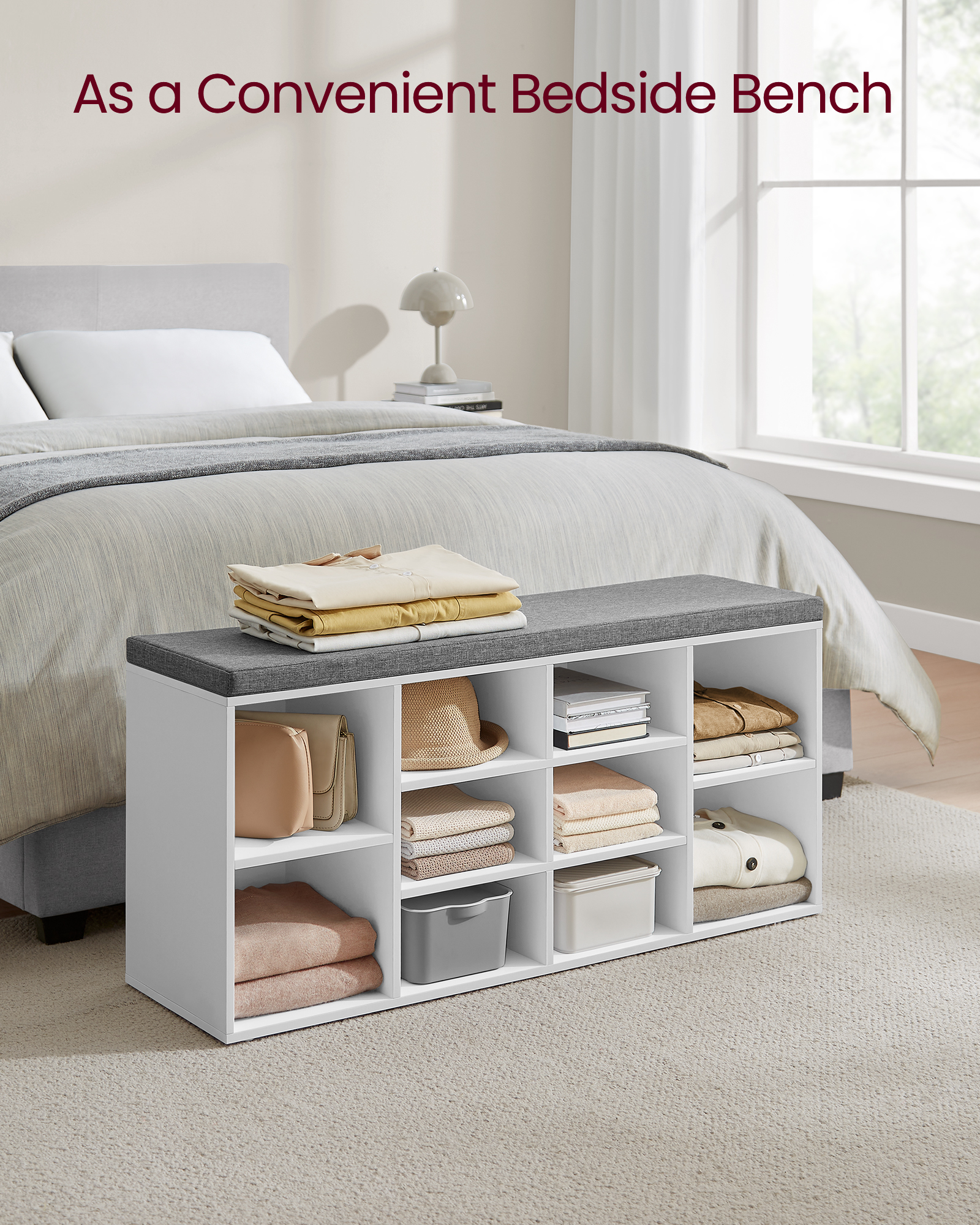 Spetsifikatsioonid: Värvus: Valge Raami materjal: E1-klassi puitlaastplaat Padja polster: Vaht Kate: Linase välimusega kangas Toote mõõdud: 104 x 30 x 48 cm (P x L x K) Toote kaal: 20,8 kg Maksimaalne staatiline kandevõime: 150 kg Pakisisu: 1 x jalanõude hoiupink 1 x tarvikute komplekt 1 x juhend (EN, FR, DE, ES, IT)