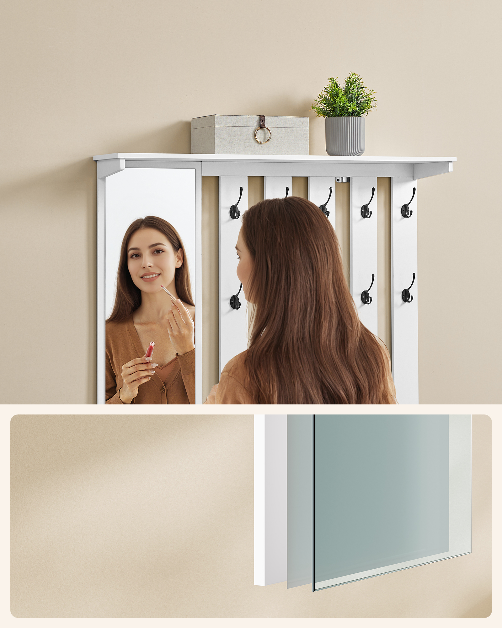 Toote üksikasjad: – Värvus: Pilvevalge – Materjal: Puitlaastplaat, peegel, vaht, metall, linaimitatsioon – Jalanõupingi mõõtmed: 35,5 x 101 x 52,5 cm (S x L x K) – Seinale kinnitatava riidepuu mõõtmed: 20 x 102 x 80 cm (S x L x K) – Peegli mõõtmed: 75 x 26 cm (P x L) – Kogukaal: 26,9 kg – Jalanõupingi istme maksimaalne staatiline kandevõime: 136 kg – Jalanõupingi riiuli maksimaalne staatiline kandevõime: 5 kg – Konksu maksimaalne staatiline kandevõime: 3 kg – Riidepuu pealse maksimaalne staatiline kandevõime: 10 kg – Riidepuu kogu maksimaalne staatiline kandevõime: 40 kg Pakisisu: – 1 x Seinale kinnitatav riidepuu kingapingi ja -pingiga – 1 x Lisatarvikute komplekt – 1 x Kasutusjuhend