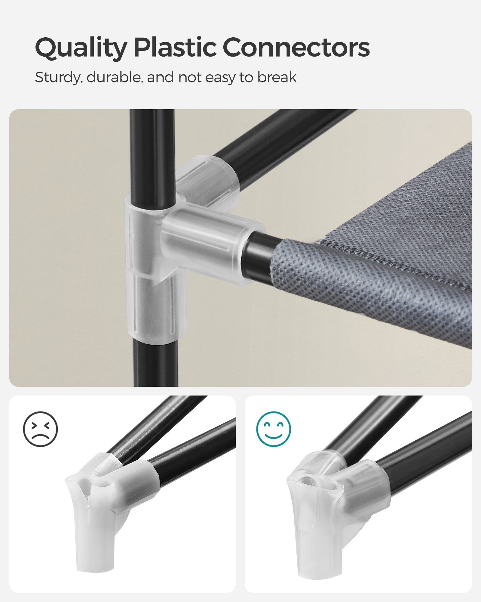 Spetsifikatsioonid: – Värvus: hall – Materjal: metalltoru, 75 g/m² lausriie, PP-plastist ühendusdetail – Toote mõõdud: 88x28x160cm (S x L x K) – Riiulite vaheline kaugus: 17,3 cm – Toote kaal: 2,7 kg – Maksimaalne staatiline kandevõime astme kohta: 3 kg – Maksimaalne staatiline kandevõime kokku: 27 kg Pakisisu: – 1 x kingariiul – 1 x juhend SONGMICS Märkused: – Iga riiul toetab kuni 3 kg, palun ärge seda üle koormake. – Ärge jätke kingikorraldajat otsese päikesevalguse kätte.