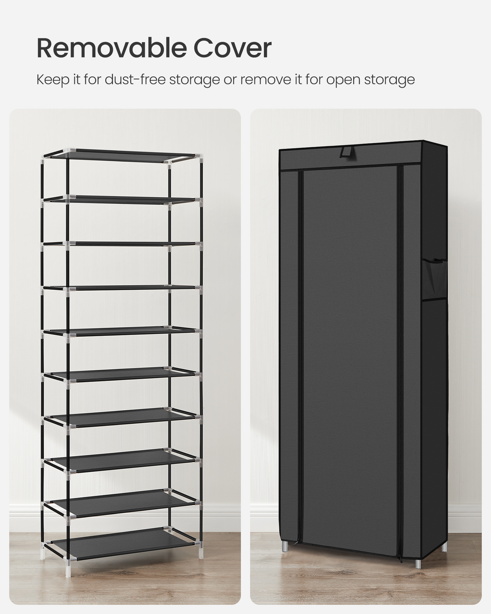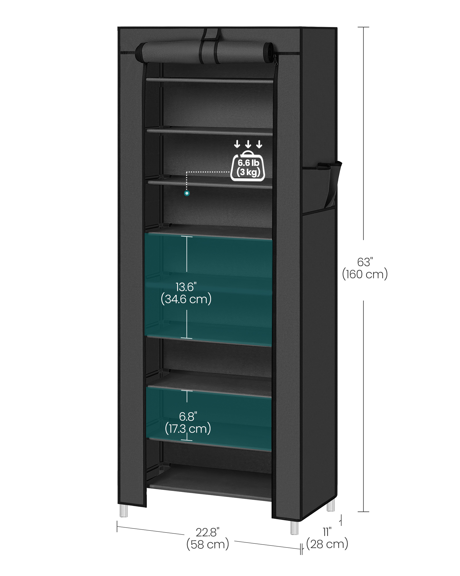 Spetsifikatsioonid: – Värv: Must – Materjal: 75 g/m² lausriie, terastoru – Toote mõõdud: 58 x 28 x 160 cm (P x L x K) – Tasandite vaheline kõrgus: 17 cm – Toote kaal: 2,4 kg Pakisisu: – 1 x kingariiul