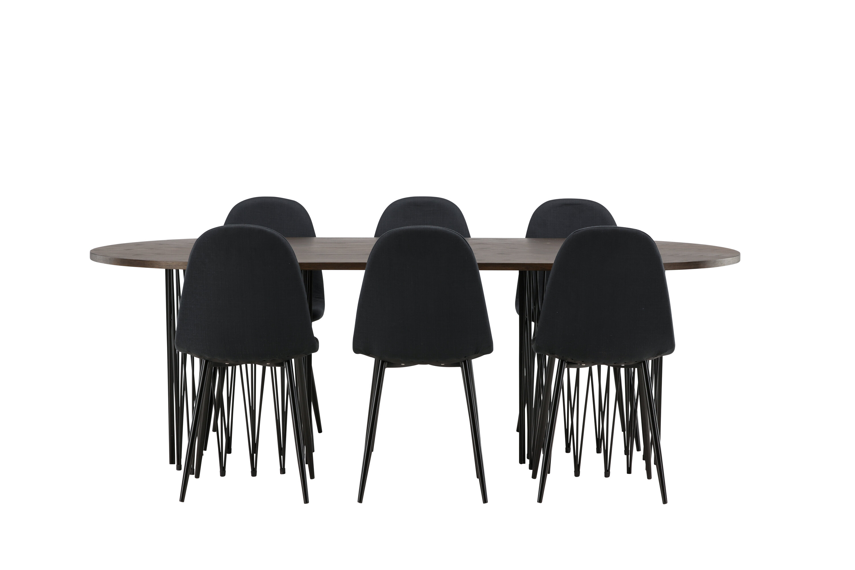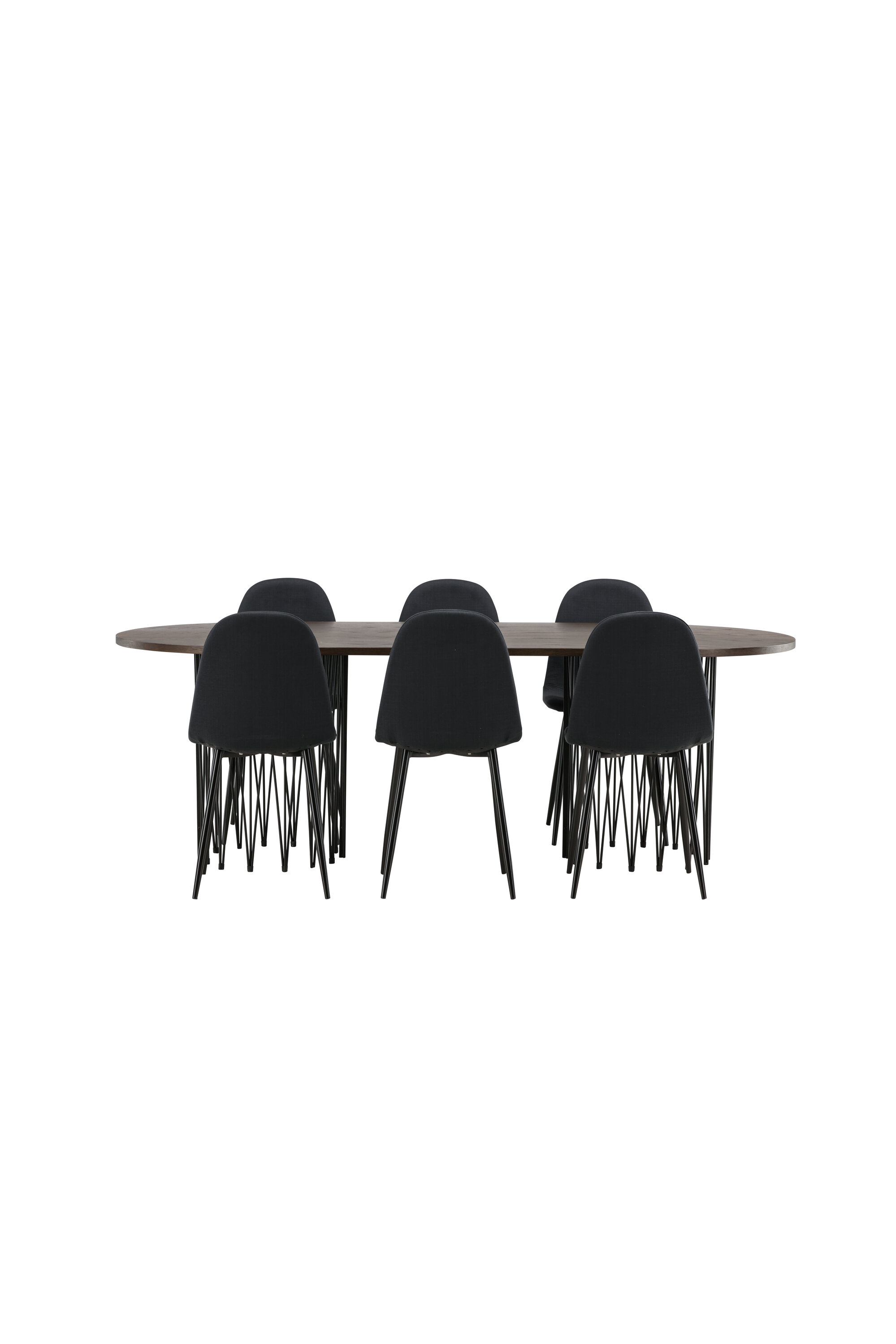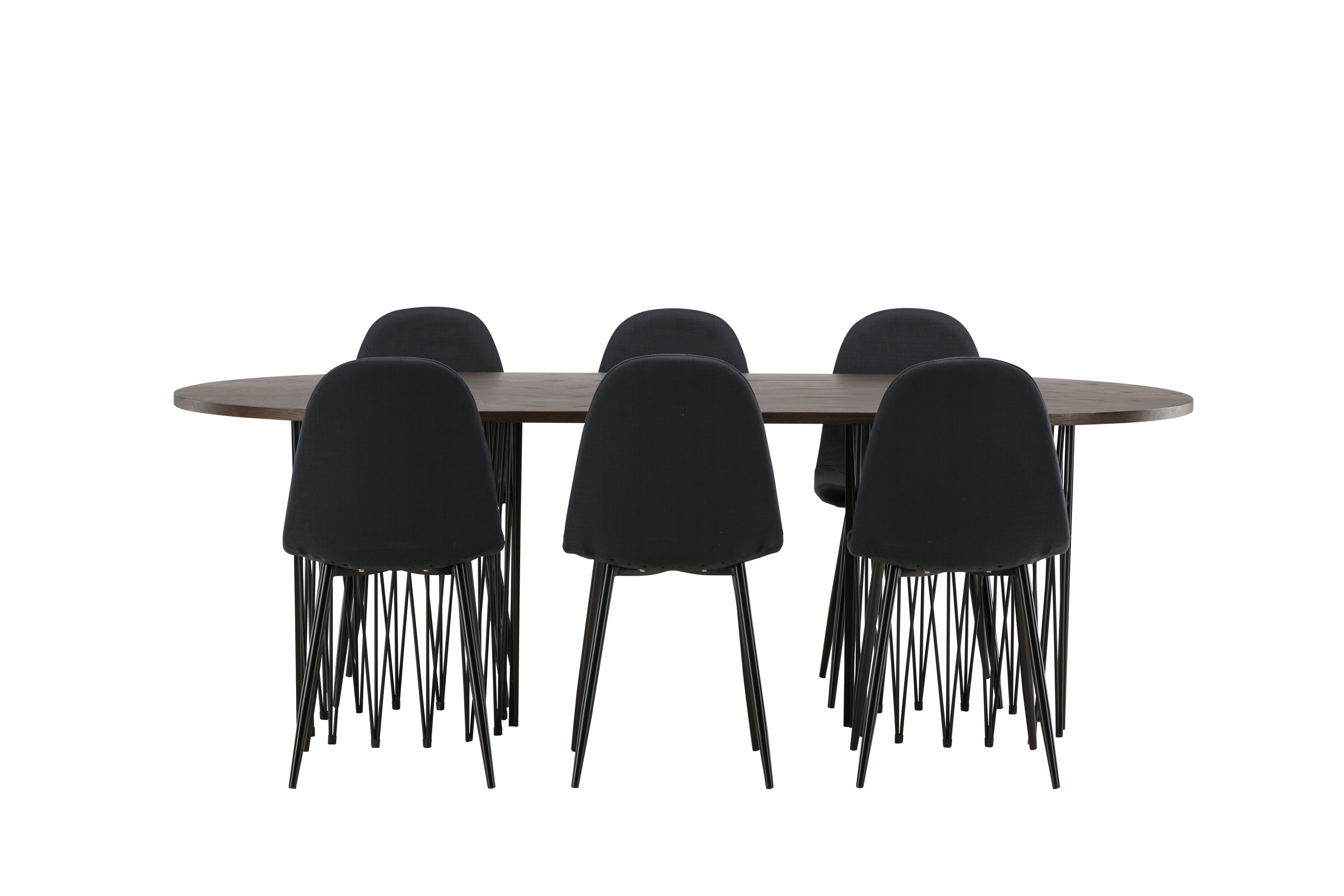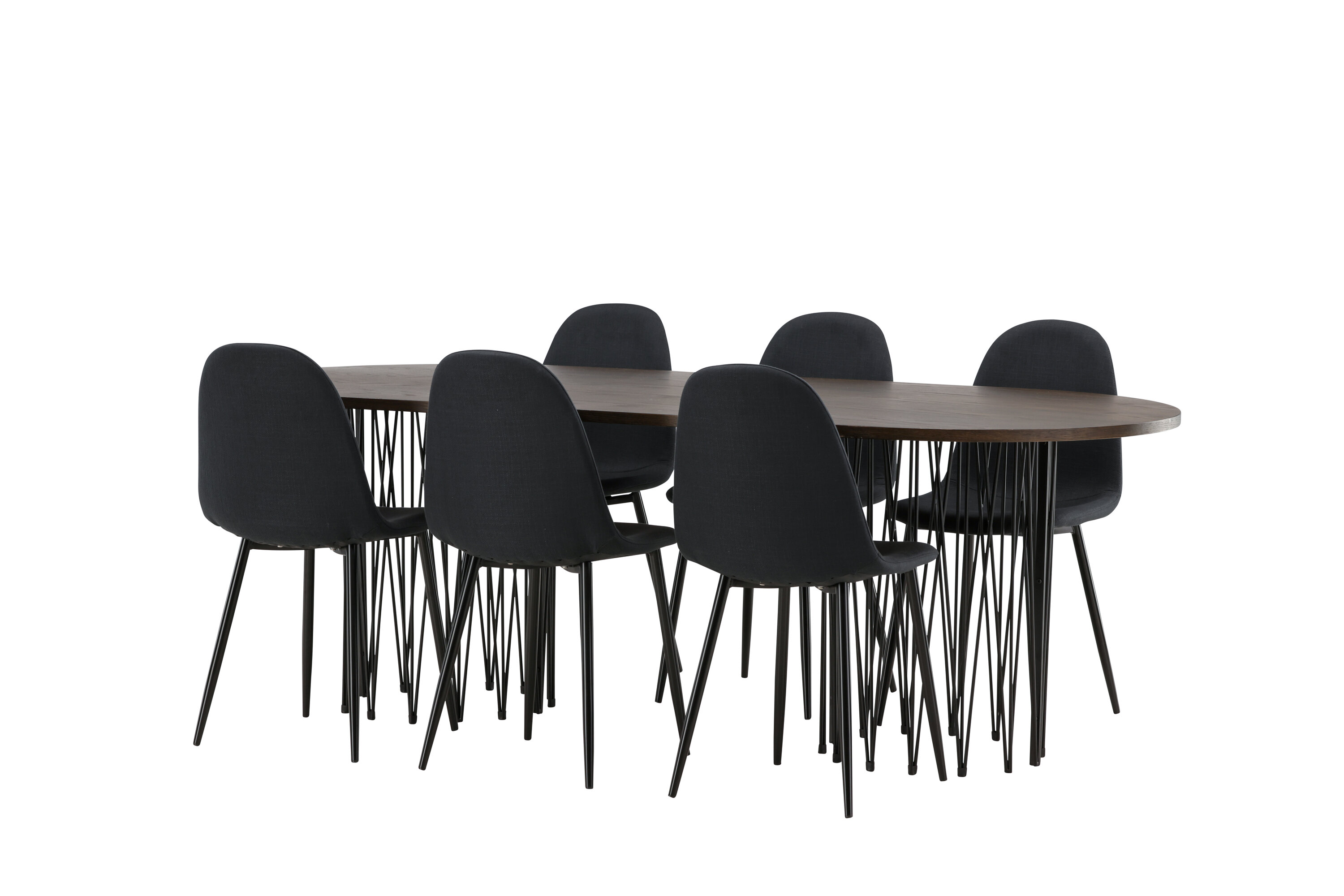 See söögigrupp on nii stiilne kui ka praktiline! Meie ovaalne söögilaud Stone on armsa Skandinaavia disainiga. Laual on ilus pruuni värvi spooniga MDF lauaplaat ja kaks dekoratiivset silindrikujulist mustast metallist raami. Siin koos meie mugavate Polari seeria söögitoolidega. Toolil on täielikult polsterdatud disain, ümardatud seljatugi ja iste pehme polstriga mustast polüesterkangast ning jalad on mustast pulbervärvitud metallist. Vältige kompromisse mugavuse ja stiilse disaini vahel!