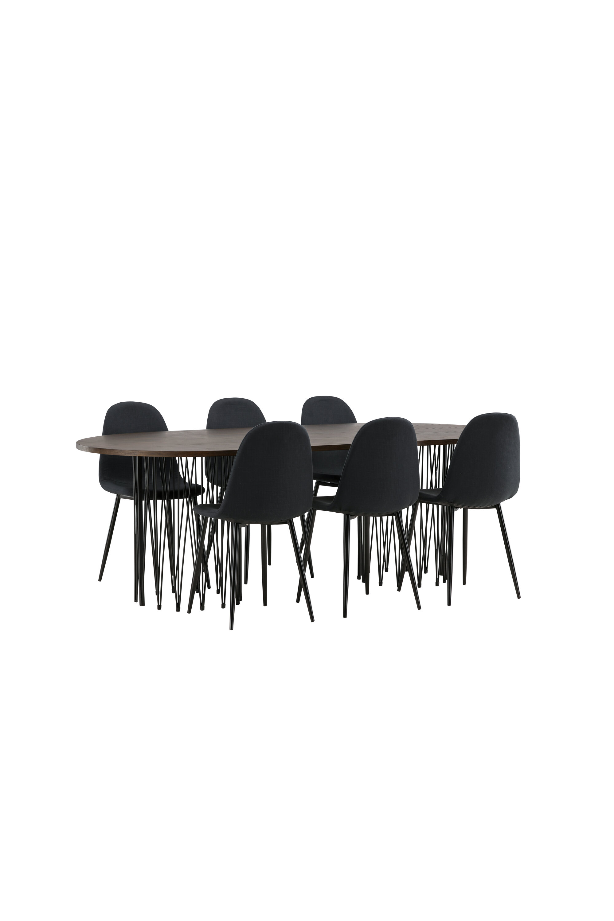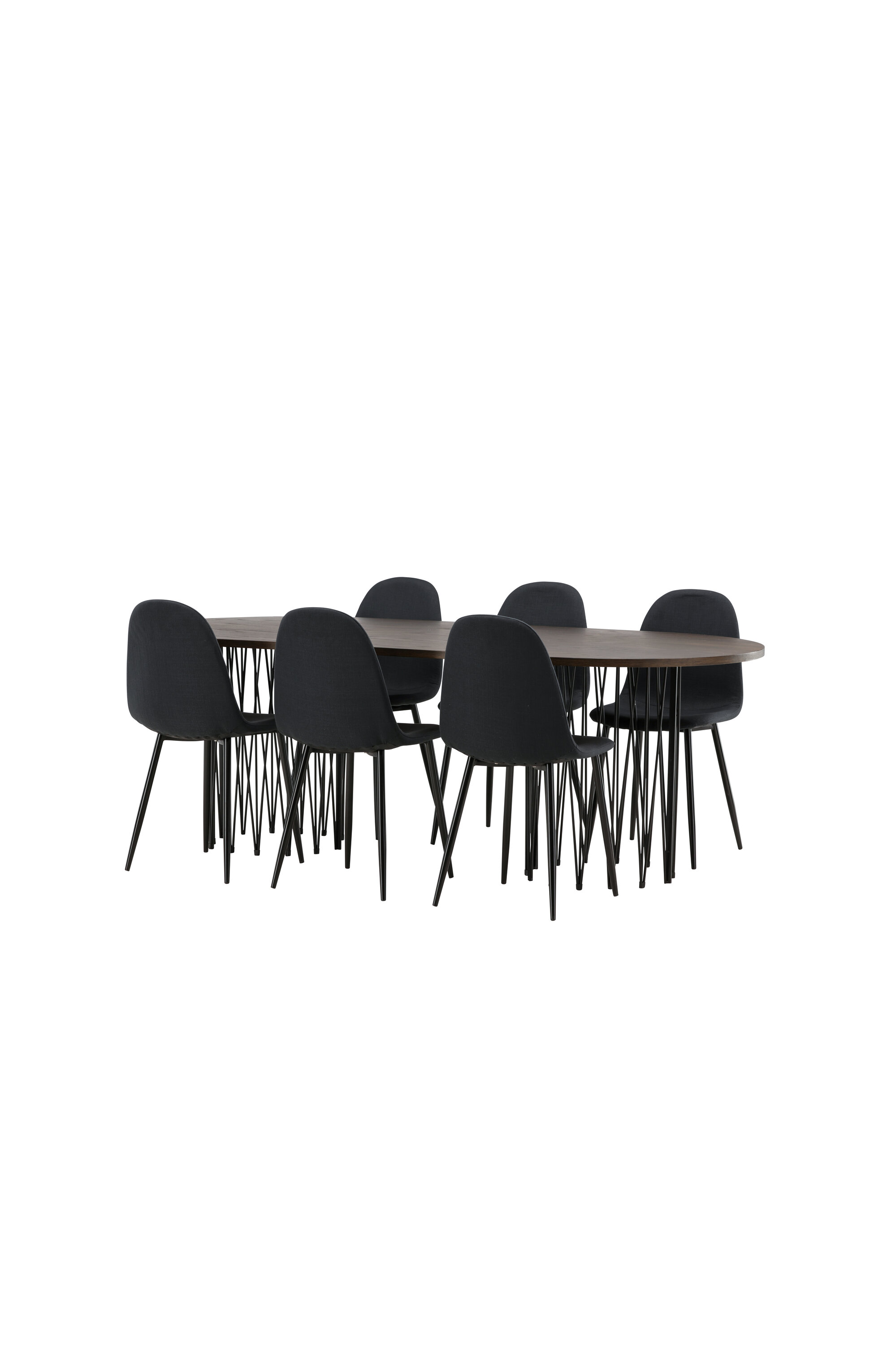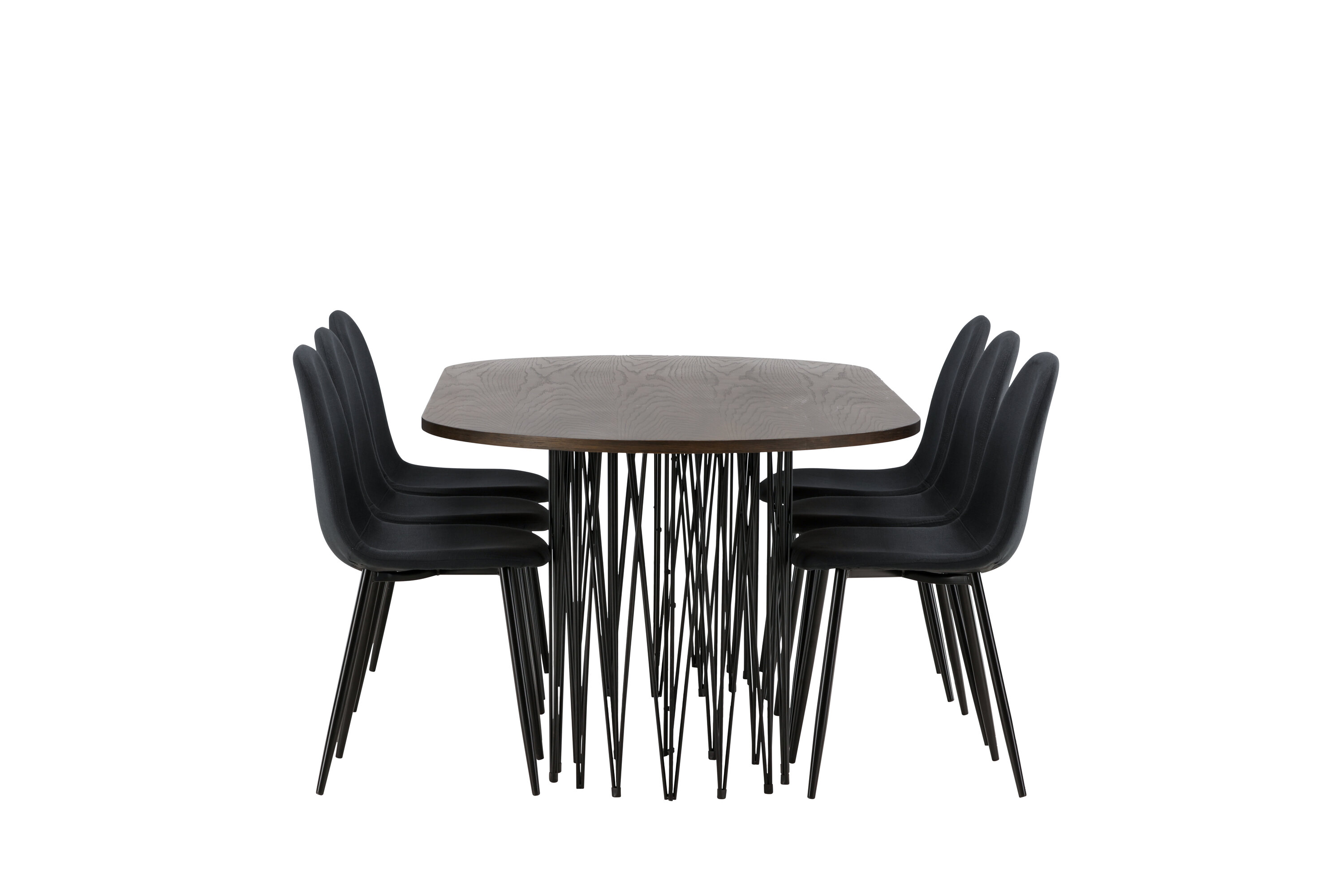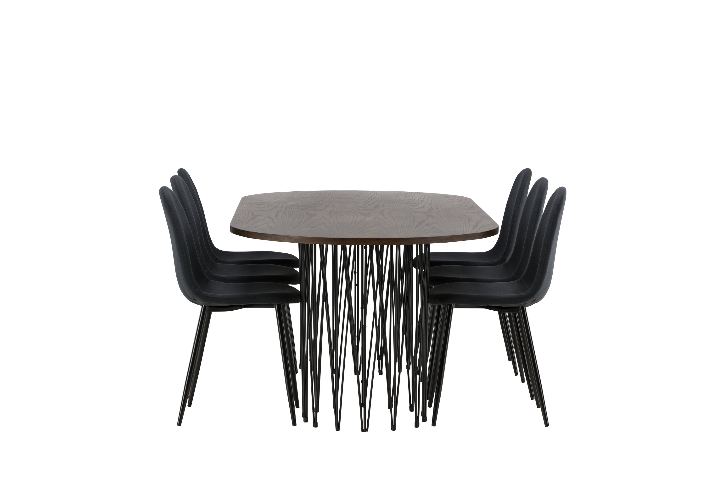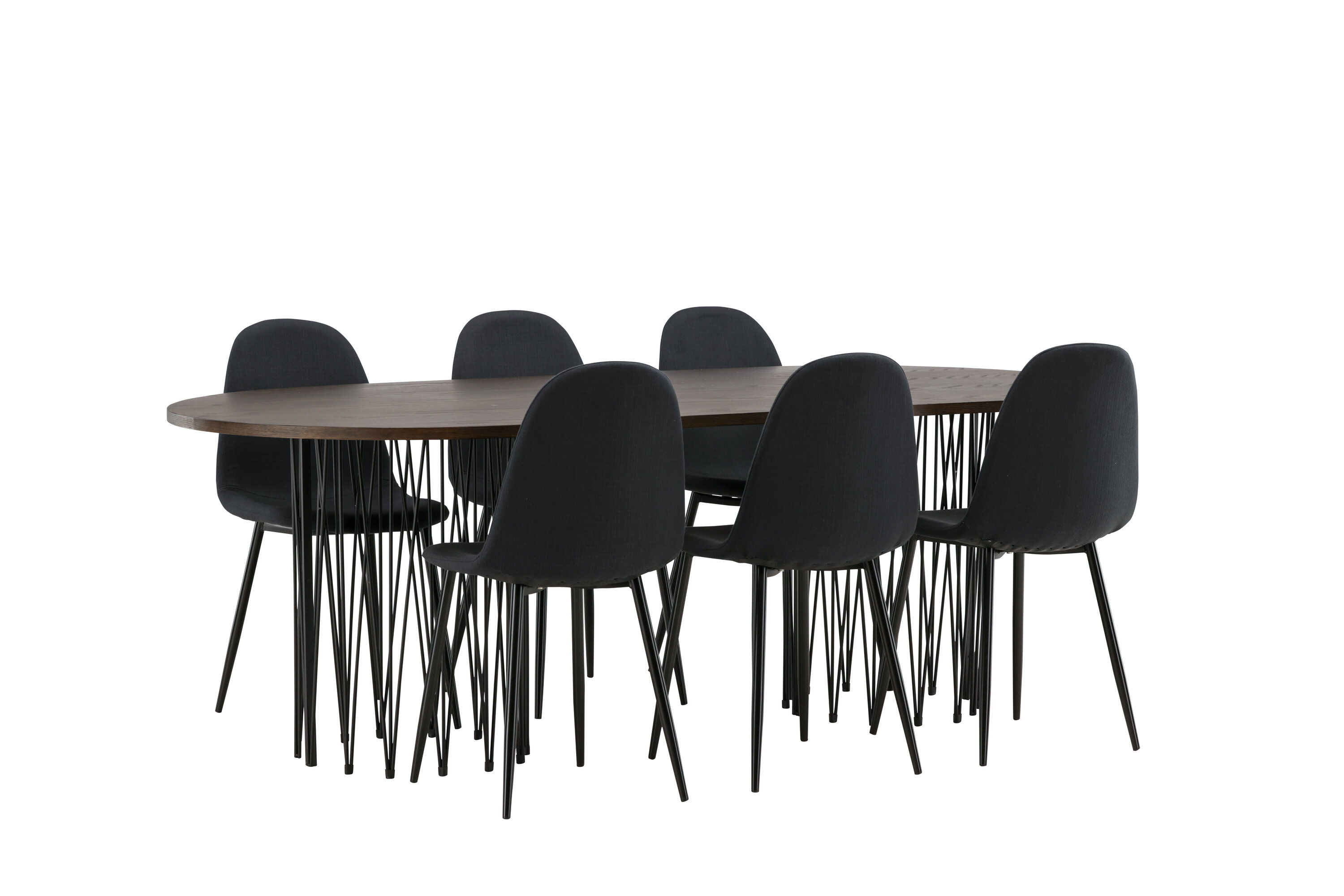 See söögigrupp on nii stiilne kui ka praktiline! Meie ovaalne söögilaud Stone on armsa Skandinaavia disainiga. Laual on ilus pruuni värvi spooniga MDF lauaplaat ja kaks dekoratiivset silindrikujulist mustast metallist raami. Siin koos meie mugavate Polari seeria söögitoolidega. Toolil on täielikult polsterdatud disain, ümardatud seljatugi ja iste pehme polstriga mustast polüesterkangast ning jalad on mustast pulbervärvitud metallist. Vältige kompromisse mugavuse ja stiilse disaini vahel!