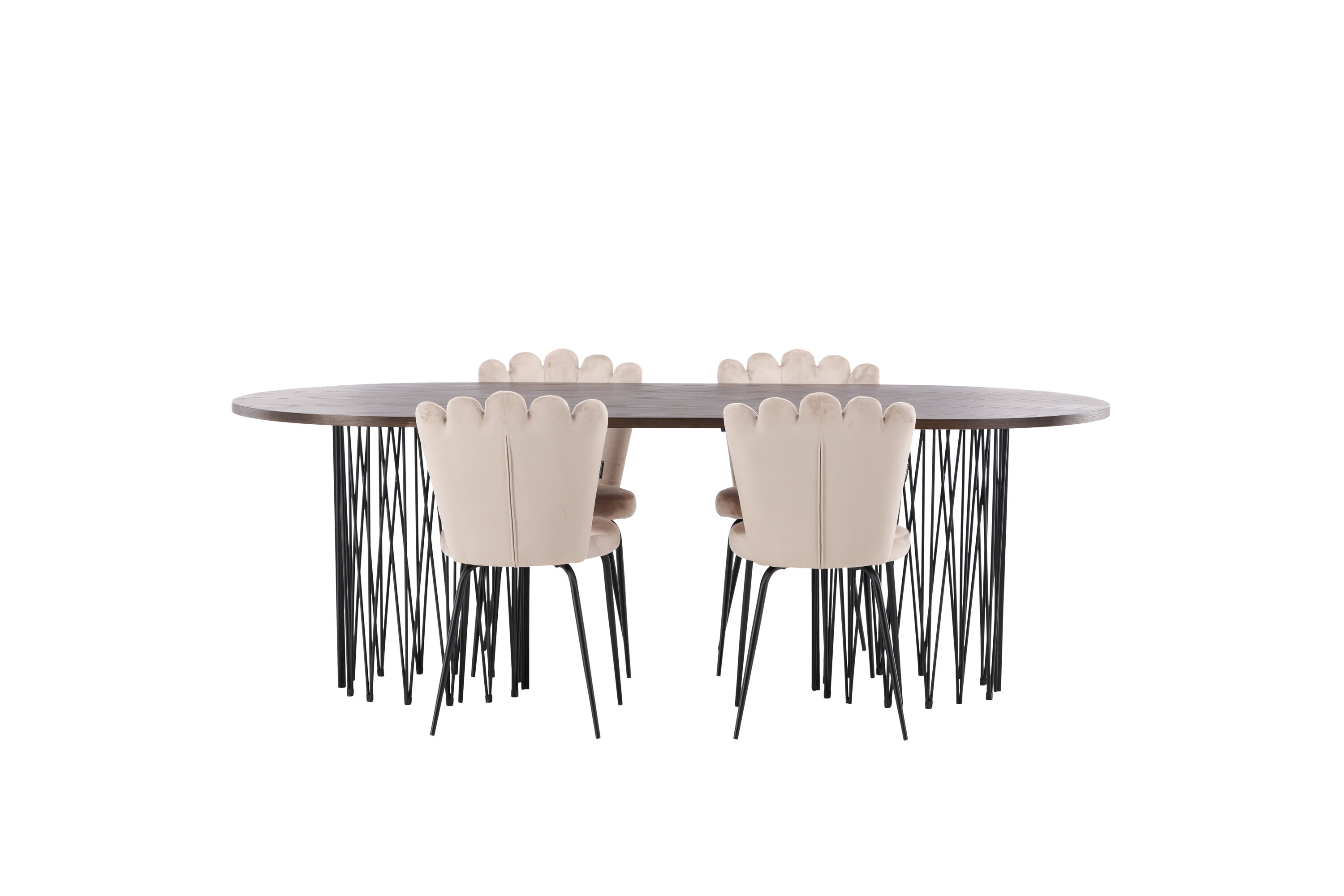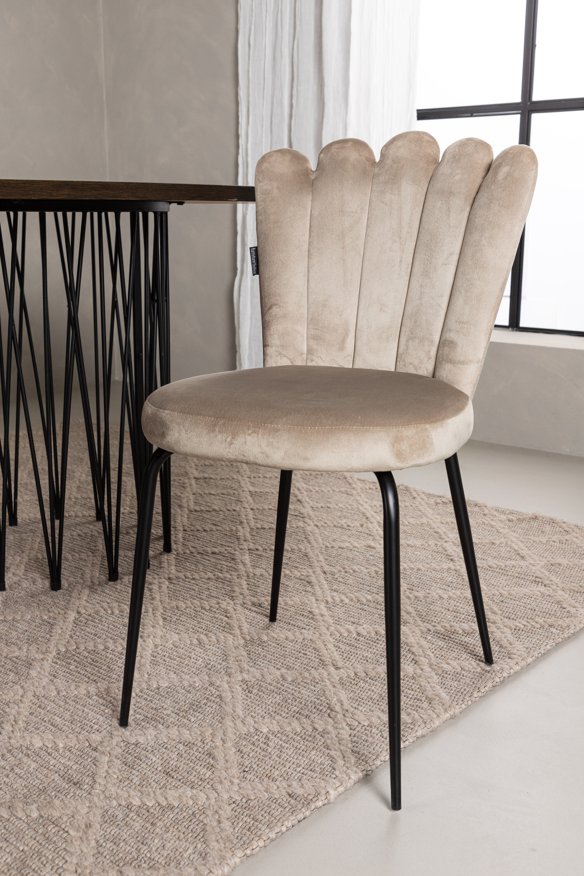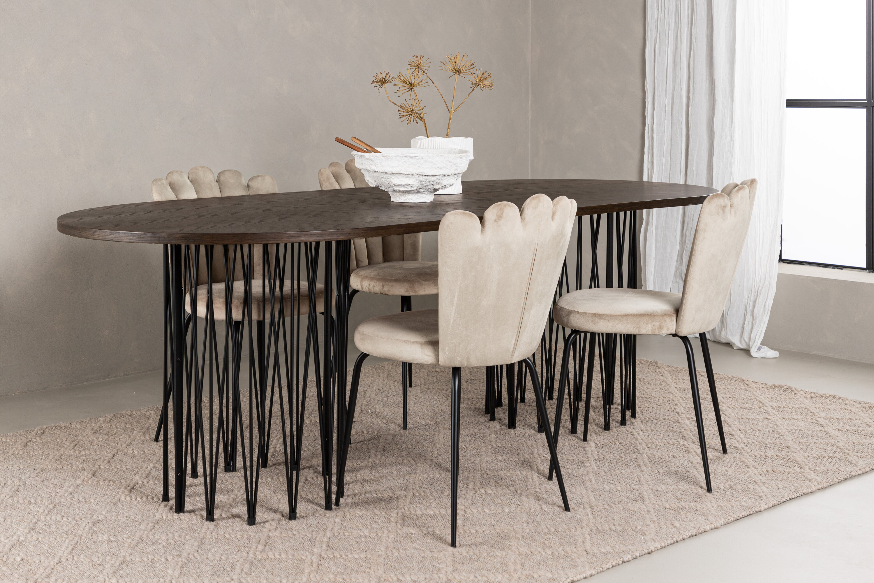 Sisusta oma kodu süda söögigrupiga, millest õhkub luksust ja mugavust! Meie ovaalne söögilaud Stone on fantastilise skandinaavialiku disainiga, mis sobib rahvahulgaga. Laual on ilus pruuni värvi spooniga MDF lauaplaat ja kaks dekoratiivset silindrikujulist mustast metallist raami. Siin on täiuslik kombinatsioon meie Limhamni sarja armsate toolidega. Tool on oma kutsuva disaini, dekoratiivse kestakujulise dekoratiivõmblustega seljatoe ja ümara istmega maitsekast beežist sametkangast moodne lemmik paljudes majapidamistes. Jalad on musta pulbervärvitud metallist. Istu mugavalt ja suurejooneliselt!