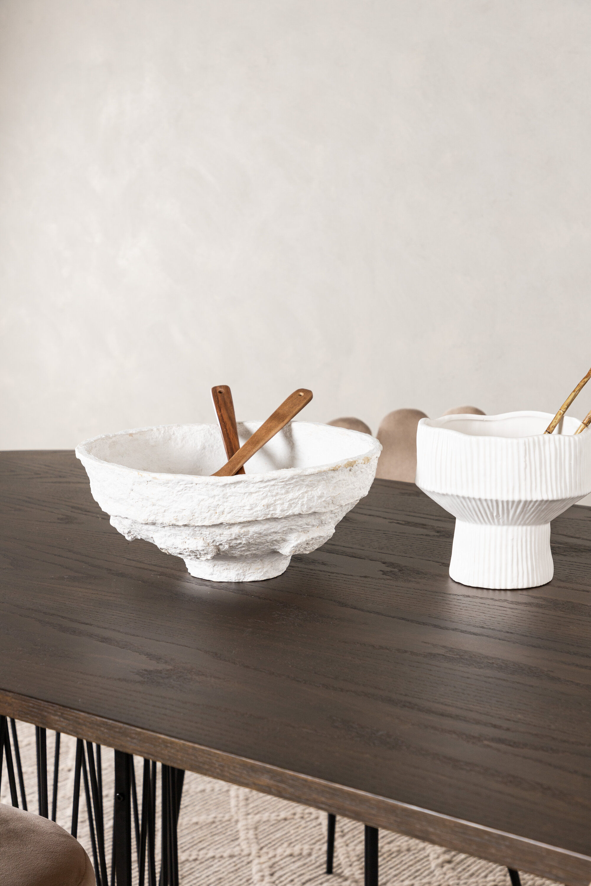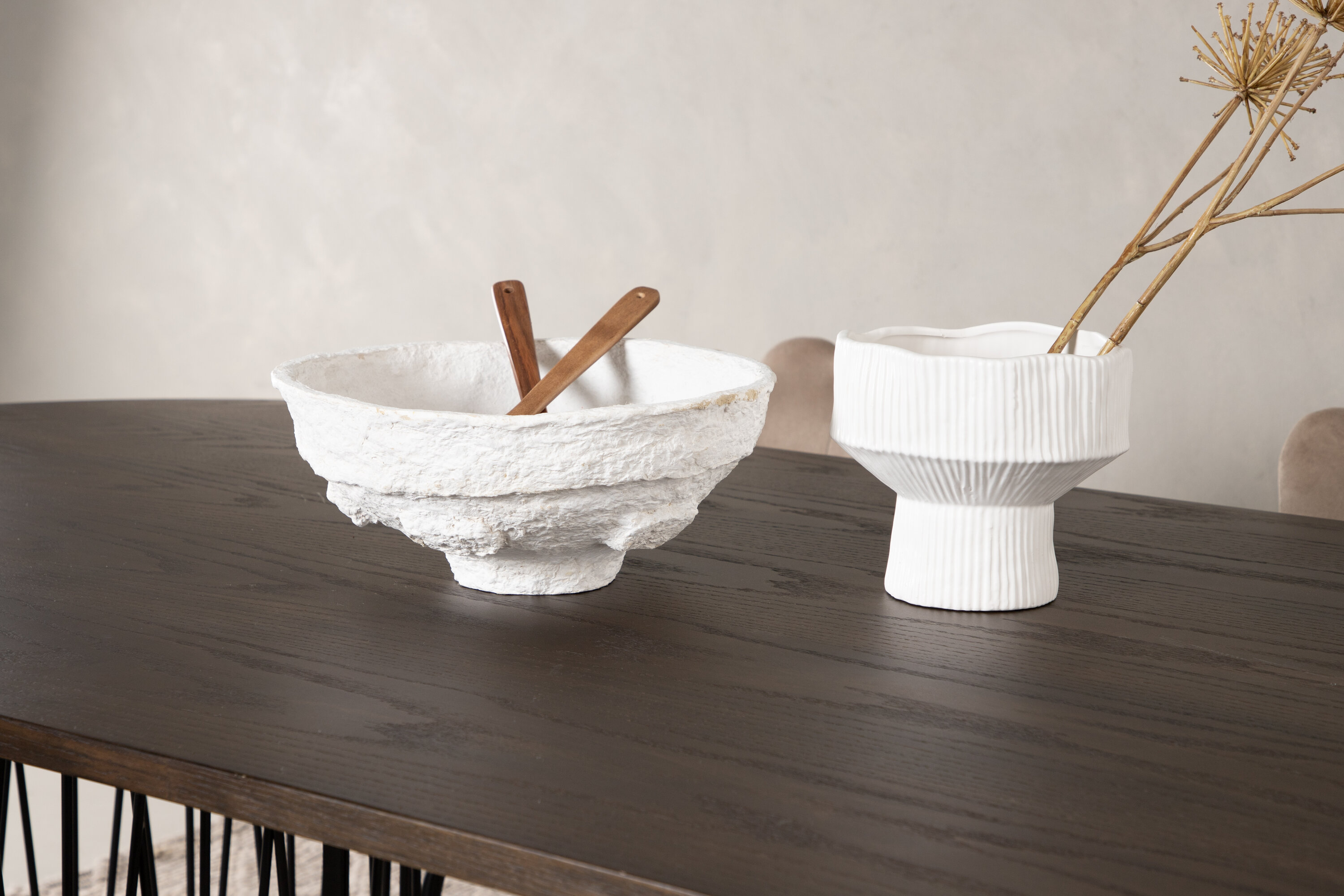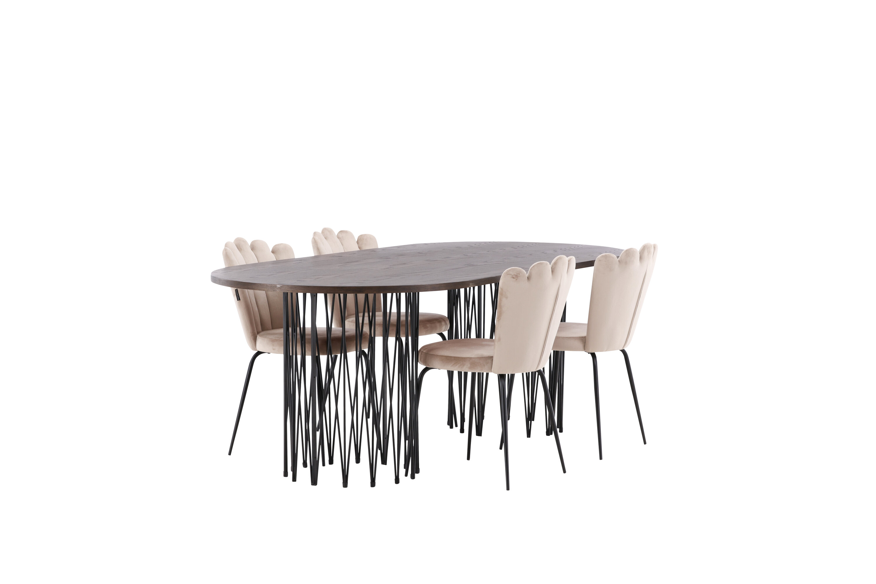 Sisusta oma kodu süda söögigrupiga, millest õhkub luksust ja mugavust! Meie ovaalne söögilaud Stone on fantastilise skandinaavialiku disainiga, mis sobib rahvahulgaga. Laual on ilus pruuni värvi spooniga MDF lauaplaat ja kaks dekoratiivset silindrikujulist mustast metallist raami. Siin on täiuslik kombinatsioon meie Limhamni sarja armsate toolidega. Tool on oma kutsuva disaini, dekoratiivse kestakujulise dekoratiivõmblustega seljatoe ja ümara istmega maitsekast beežist sametkangast moodne lemmik paljudes majapidamistes. Jalad on musta pulbervärvitud metallist. Istu mugavalt ja suurejooneliselt!