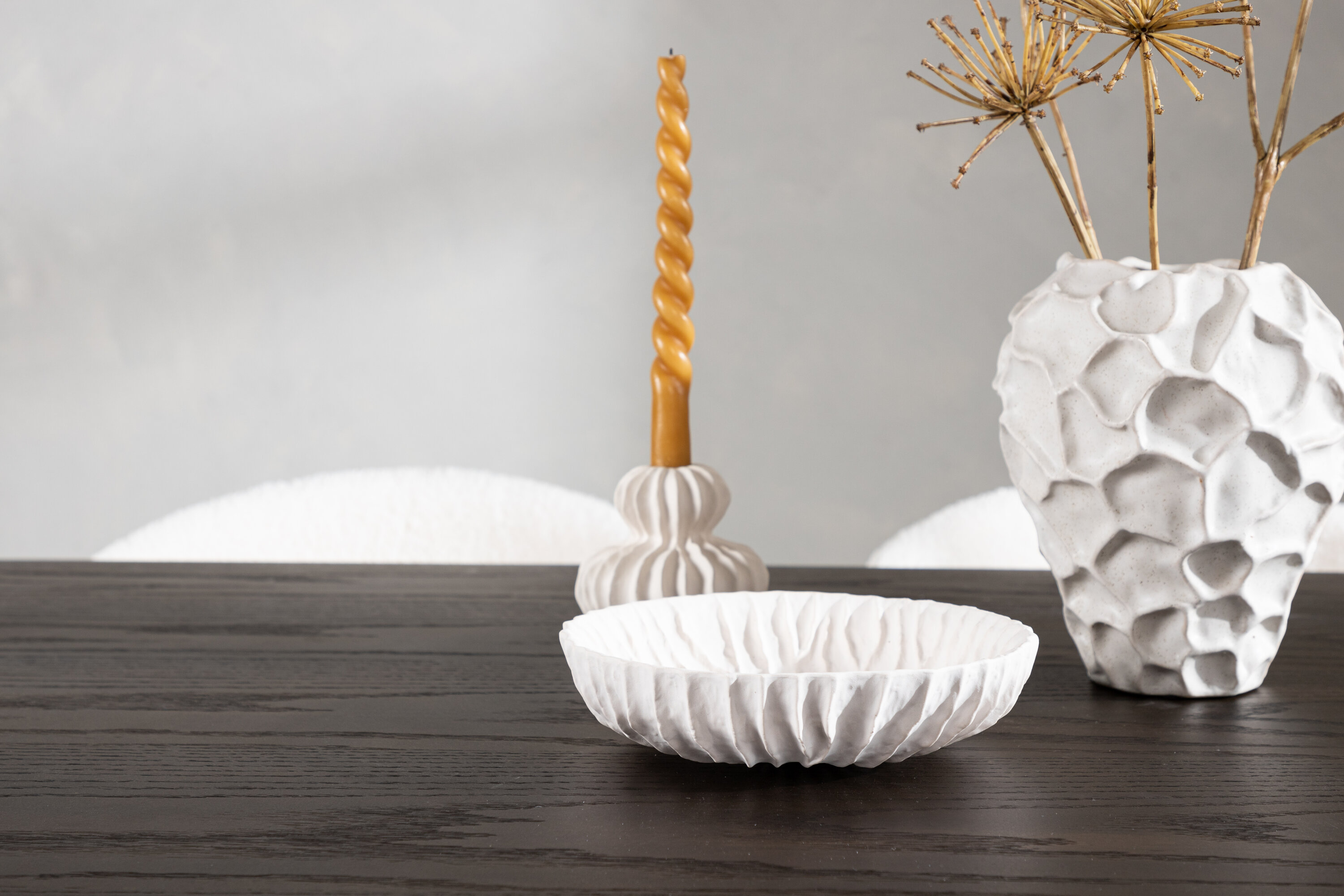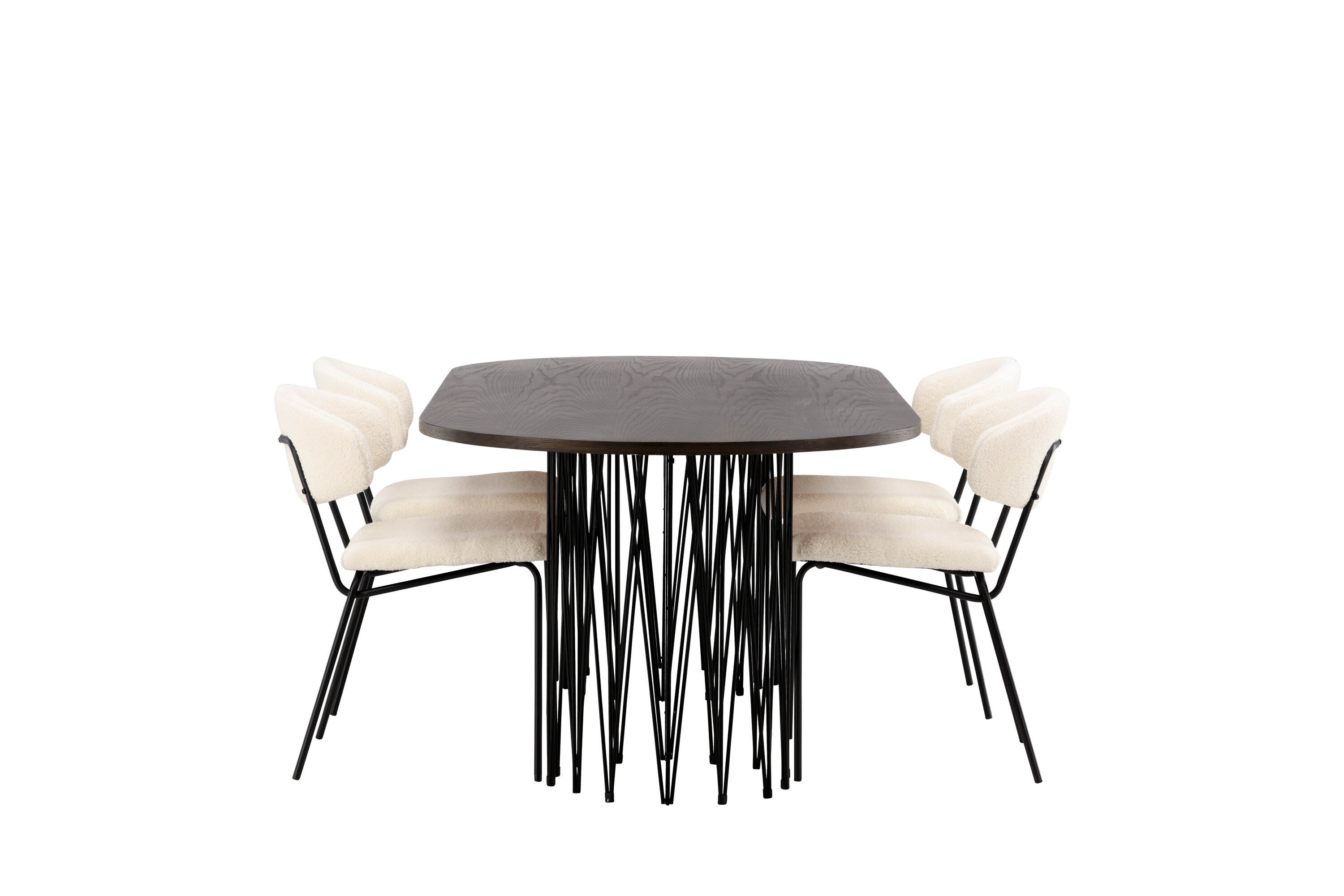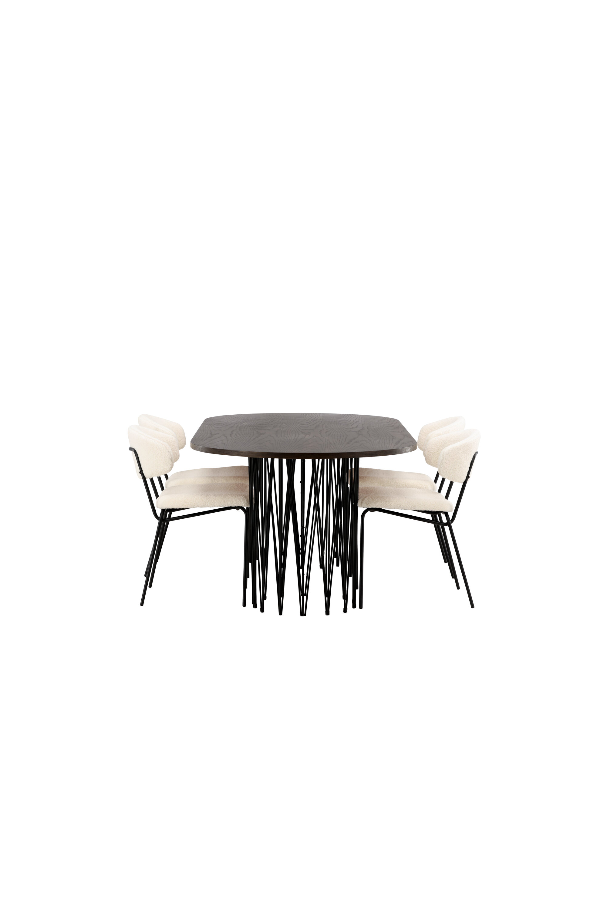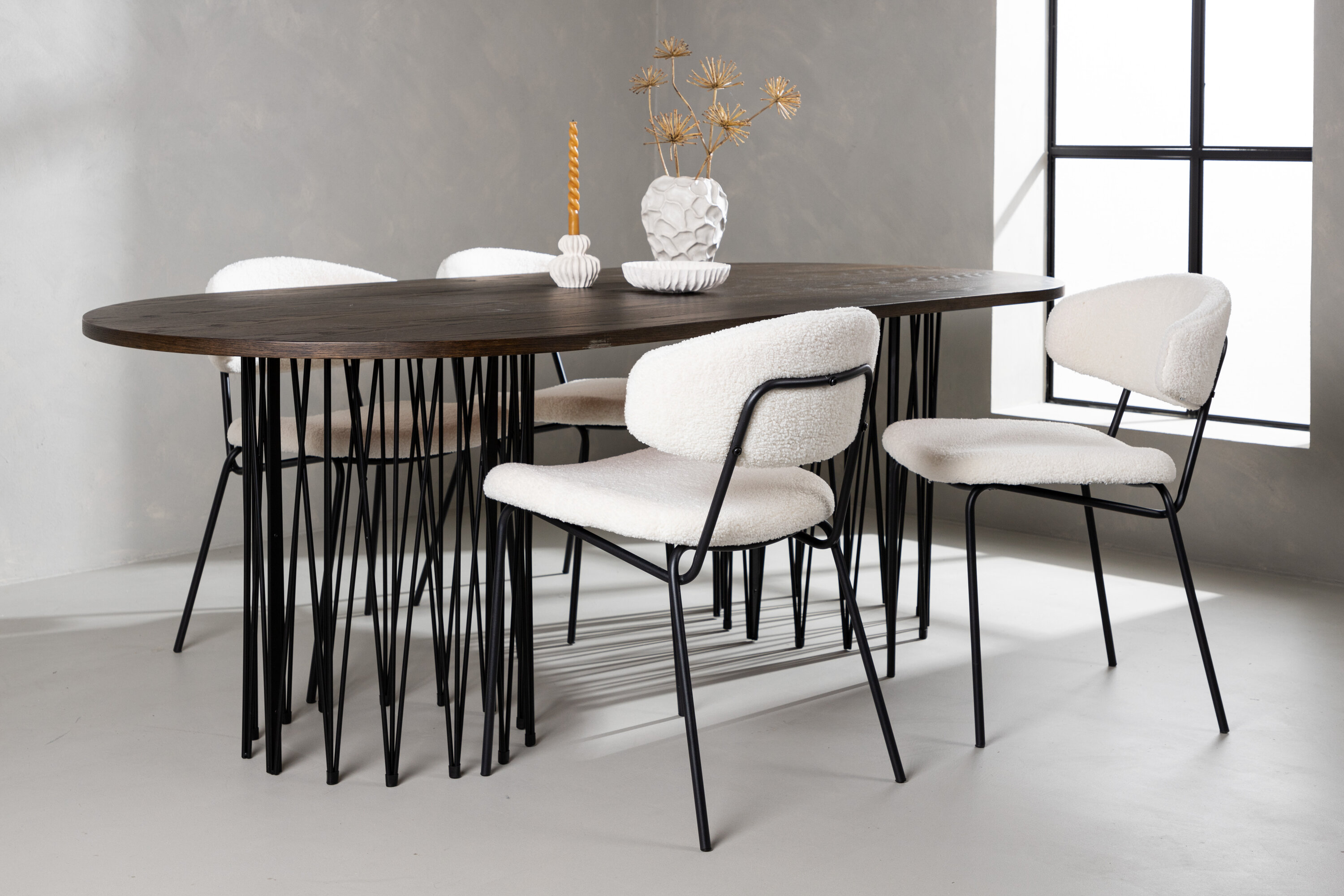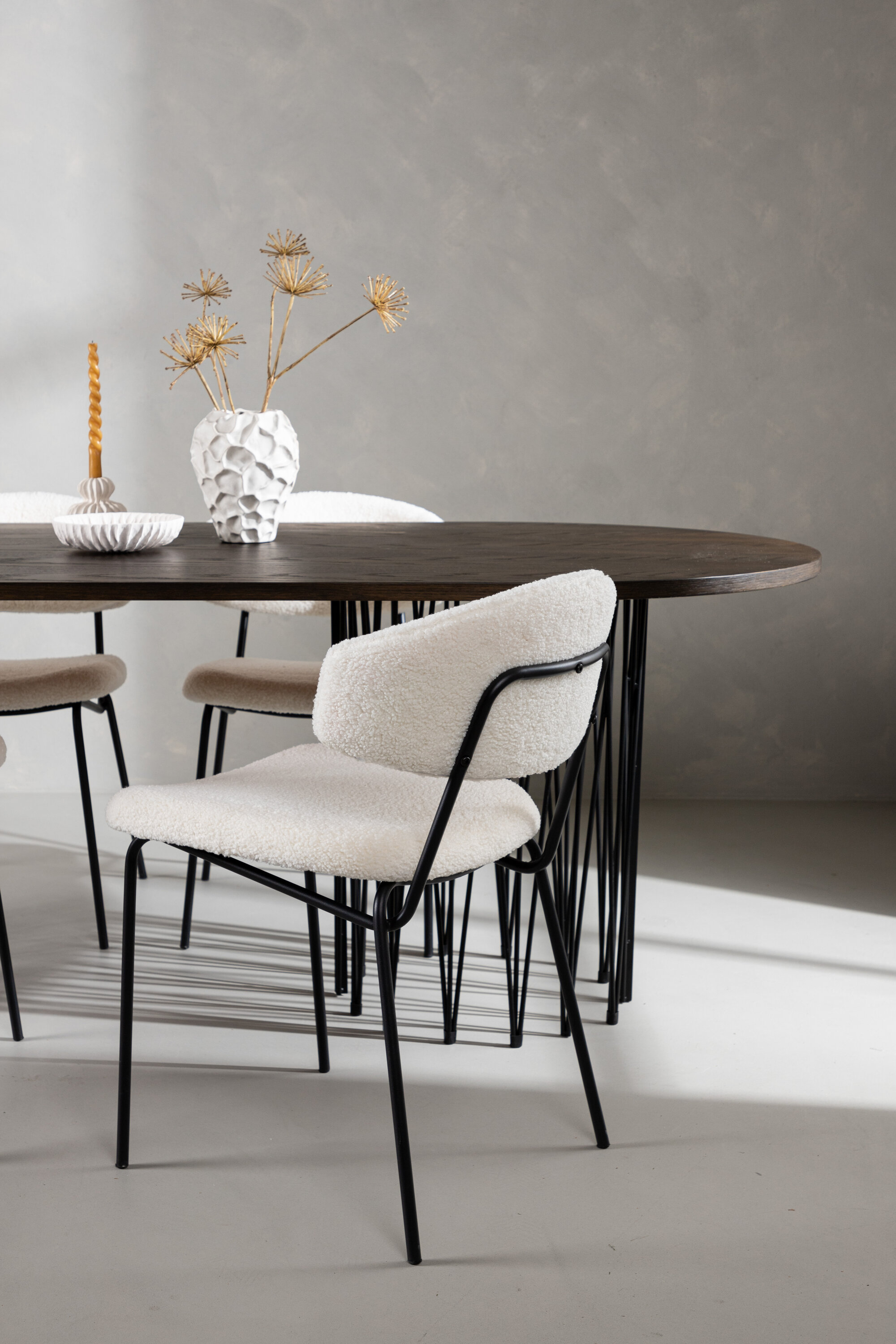Nii stiilne kui ka praktiline – sellest mugavast söögigrupist õhkub nii mugavust kui ka moeteadlikku disaini! Meie ovaalne söögilaud Stone on fantastilise skandinaavialiku disainiga, mis sobib rahvahulgaga. Laual on ilus pruuni värvi spooniga MDF lauaplaat ja kaks dekoratiivset silindrikujulist mustast metallist raami. Siin koos meie trendikate söögitoolidega Chico sarjast. Toolid on minimalistliku ja mugava disainiga, mille seljatugi ja iste on valgest boucle kangast ning kitsas mustast terasest raam. Siit saate oma koju hubase keskse detaili!