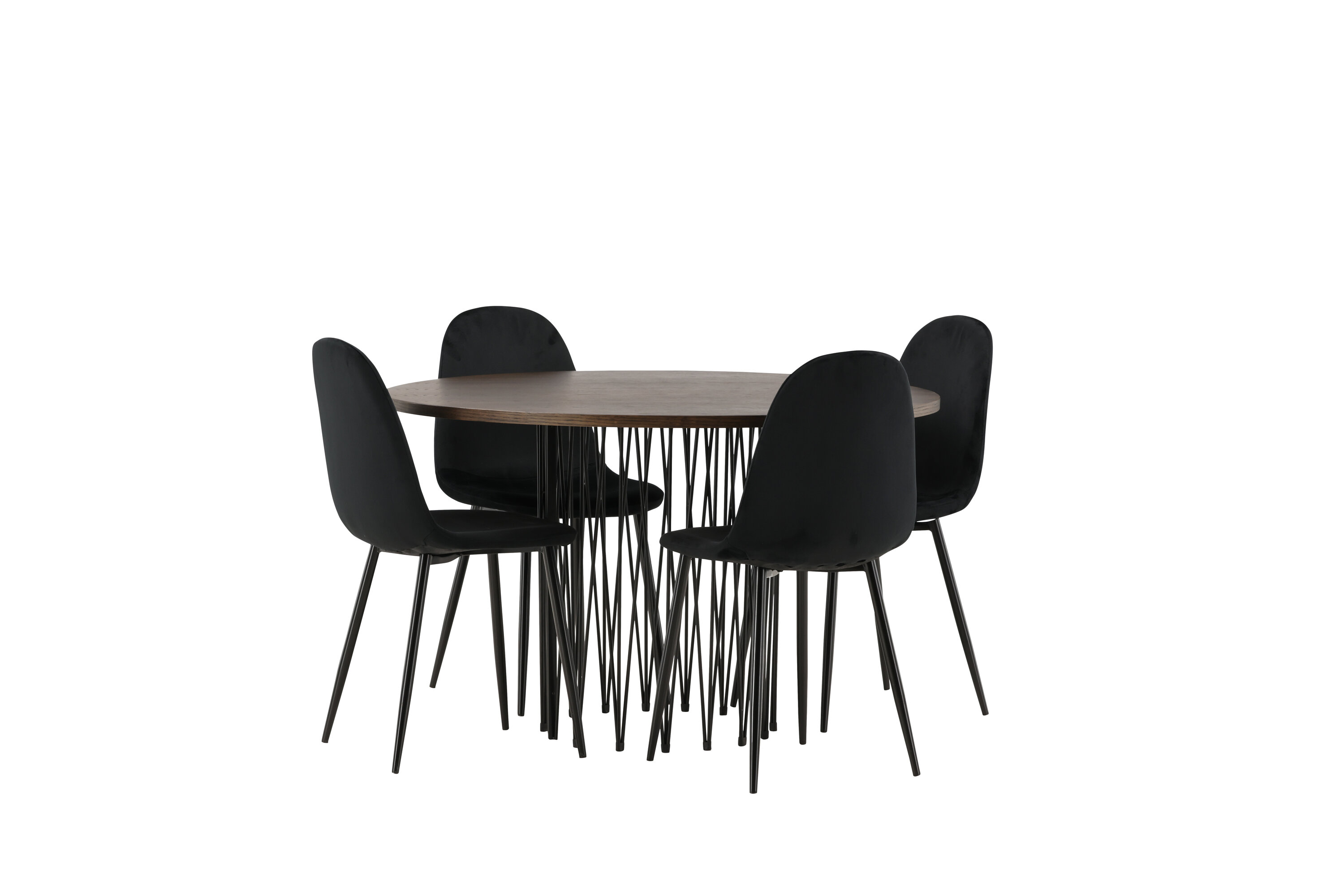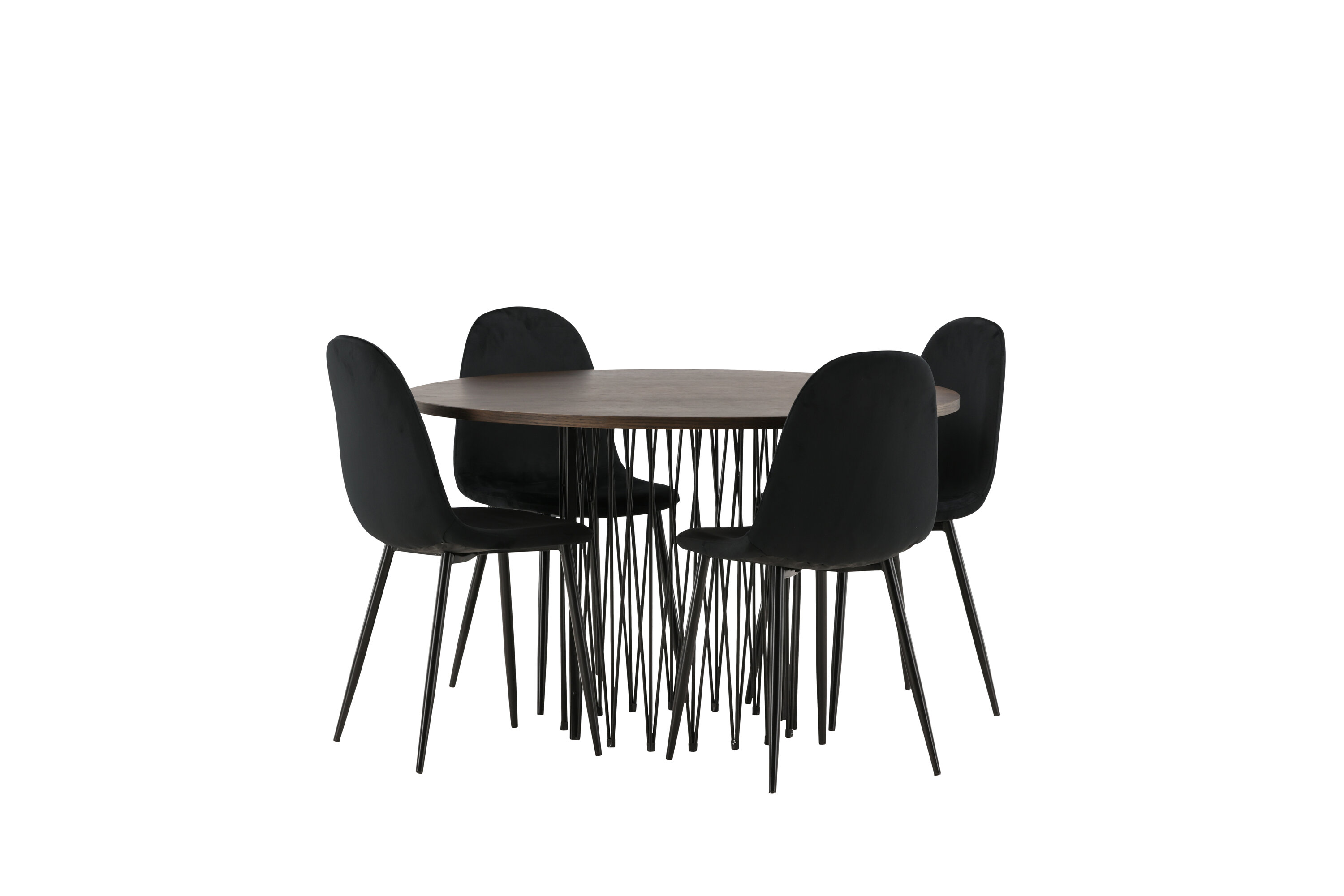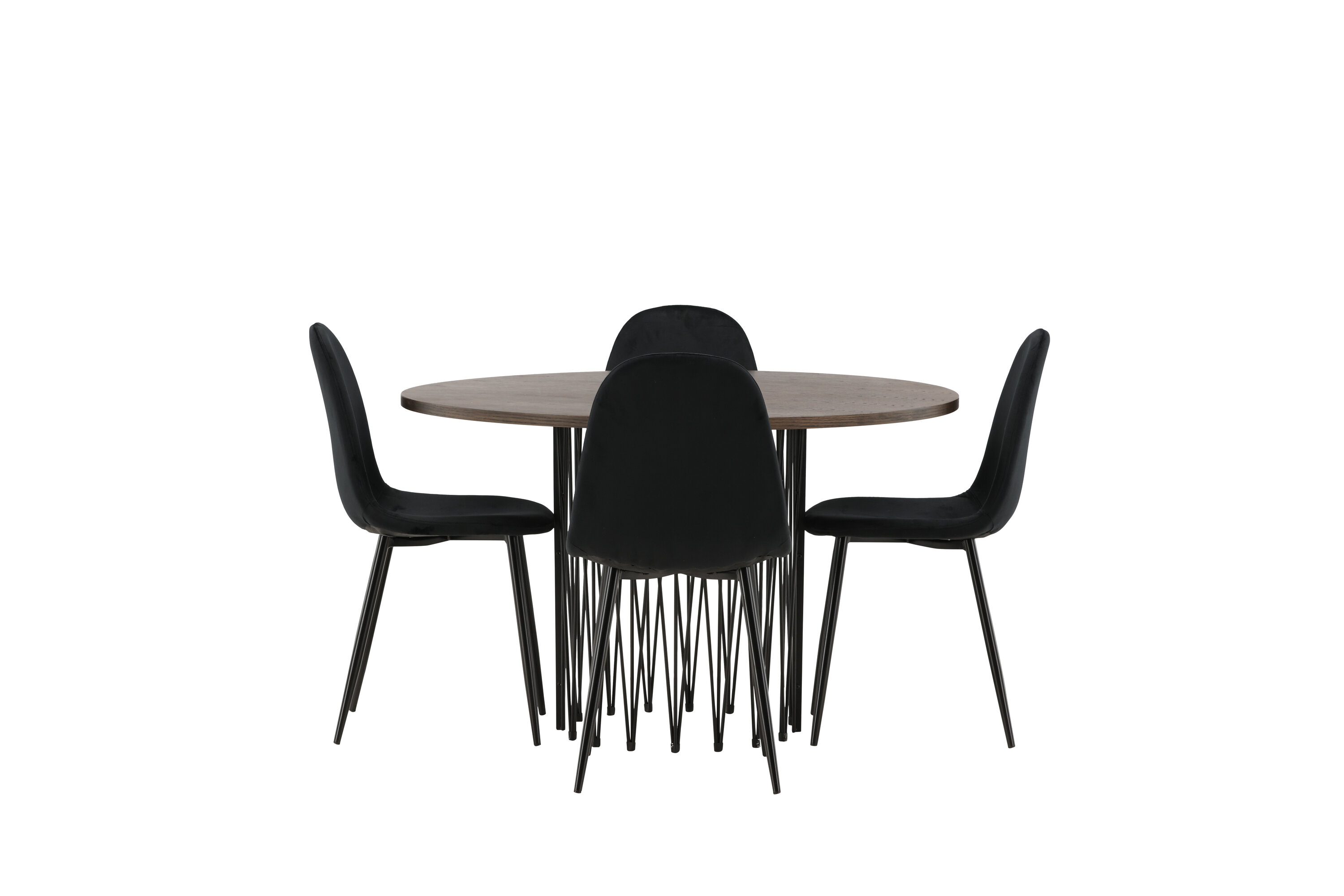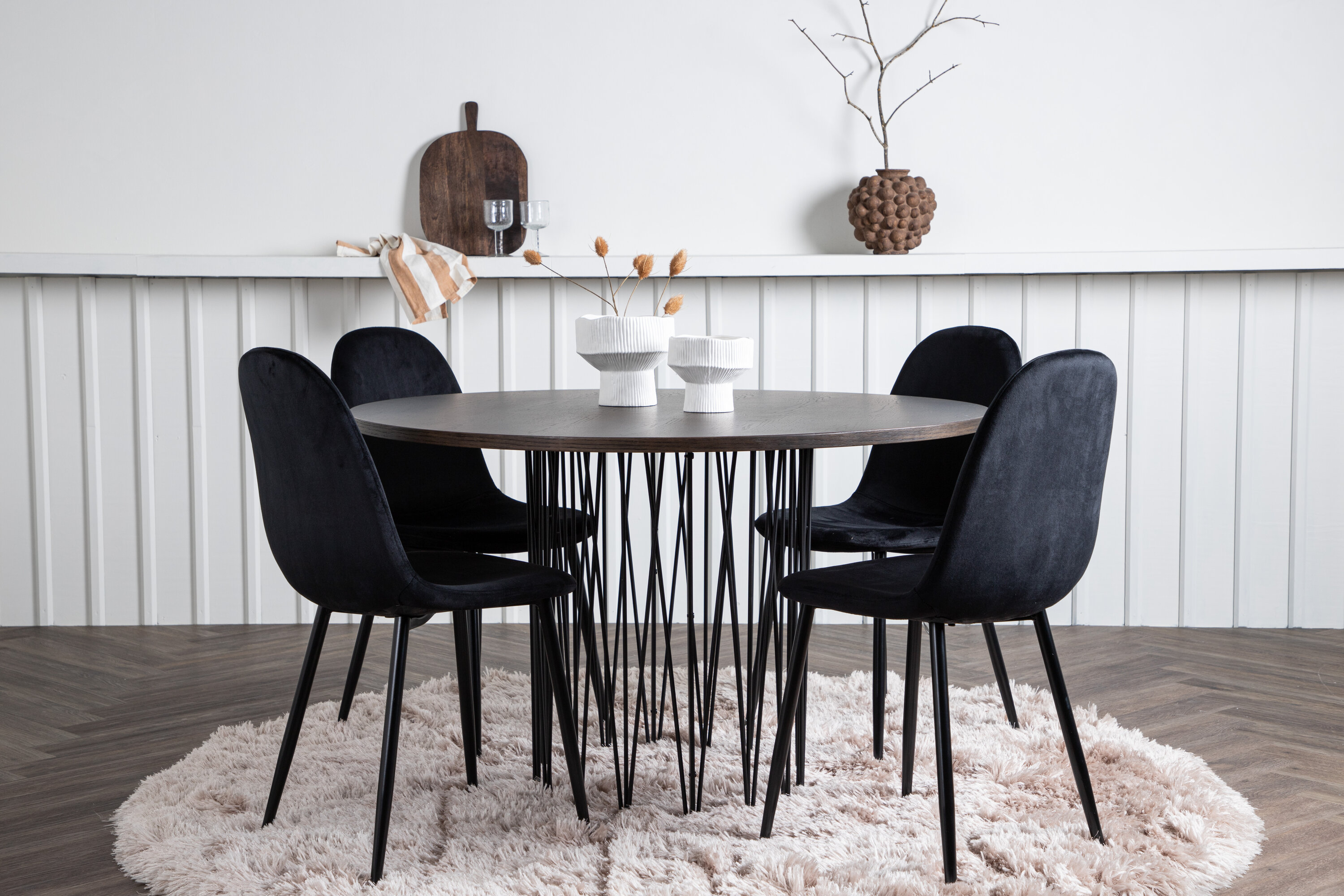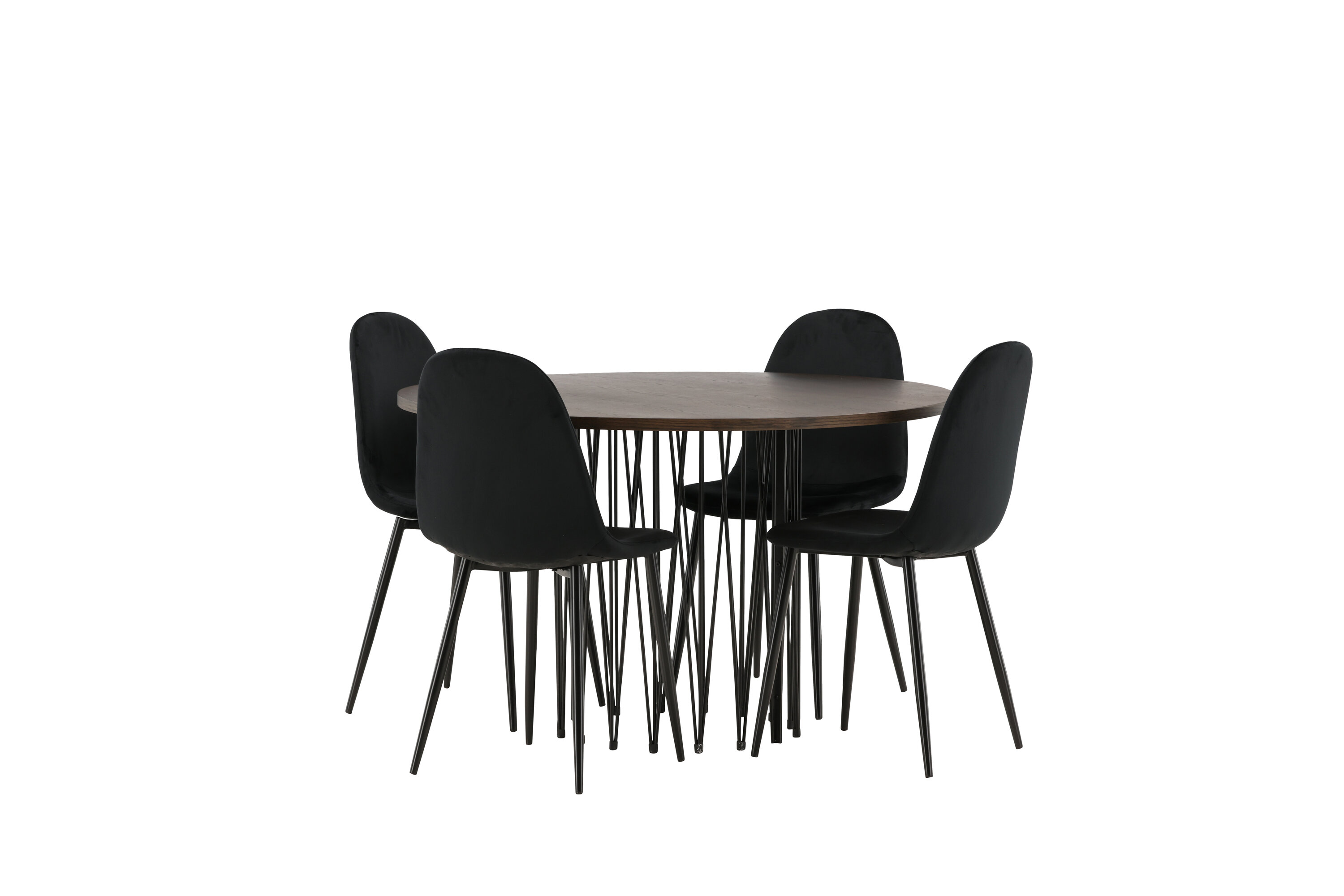 Söögigrupp, mis loob kiiresti teie elutuppa kutsuva ja kaasaegse atmosfääri! Meie ümmargune söögilaud Stone on fantastilise skandinaavialiku disainiga, millest õhkub võlu. Laual on ilus pruuni värvi spooniga MDF lauaplaat ja dekoratiivne silindrikujuline mustast metallist raam. Siin koos mugavate Polari sarja toolidega. Toolil on täielikult polsterdatud disain, ümardatud seljatugi ja iste mustast sametkangast, pehme polstriga ning jalad mustast pulbervärvitud metallist. Vältige kompromisse mugavuse ja stiilse disaini vahel!