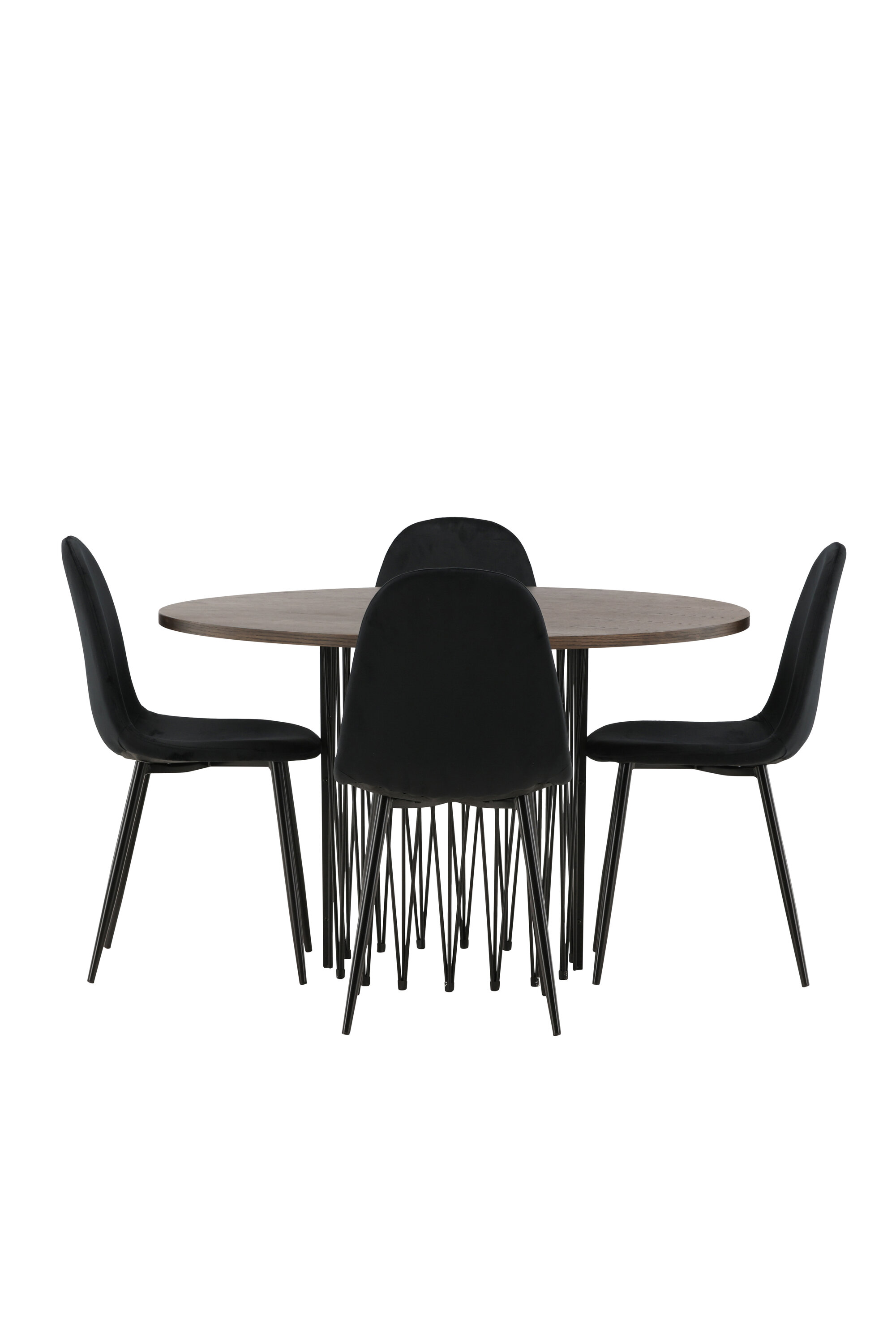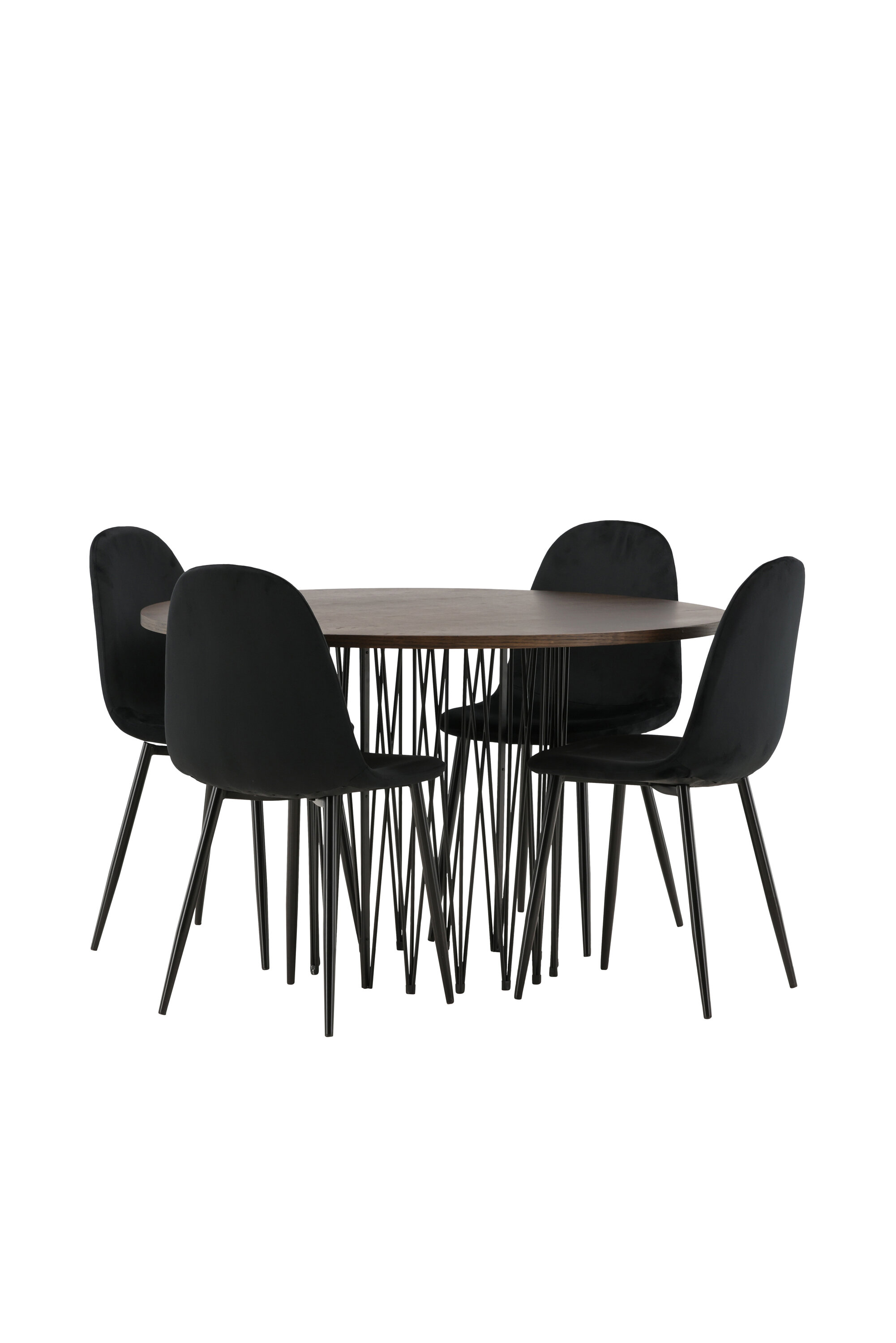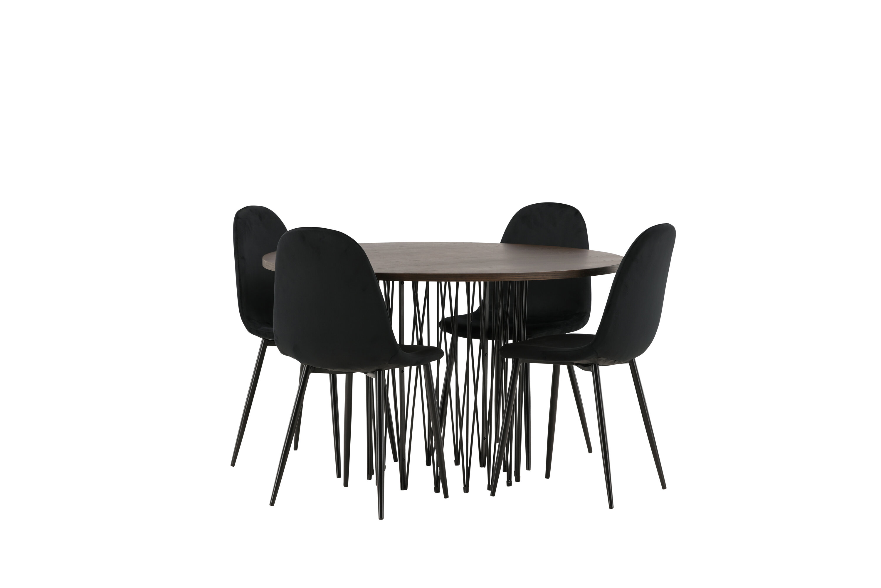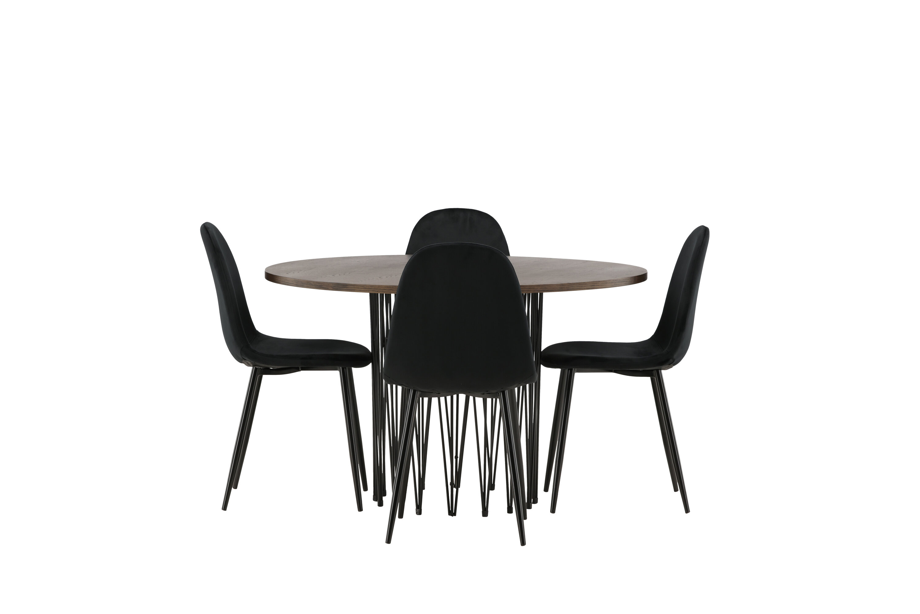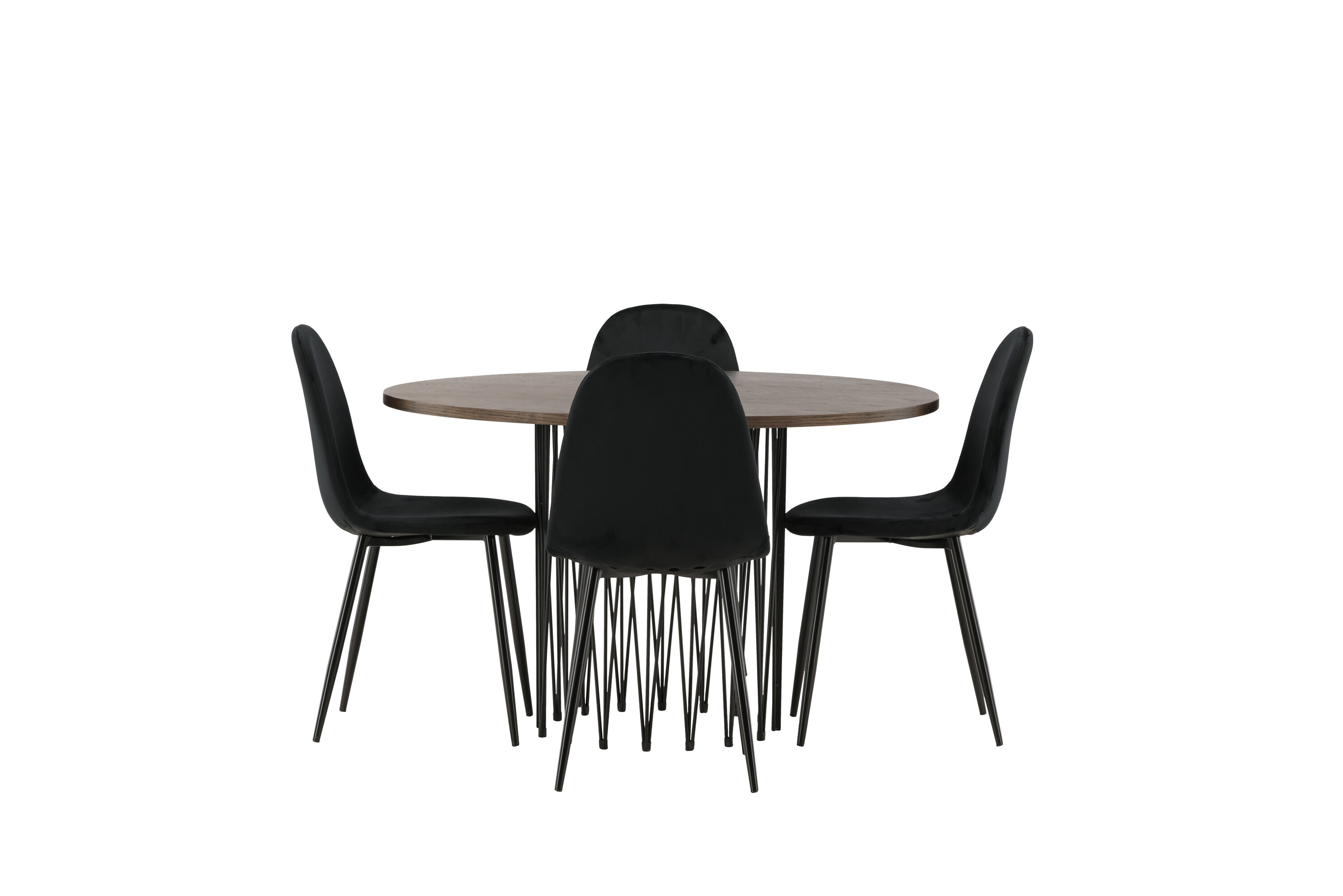 Söögigrupp, mis loob kiiresti teie elutuppa kutsuva ja kaasaegse atmosfääri! Meie ümmargune söögilaud Stone on fantastilise skandinaavialiku disainiga, millest õhkub võlu. Laual on ilus pruuni värvi spooniga MDF lauaplaat ja dekoratiivne silindrikujuline mustast metallist raam. Siin koos mugavate Polari sarja toolidega. Toolil on täielikult polsterdatud disain, ümardatud seljatugi ja iste mustast sametkangast, pehme polstriga ning jalad mustast pulbervärvitud metallist. Vältige kompromisse mugavuse ja stiilse disaini vahel!