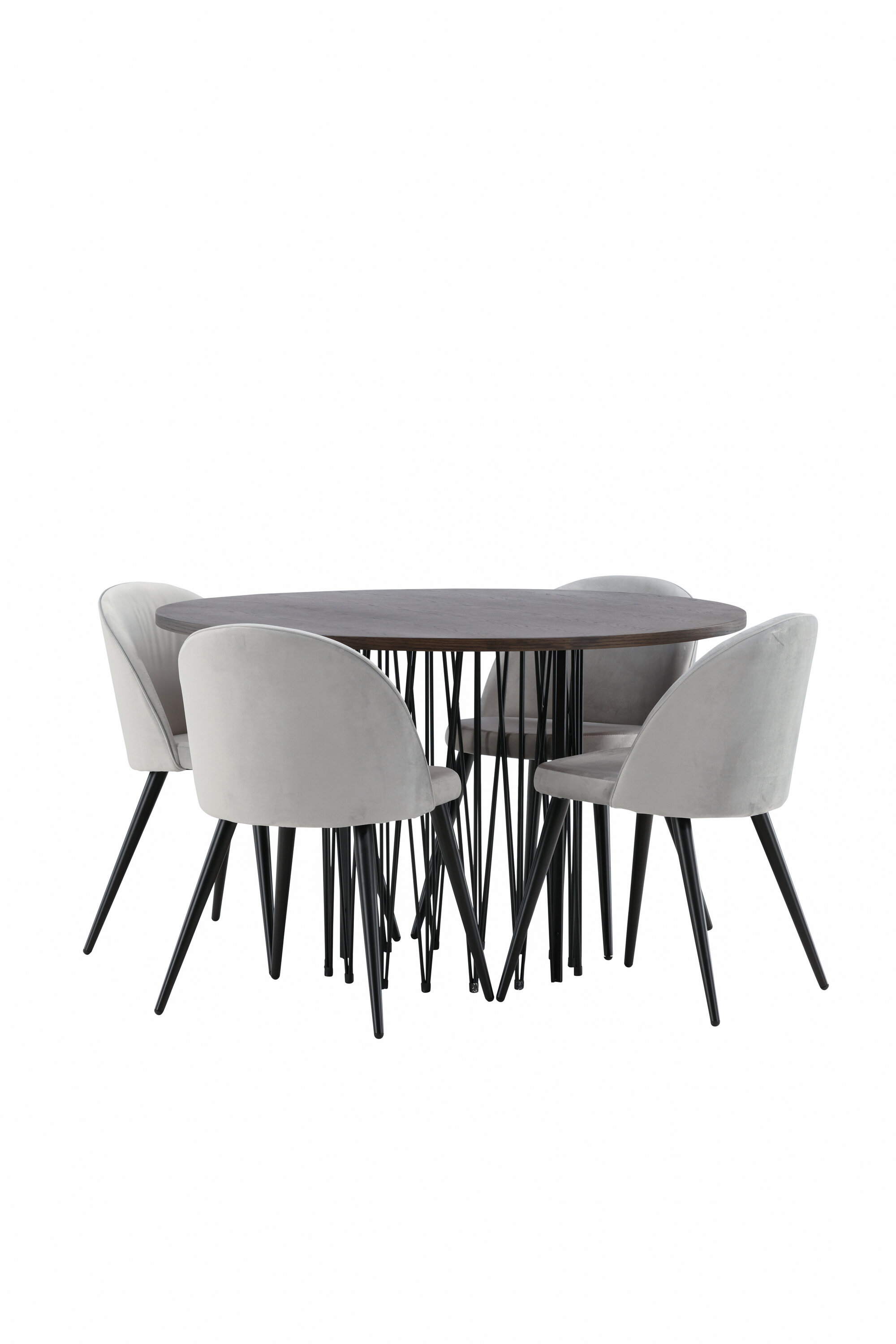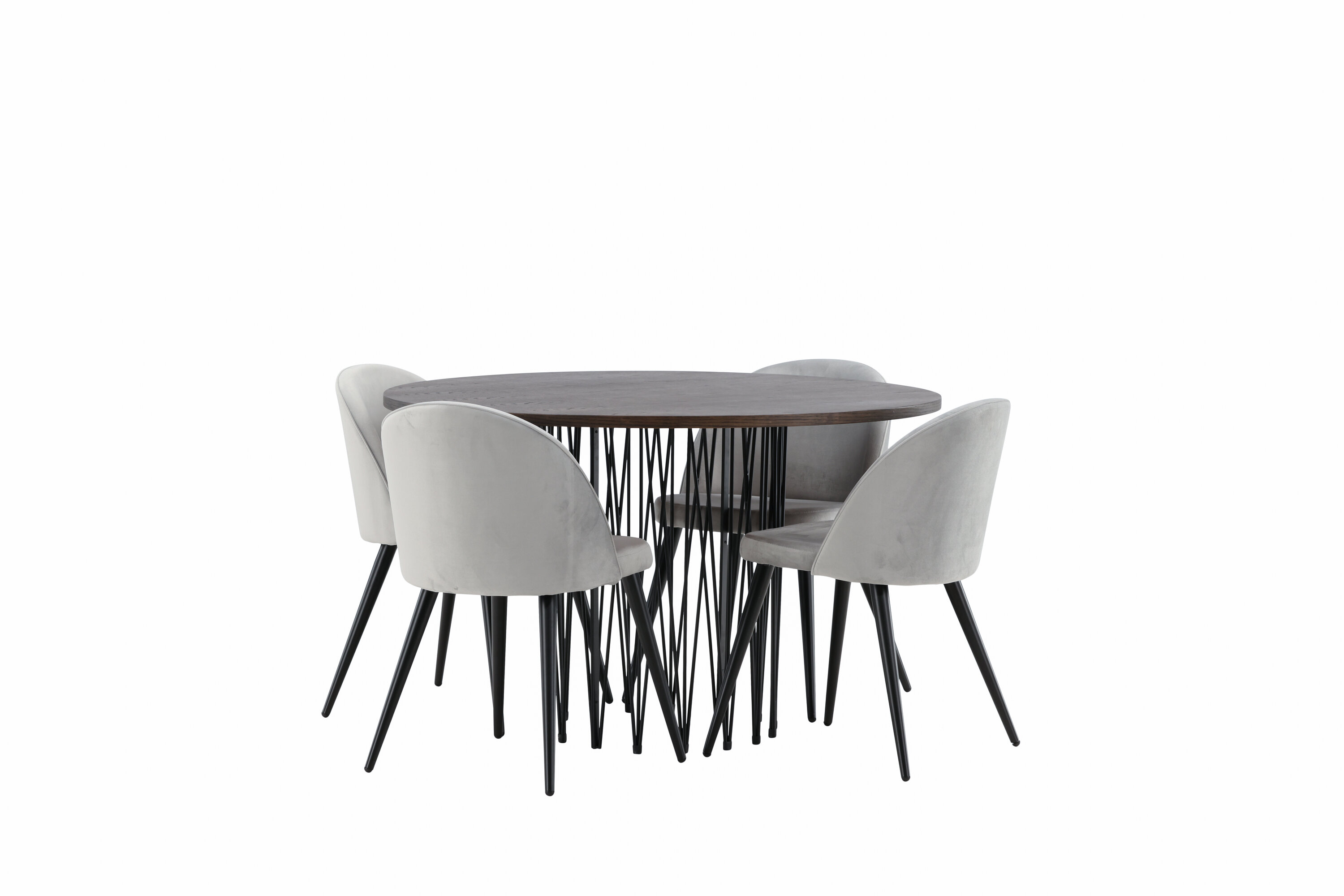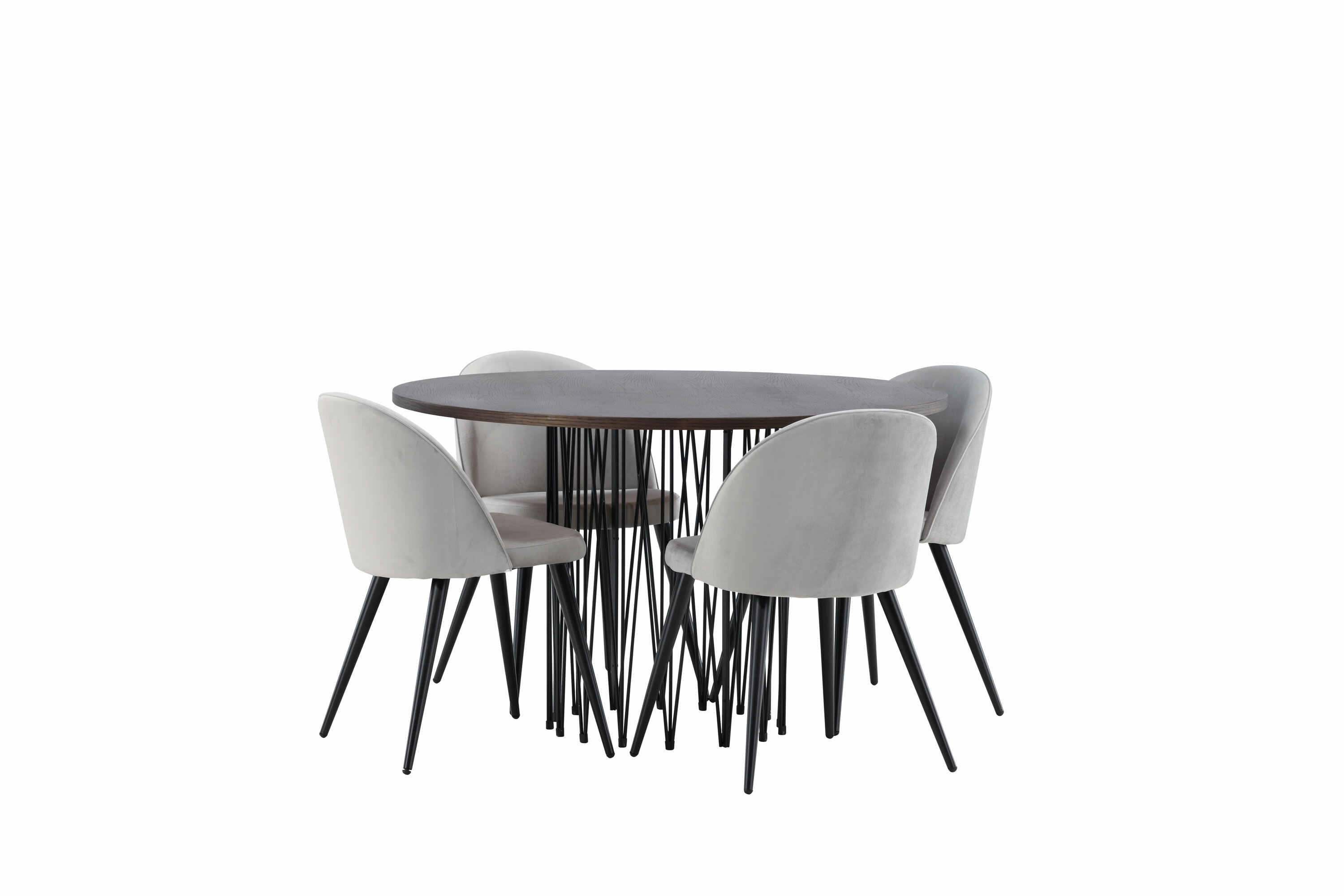 Vältige kompromisse stiili ja mugavuse vahel! Meie ümmargune söögilaud Stone on fantastilise skandinaavialiku disainiga, millest õhkub võlu. Laual on ilus pruuni värvi spooniga MDF lauaplaat ja dekoratiivne silindrikujuline mustast metallist raam. Siin koos meie populaarsete Velvet seeria söögitoolidega meeldivas hallis toonis. Sellel söögitoolil on täielikult polsterdatud disain, pehmest sametkangast kergelt ümardatud seljatugi ja iste ning mustast pulbervärvitud metallist jalad. Loo võluv keskpunkt, et koguda perekond!