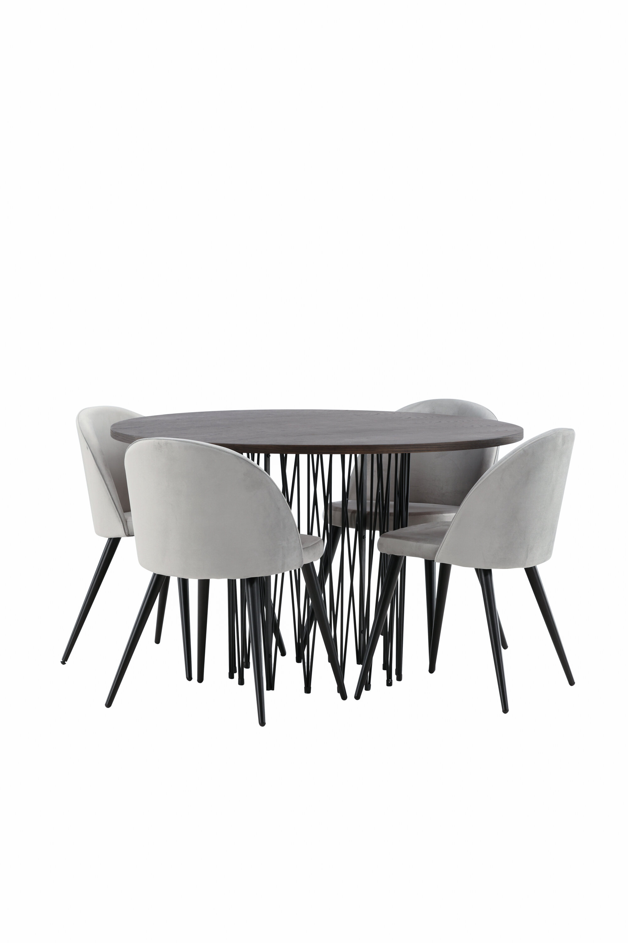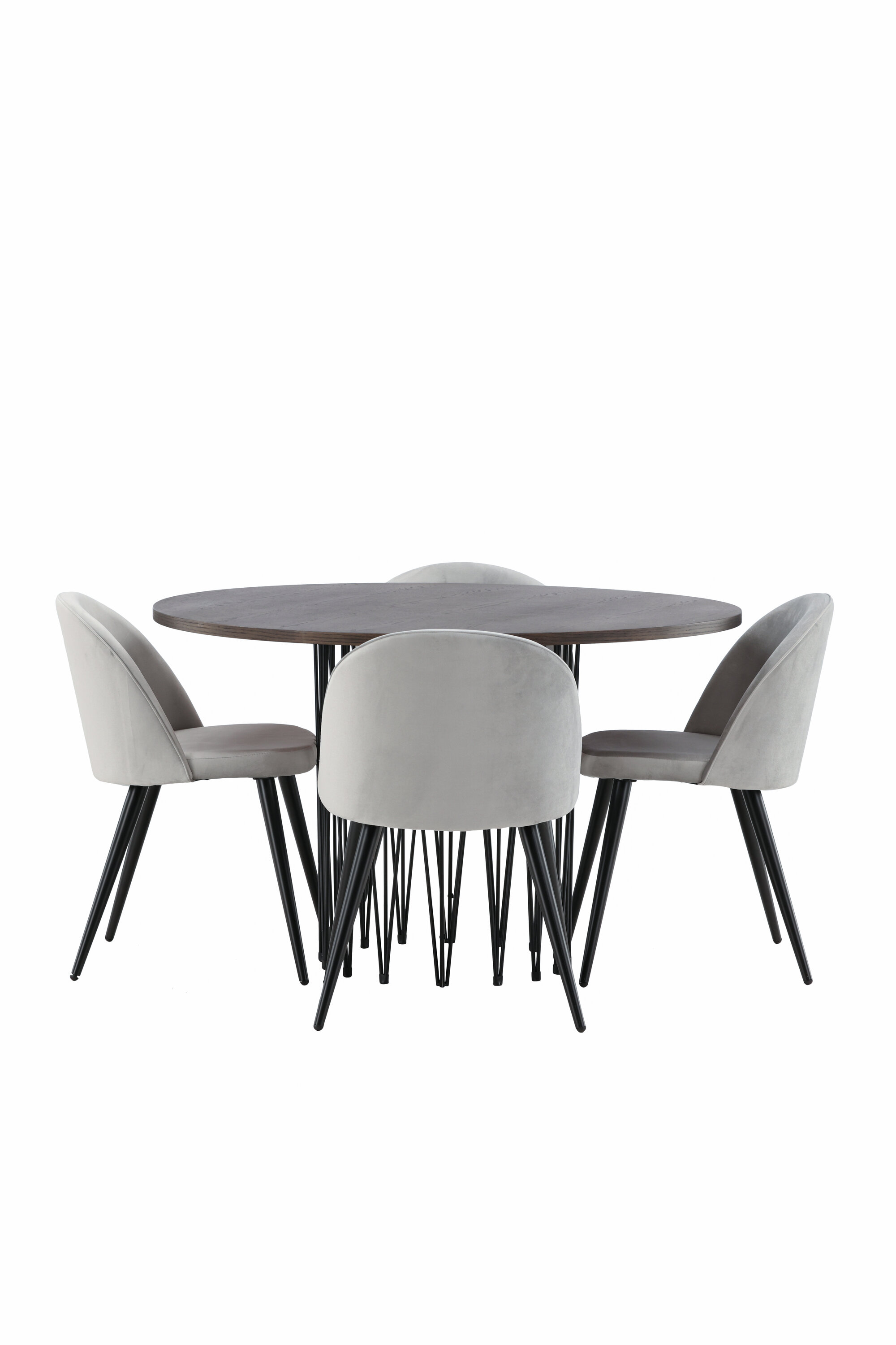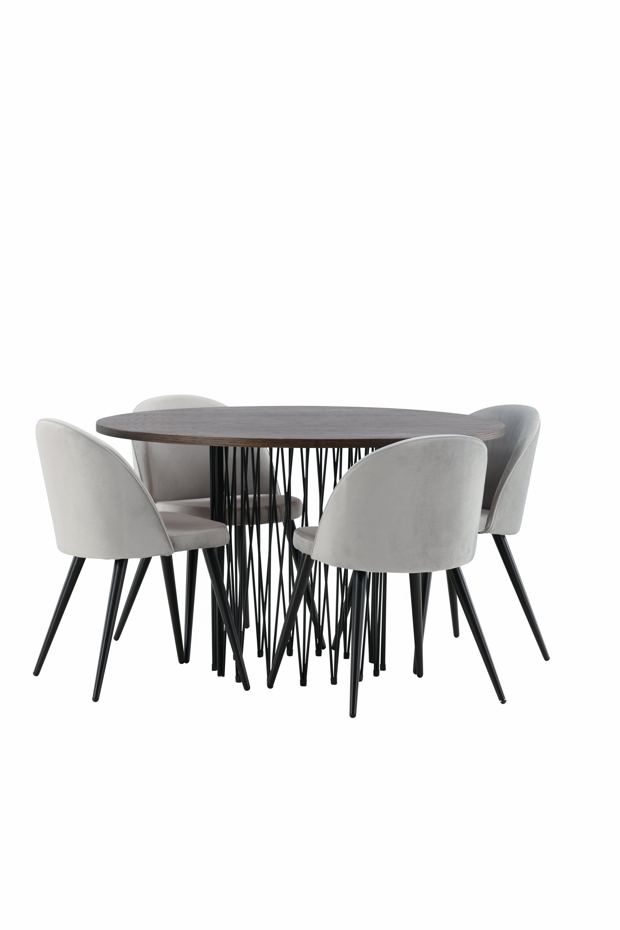 Vältige kompromisse stiili ja mugavuse vahel! Meie ümmargune söögilaud Stone on fantastilise skandinaavialiku disainiga, millest õhkub võlu. Laual on ilus pruuni värvi spooniga MDF lauaplaat ja dekoratiivne silindrikujuline mustast metallist raam. Siin koos meie populaarsete Velvet seeria söögitoolidega meeldivas hallis toonis. Sellel söögitoolil on täielikult polsterdatud disain, pehmest sametkangast kergelt ümardatud seljatugi ja iste ning mustast pulbervärvitud metallist jalad. Loo võluv keskpunkt, et koguda perekond!
