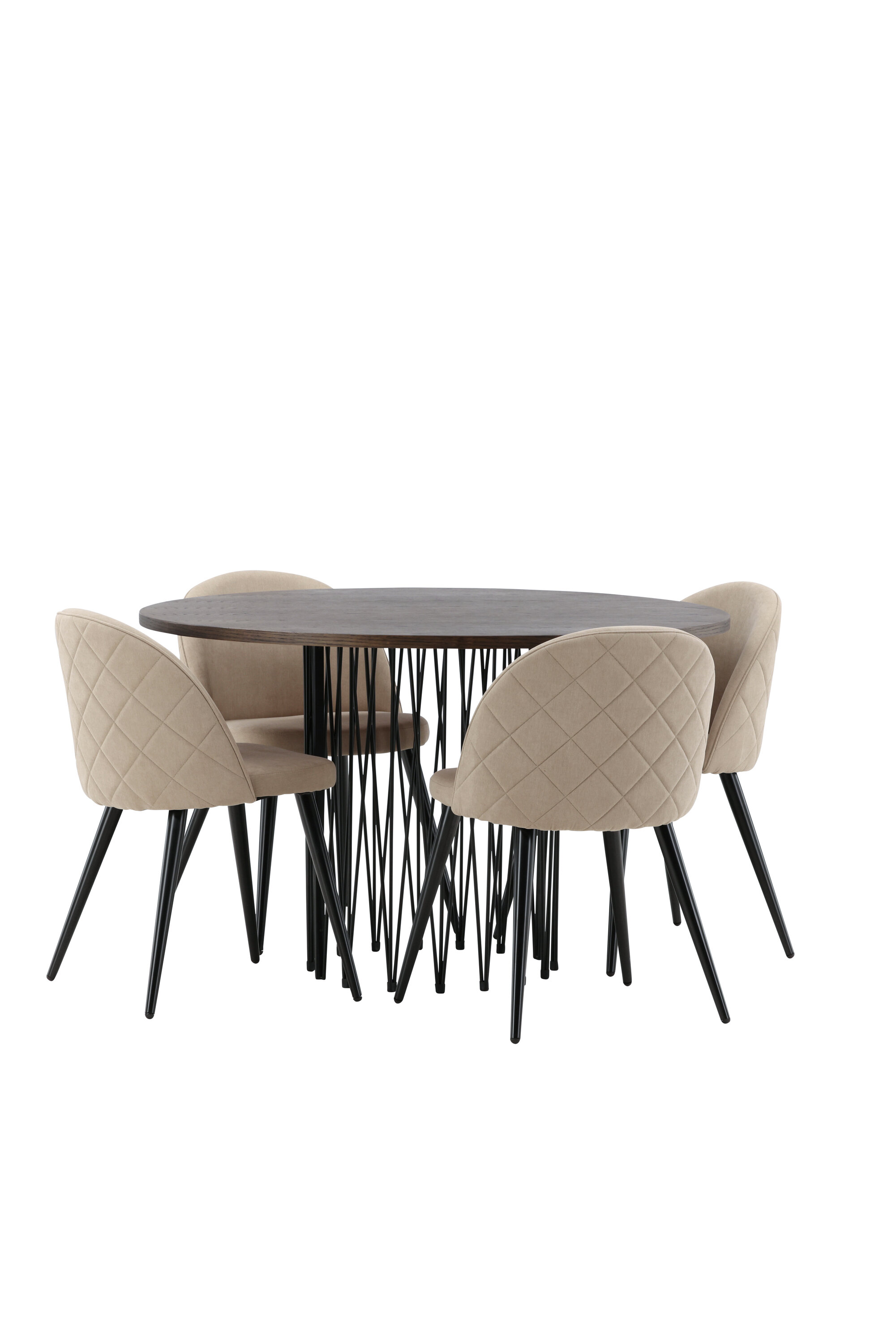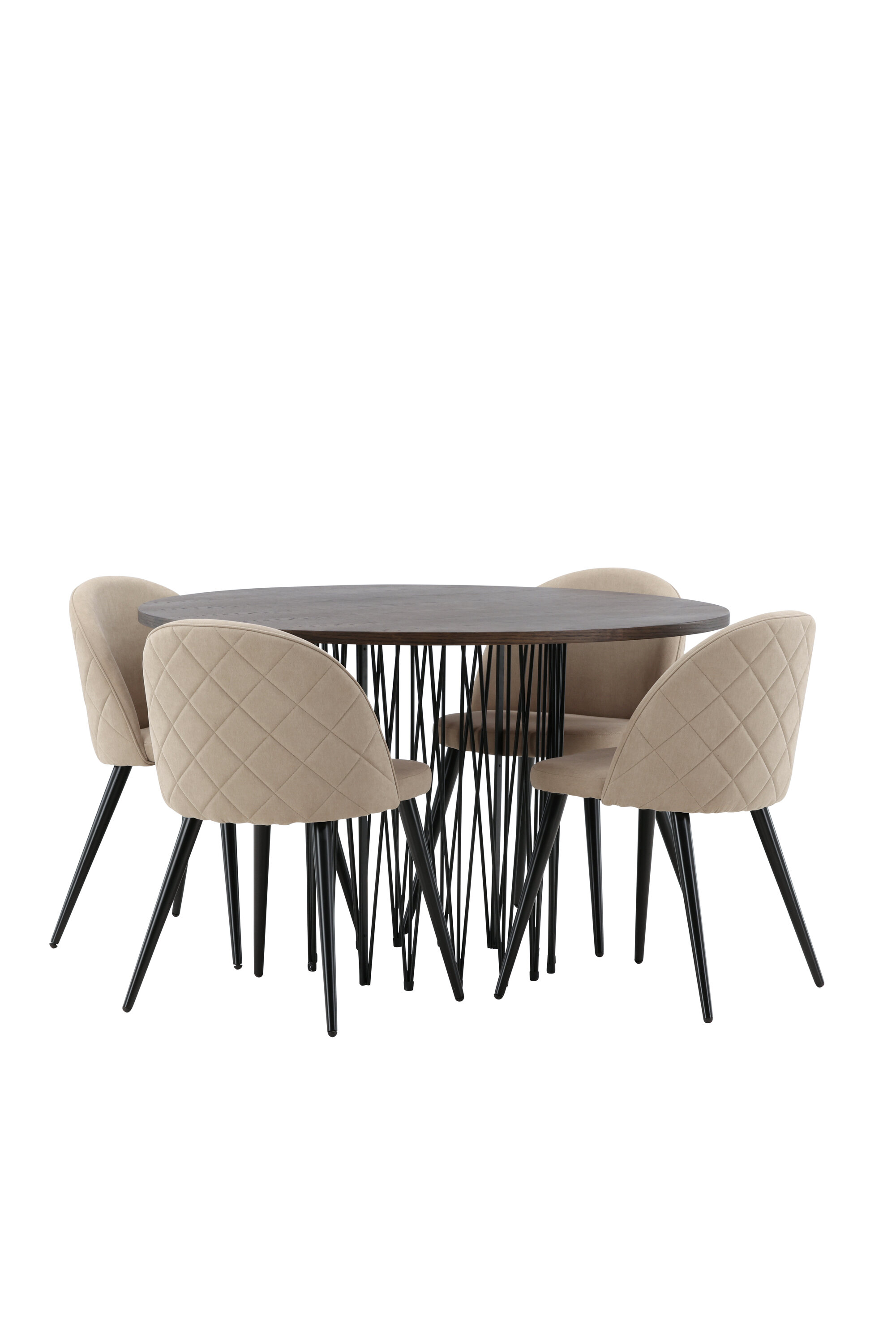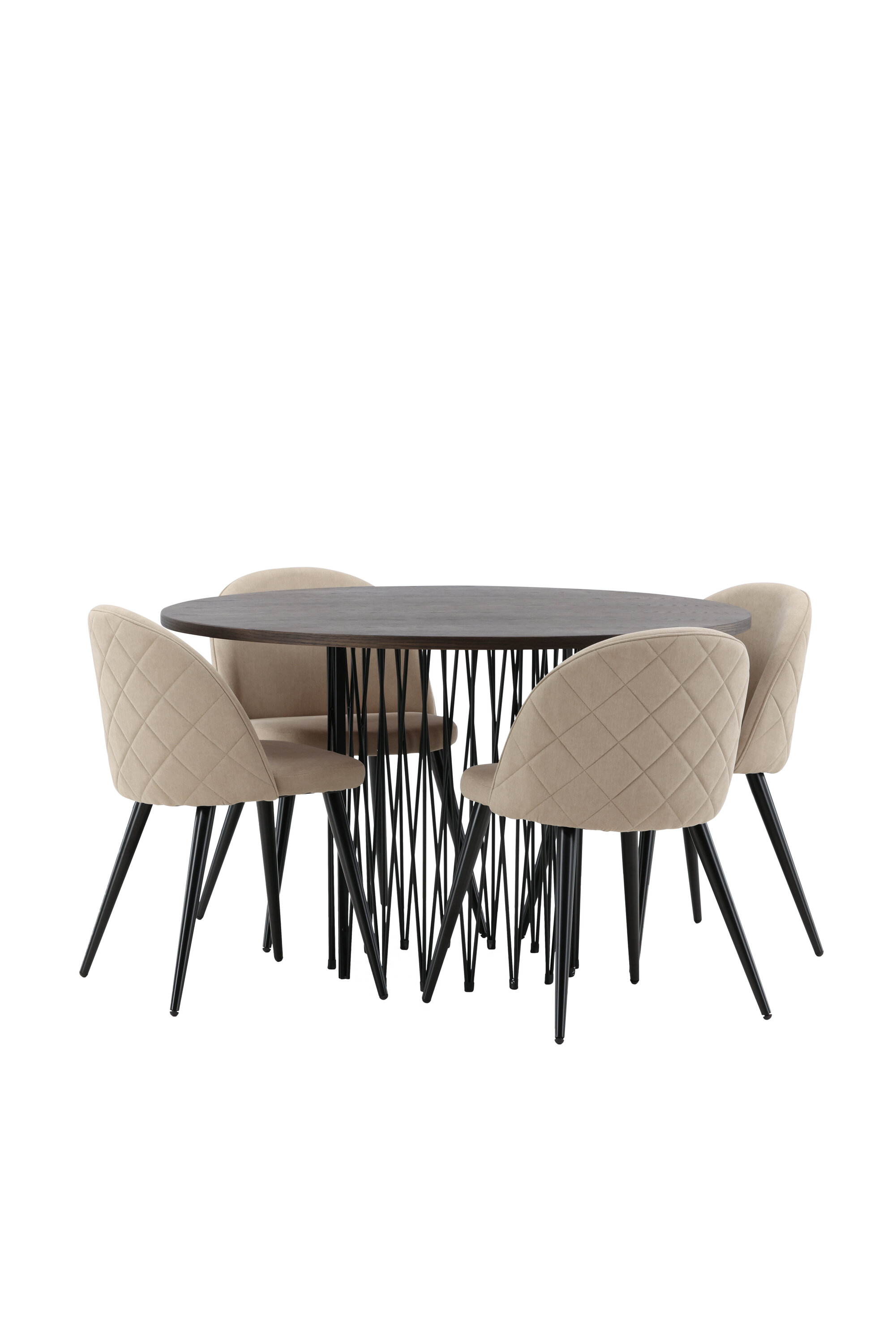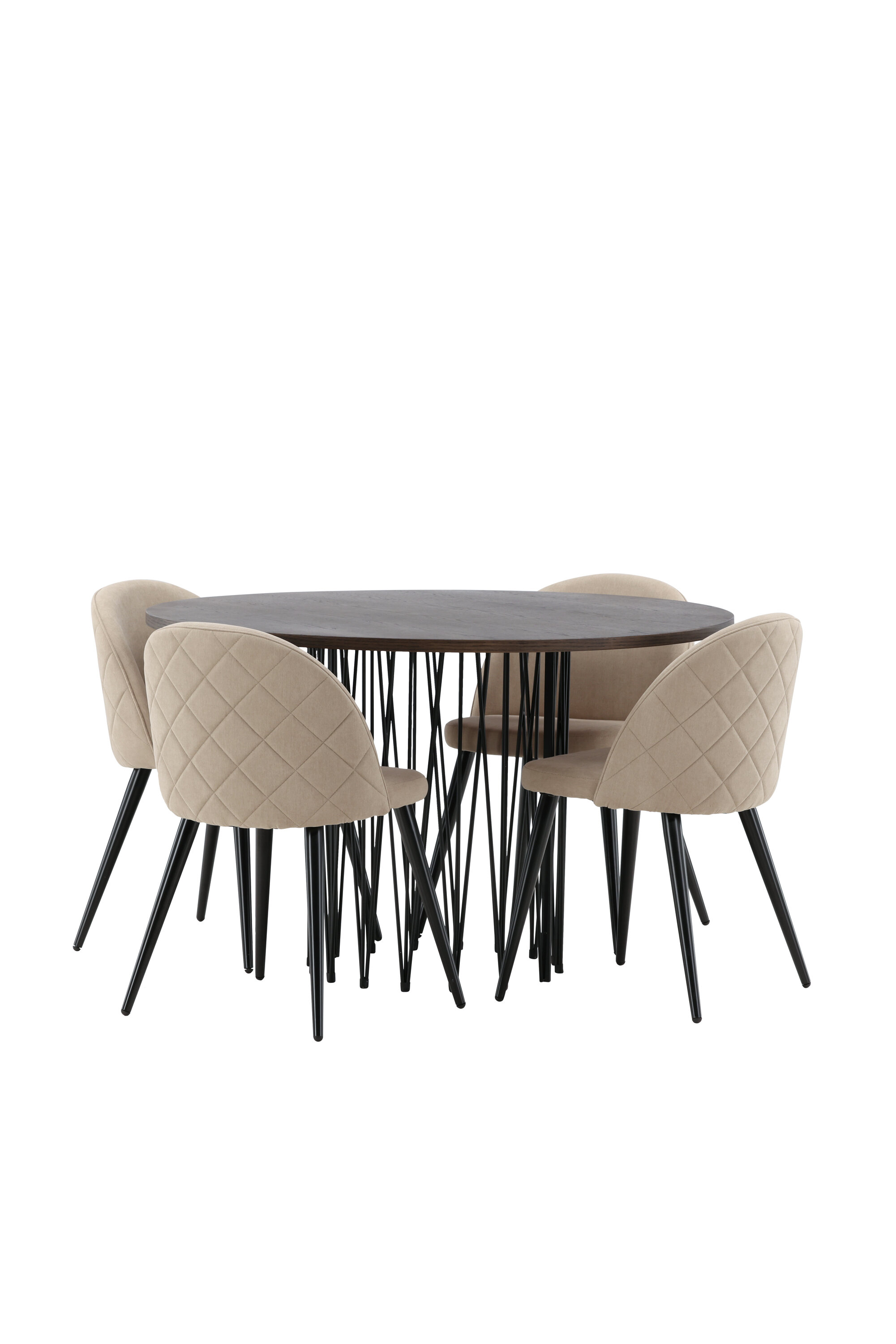 Vältige kompromisse stiili ja mugavuse vahel! Meie ümmargune söögilaud Stone on fantastilise skandinaavialiku disainiga, mis sobib rahvahulgaga. Laual on ilus pruuni värvi spooniga MDF lauaplaat ja dekoratiivne silindrikujuline mustast metallist raam. Siin koos meie populaarsete Velvet Stitches seeria söögitoolidega elegantses beežis värvitoonis. Sellel söögitoolil on täielikult polsterdatud disain, pehmest polüesterkangast kergelt ümardatud seljatugi ja iste ning mustast pulbervärvitud metallist jalad. Loo võluv keskpunkt, et koguda perekond!