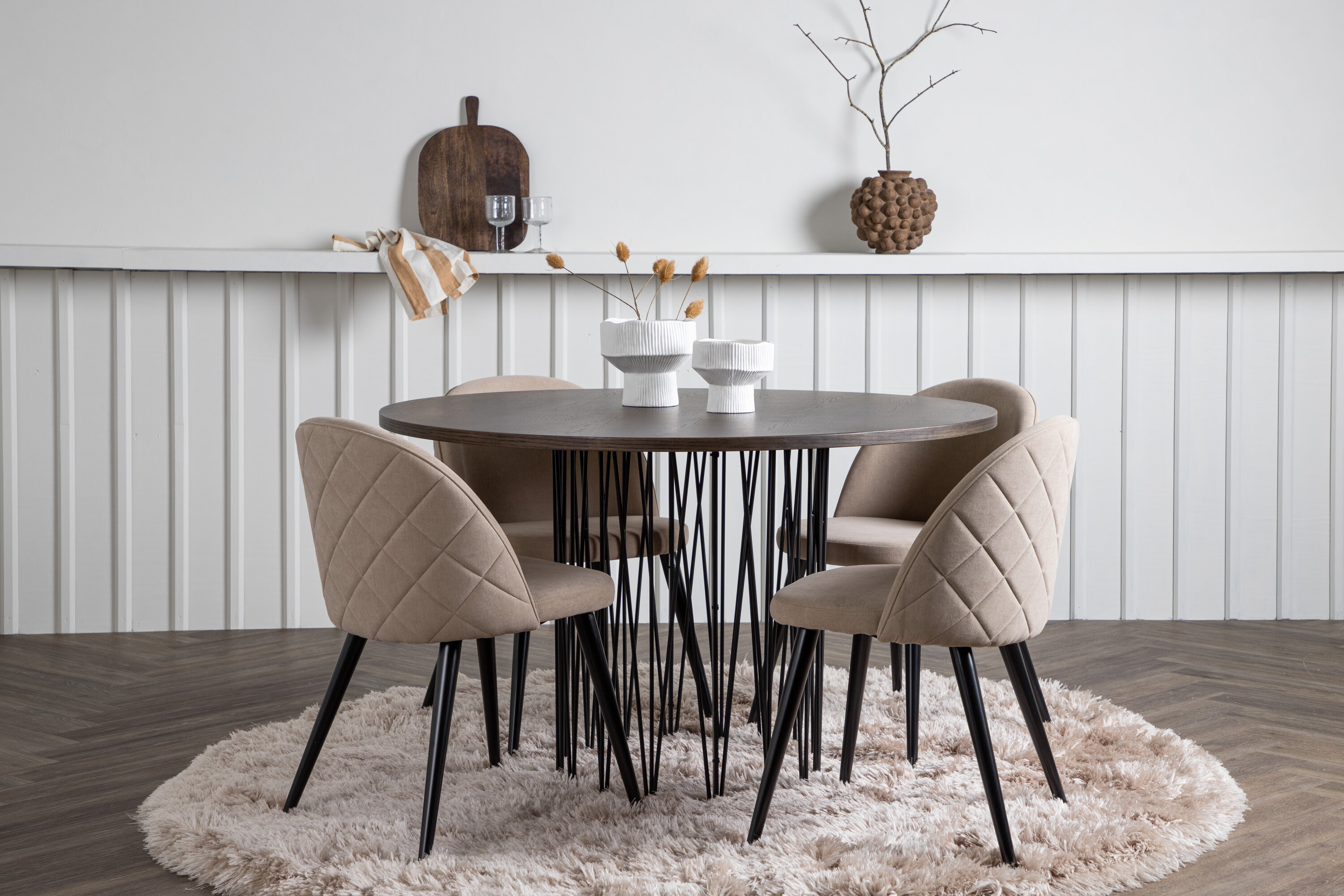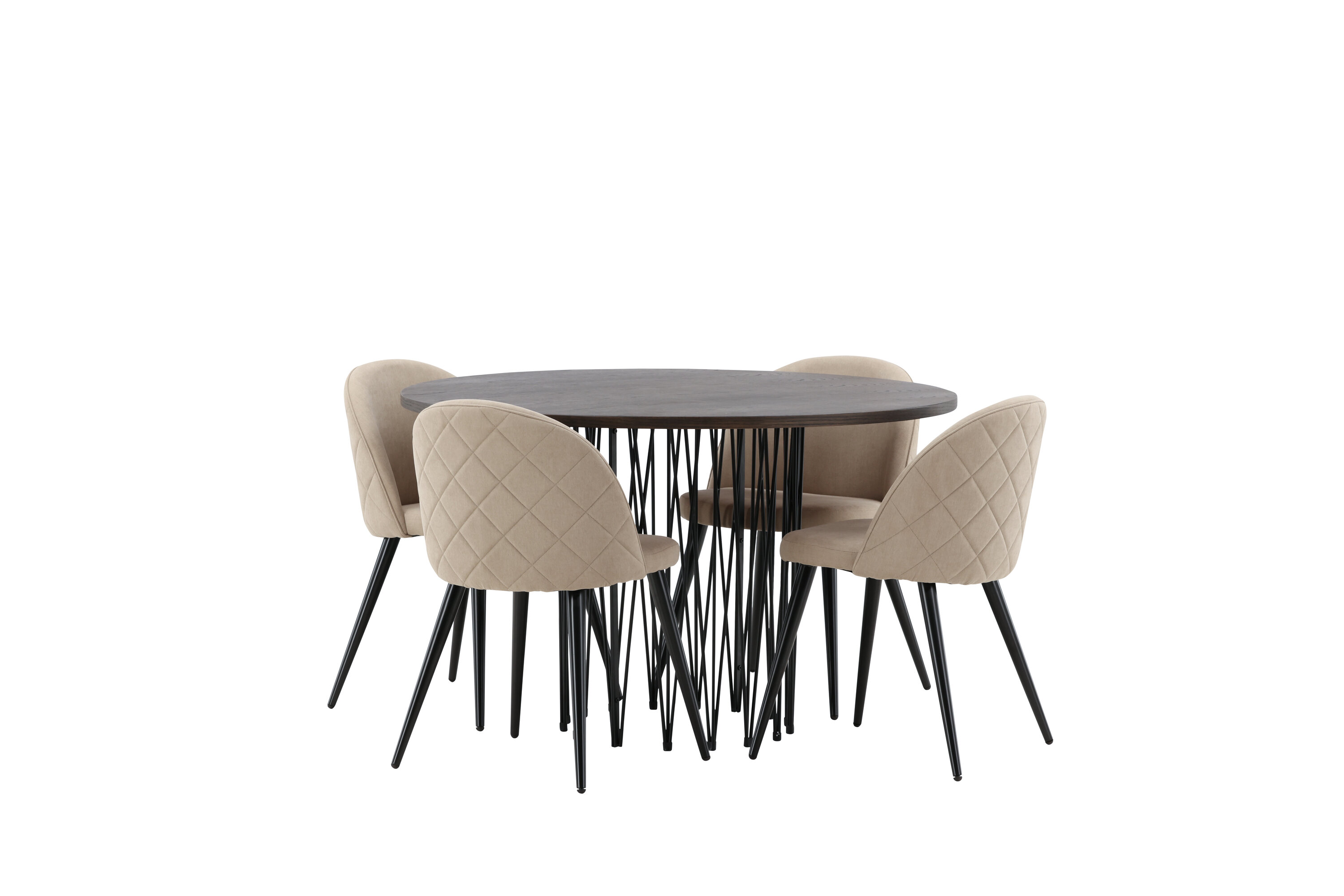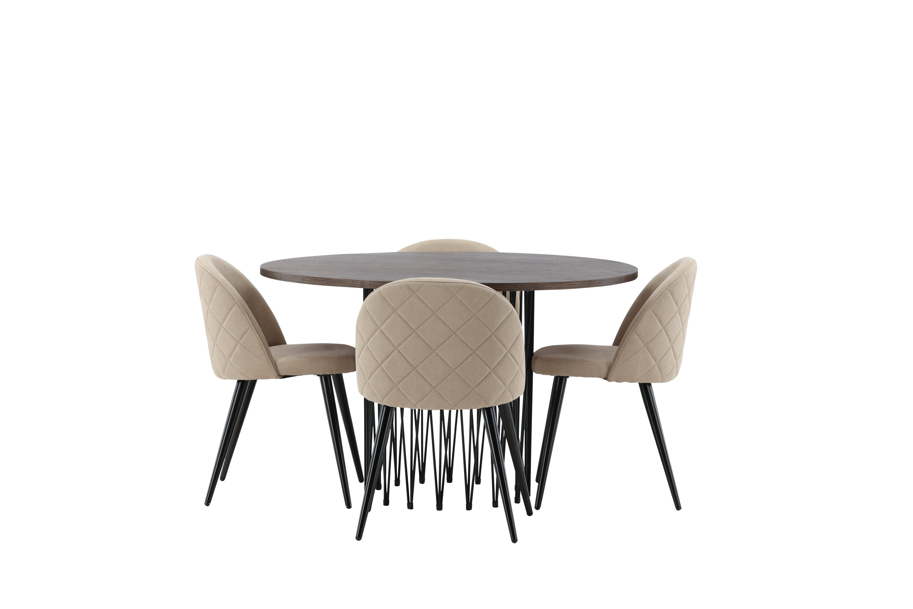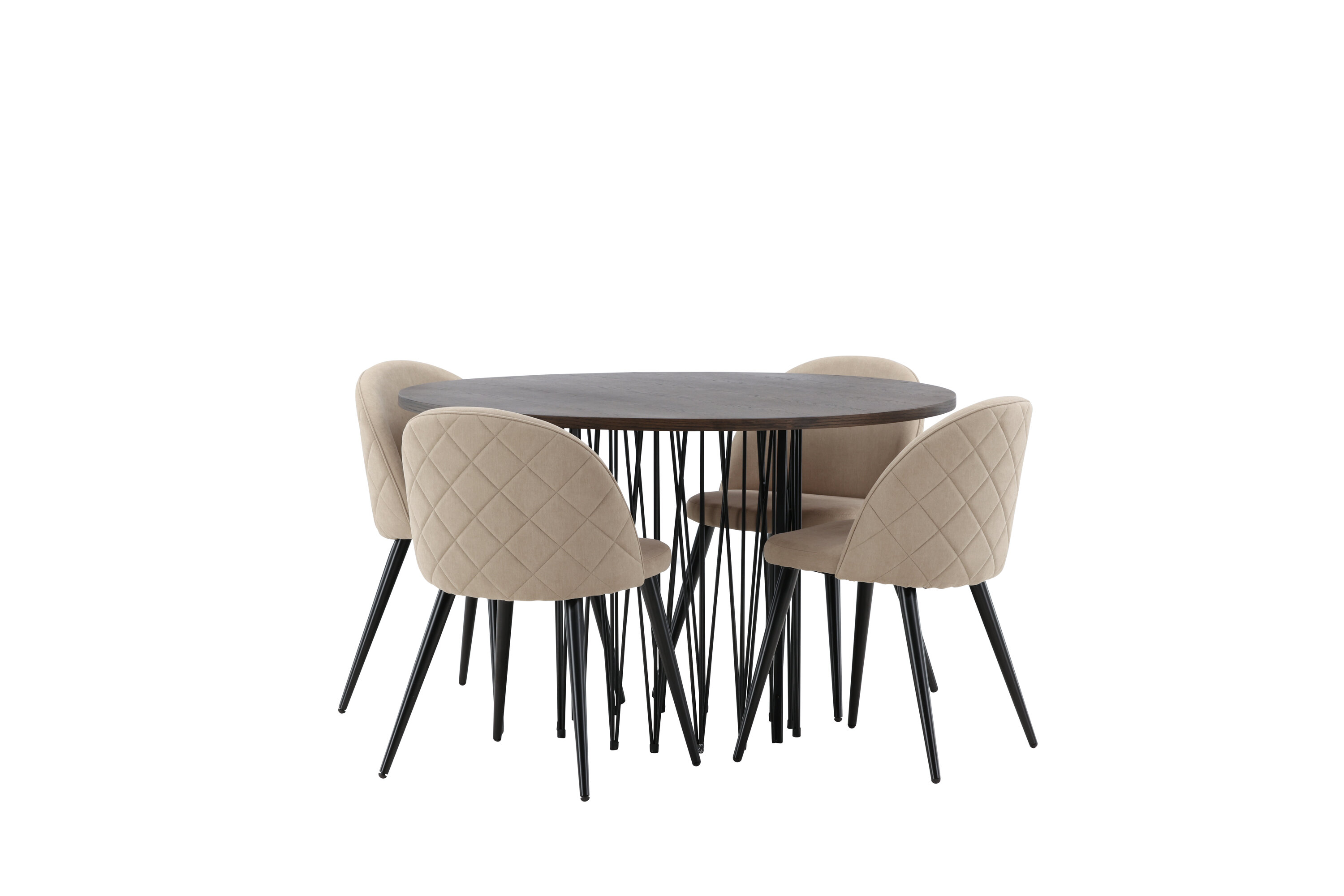 Vältige kompromisse stiili ja mugavuse vahel! Meie ümmargune söögilaud Stone on fantastilise skandinaavialiku disainiga, mis sobib rahvahulgaga. Laual on ilus pruuni värvi spooniga MDF lauaplaat ja dekoratiivne silindrikujuline mustast metallist raam. Siin koos meie populaarsete Velvet Stitches seeria söögitoolidega elegantses beežis värvitoonis. Sellel söögitoolil on täielikult polsterdatud disain, pehmest polüesterkangast kergelt ümardatud seljatugi ja iste ning mustast pulbervärvitud metallist jalad. Loo võluv keskpunkt, et koguda perekond!
