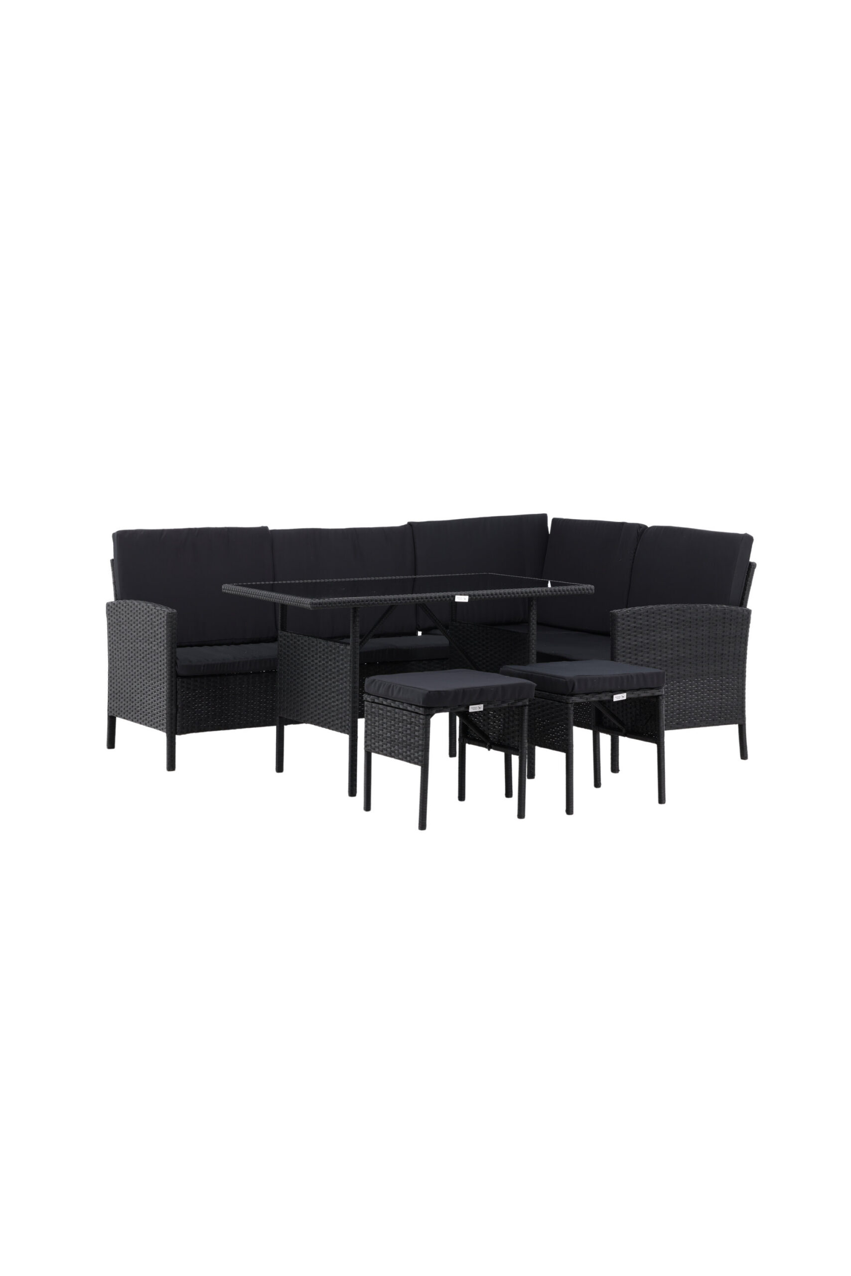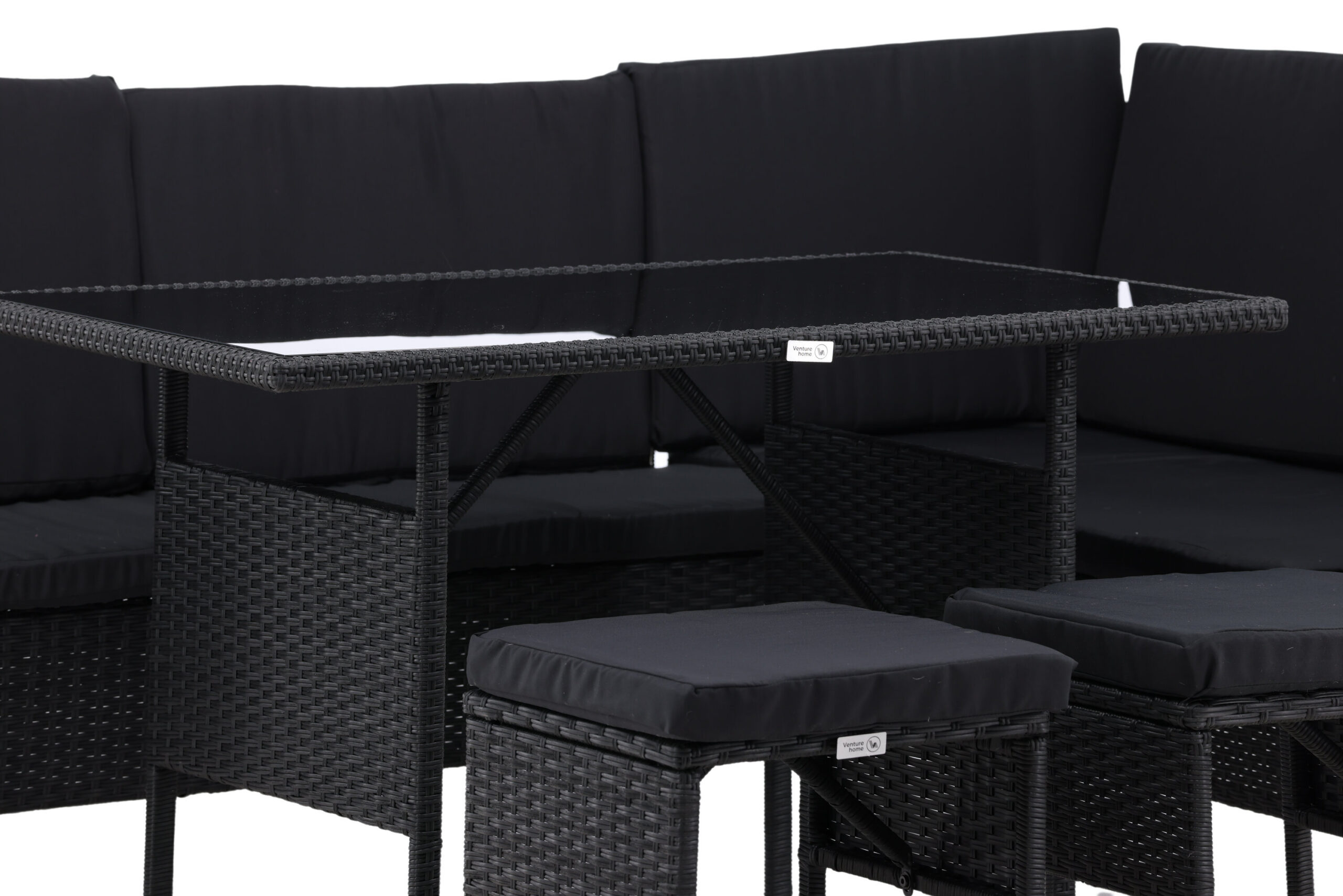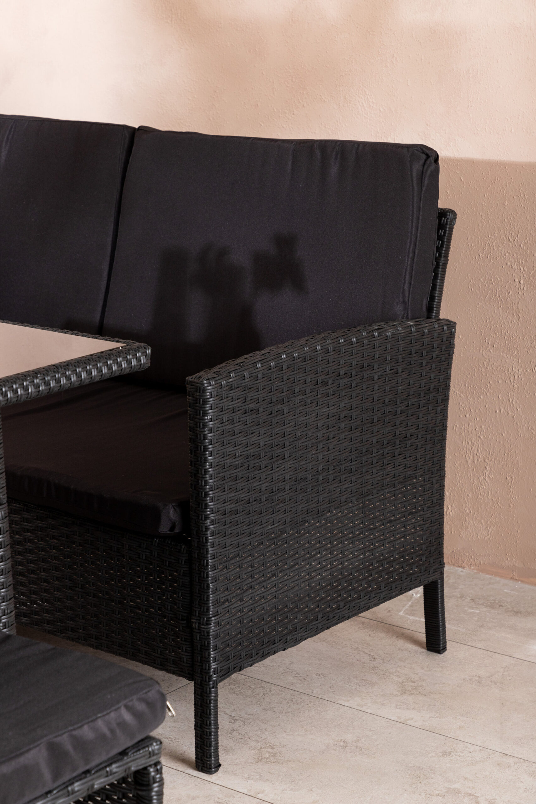 Knock-diivanirühm sobib suurepäraselt teie siseõuele või siseõuele ning on loodud, keskendudes mugavusele ja ajatule kujundusele. Diivanigrupp koosneb mustast kunstrotangist nurgadiivanist nelja istme ja ühe nurgaosaga, kahest kukest ja kõrgemast kunstrotangist lauast koos klaaslauaga. Mustad padjad kuuluvad diivanigruppi ja aitavad kaasa kutsuva tunde loomisele!