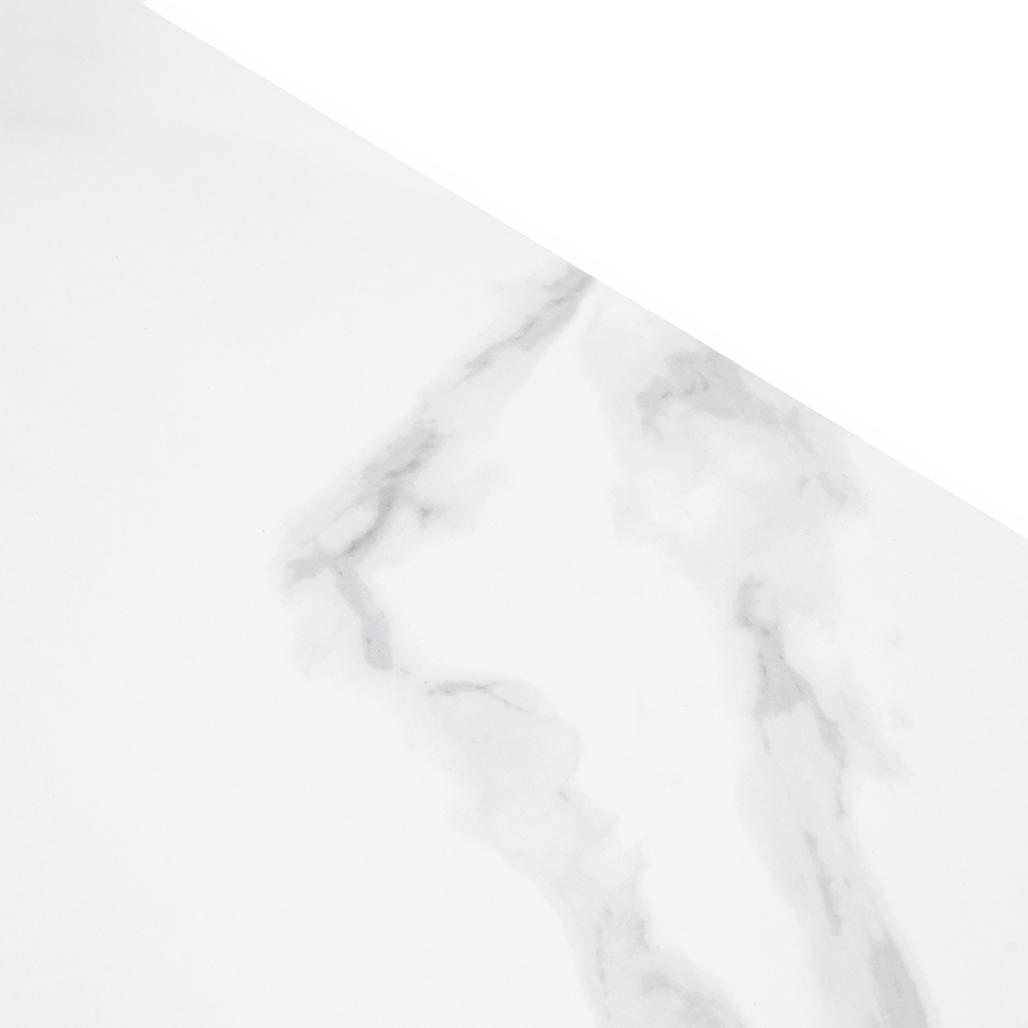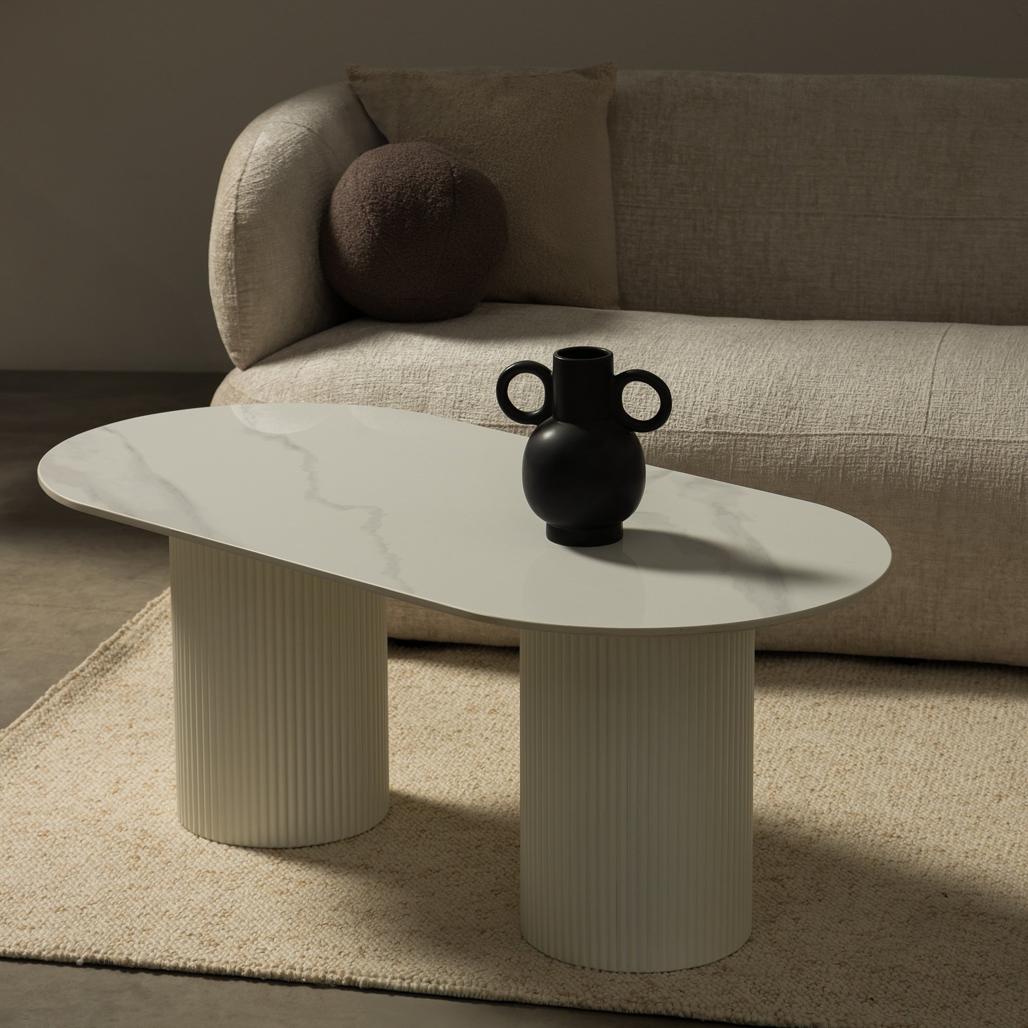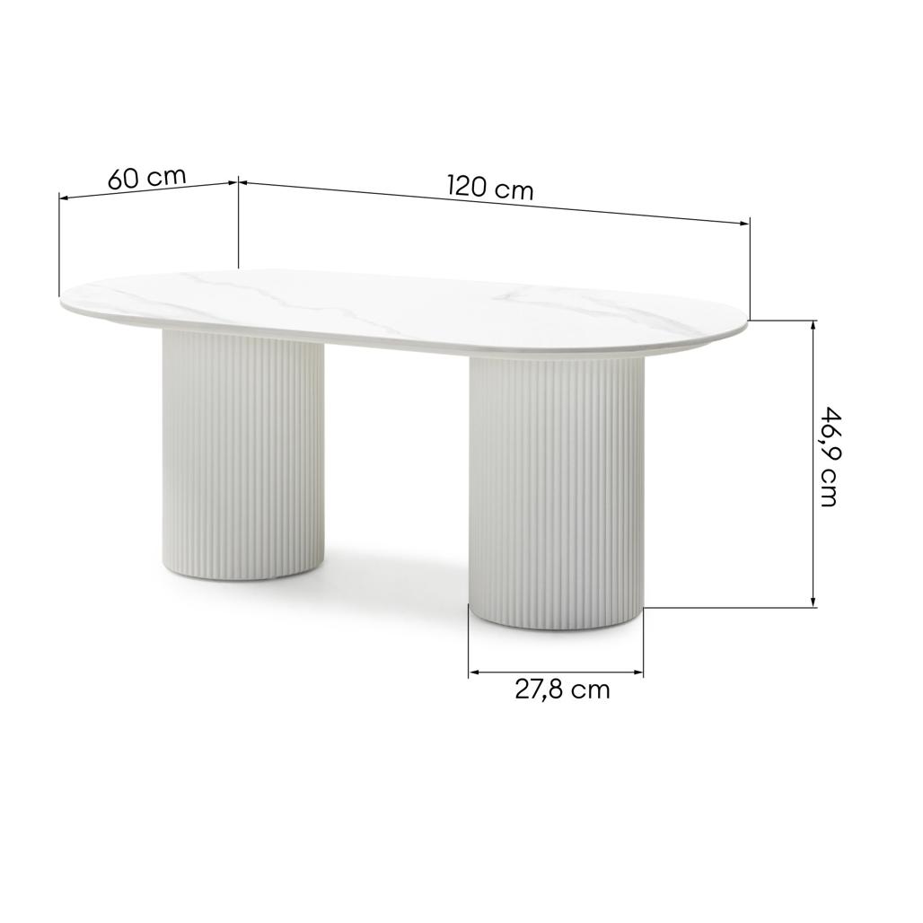 MARBELLA ovaalne kohvilaud 120 cm marmoriefekt paagutatud kivi soonelised jalad See ovaalne kohvilaud on ideaalne stiili ja funktsionaalsuse segu mis on loodud teie eluruumi täiustama. Selle kõrgläikega paagutatud kivist pealispind jäljendab valge marmori elegantset välimust pakkudes samal ajal erakordset vastupidavust. Dekoratiivsed soonelised jalad mis on valmistatud massiivsest MDF-ist lisavad modernset elegantsi ja tagavad pikaajalise stabiilsuse. Peamised omadused Ovaalne lauaplaat valge marmoriefektiga Paagutatud kivist pealispind: valmistatud täielikult looduslikest materjalidest ja vastupidav kriimustustele plekkidele UV-kiirtele ja kõrgetele temperatuuridele Massiivsest MDF-ist jalad dekoratiivsete sooneliste detailidega Läikiv viimistlus lauaplaadil Ajatu elegants kohtub igapäevase praktilisusega Olenemata sellest kas naudite hommikukohvi või võõrustate külalisi lisab see laud nii visuaalset atraktiivsust kui ka igapäevast kasulikkust. Rafineeritud marmorilaadne pind pakub luksust tegemata järeleandmisi hoolduses. Selle soonelised jalad pakuvad skulpturaalset elementi samas kui üldine vorm säilitab pehme ja kutsuva ilme. Aupaklik mööbliese mis sobib hõlpsasti erinevate interjööri stiilidega alates kaasaegsest kuni klassikaliseni. Materjalid Alus: MDF Lauaplaat: paagutatud kivi Mõõtmed Kõrgus: 46 9 cm Laius: 120 cm Sügavus: 60 cm