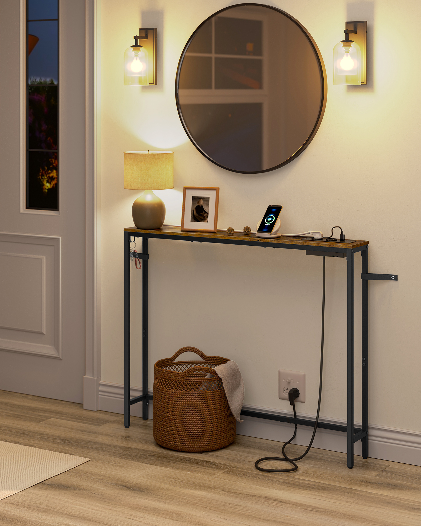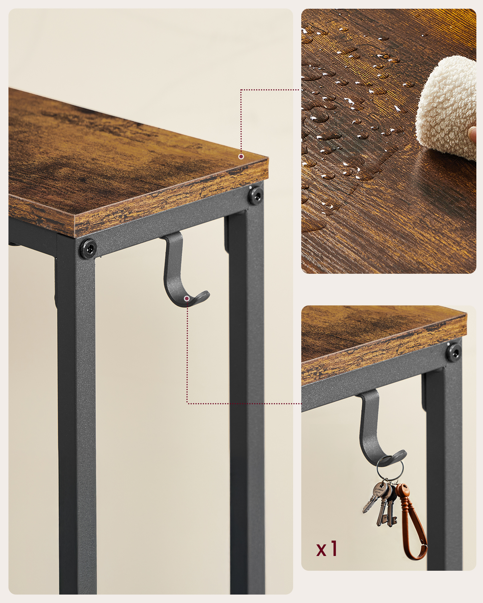 Toote üksikasjad: – Värvus: Vintage pruun-tindimust – Materjal: puitlaastplaat, teras – Mõõtmed: 15 x 100 x 80 cm (S x L x K) – Kaal: 4,5 kg – Maksimaalne staatiline kandevõime: 30 kg Pakisisu: – 1 x konsoollaud – 1 x tarvikute komplekt – 1 x kasutusjuhend – 1 x ümberkukkumisvastane komplekt