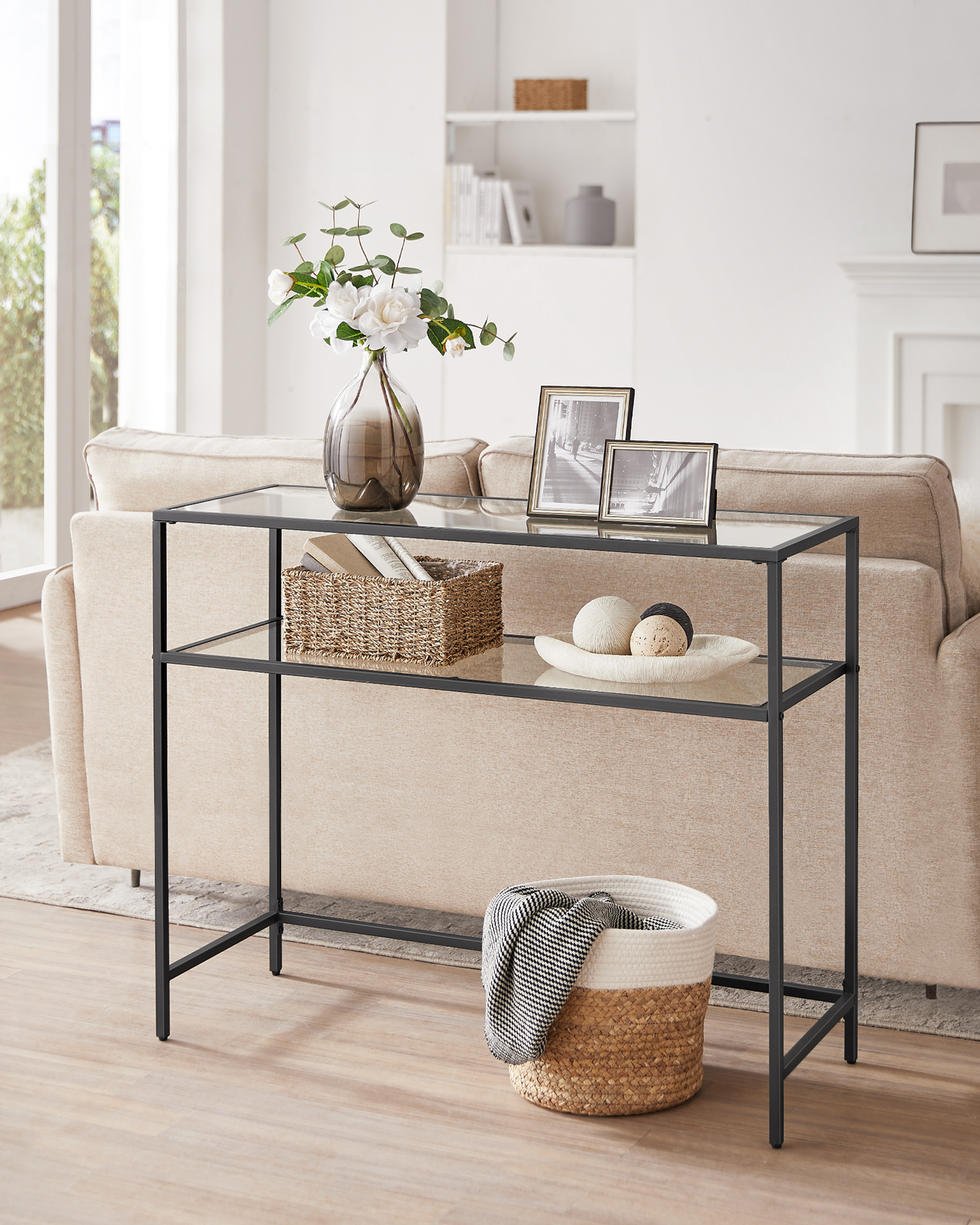 Spetsifikatsioonid: Värvus: Must Materjal: Teras, klaas Toote mõõdud: 100 x 35 x 80 cm (39,4 tolli P x 13,8 tolli L x 31,5 tolli K) Toote kaal: 13,8 kg (30,4 naela) Iga riiuli maksimaalne staatiline koormus: 20 kg (44 naela) Pakisisu: 1 x konsoollaud 1 x tarvikute komplekt 1 x juhend
