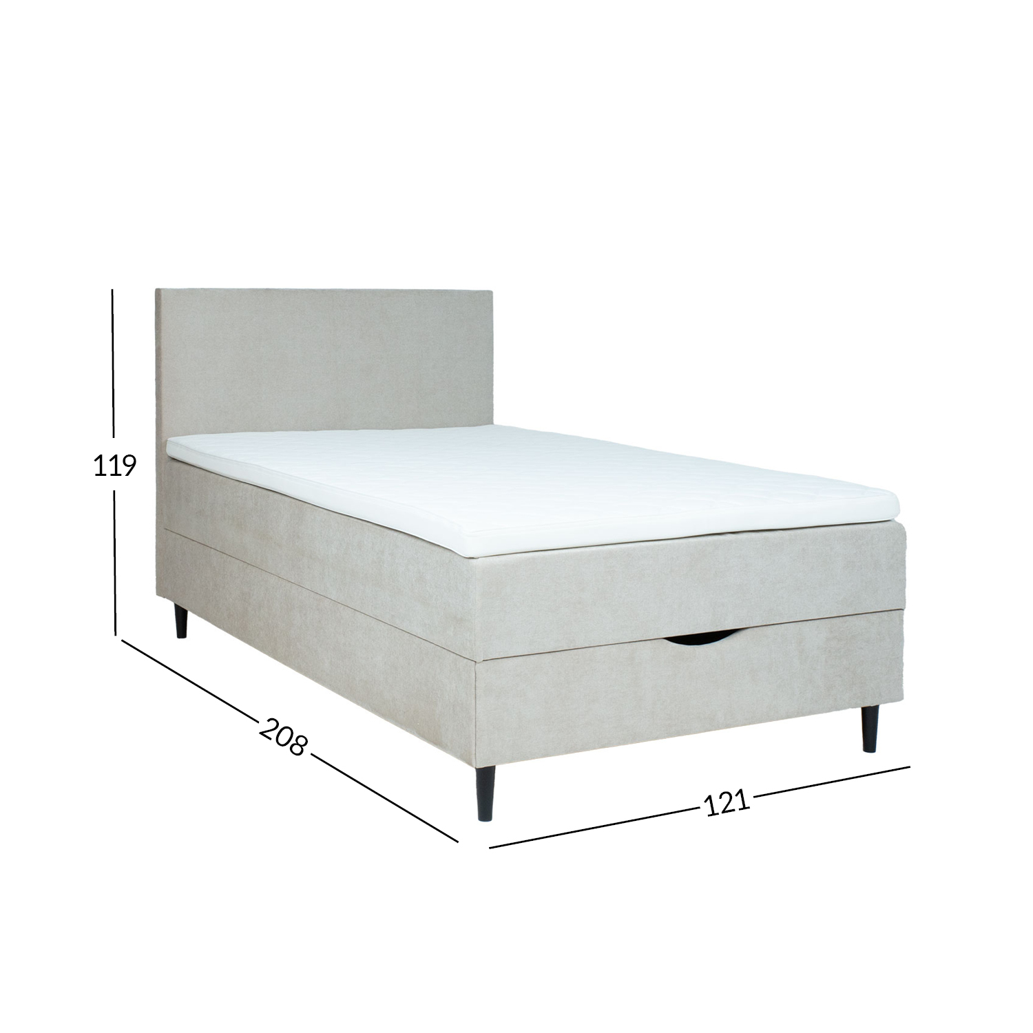Voodi kattemadrats on poroloonist ja selle paksus on 7cm. Kattemadratsi all asub pocket-vedrustusega madrats. 210vedru/m2, vedru kõrgus 13cm. Madratsi jäikus: keskmine. Voodi raam on valmistatud puidust, puitlaast- ja puitkiudplaadist. Voodi all asub ruumikas panipaik. Voodijalad on valmistatud puidust, 14cm kõrged. Voodipeats on voodiga sama lai, selle paksus on 7cm, kõrgus 105cm. Ühenduselemendid on lisatud. Voodi on kaetud kangaga, 30 000 Martindale´i. Voodi kõrgus maast on 70cm. Toote mõõdud on 121x208xH119cm. Toode on valmistatud EL-is.