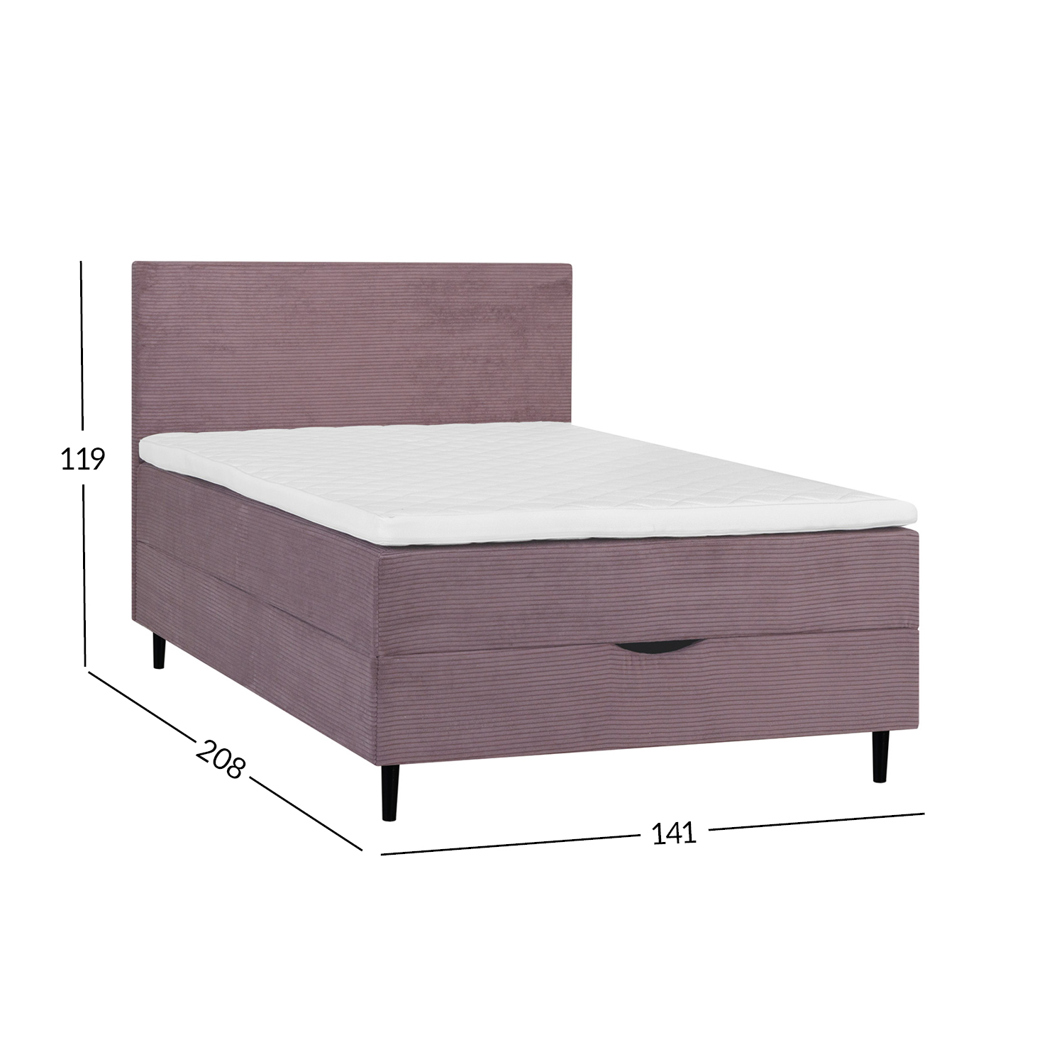 Voodi kattemadrats on poroloonist ja selle paksus on 7cm. Kattemadratsi all asub pocket-vedrustusega madrats. 210vedru/m2, vedru kõrgus 13cm. Madratsi jäikus: keskmine. Voodi raam on valmistatud puidust, puitlaast- ja puitkiudplaadist. Voodi all asub ruumikas panipaik. Voodijalad on valmistatud puidust, 14cm kõrged. Voodipeats on voodiga sama lai, selle paksus on 7cm, kõrgus 105cm. Ühenduselemendid on lisatud. Voodi kõrgus maast on 70cm. Toote mõõdud on 141x208xH119cm.