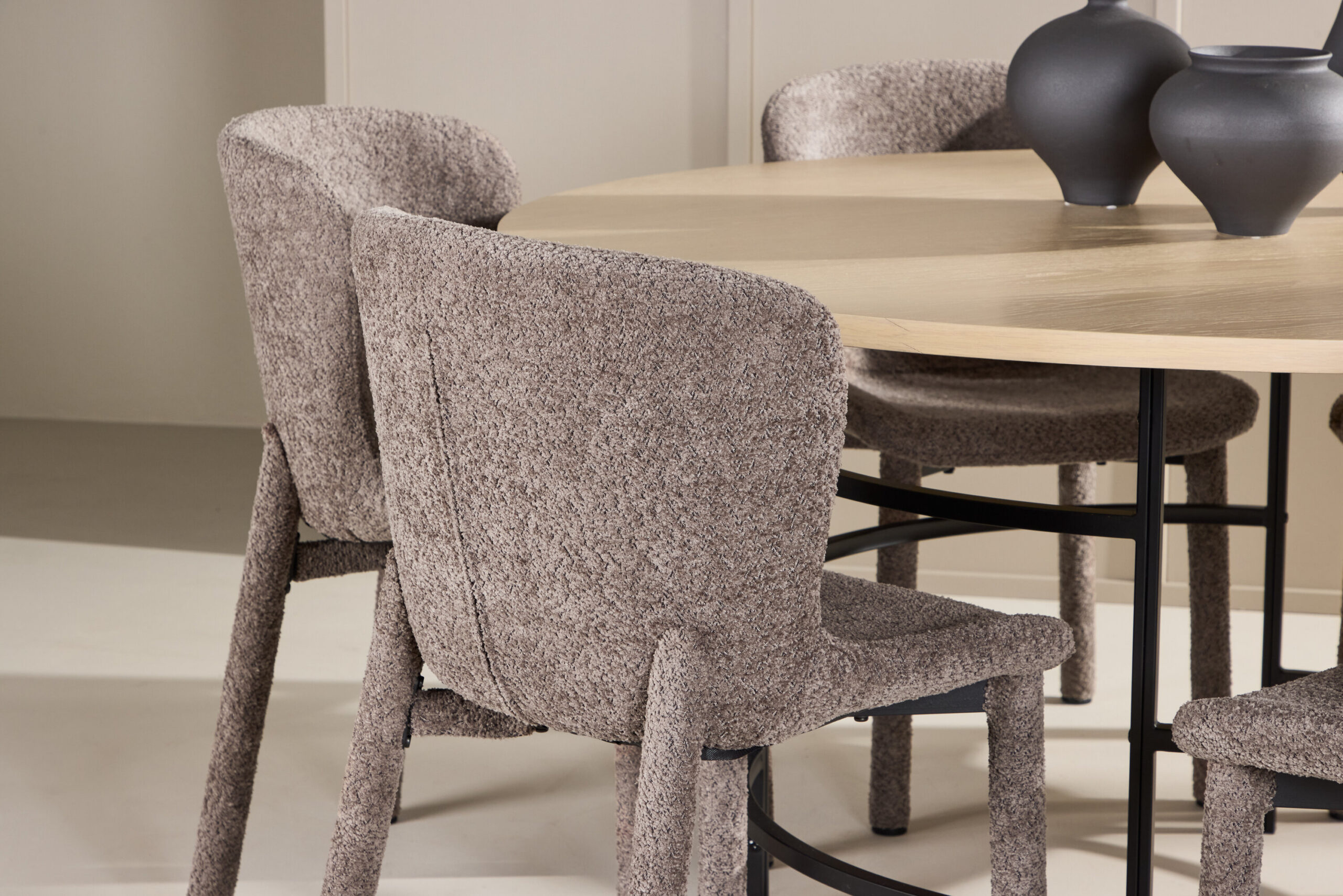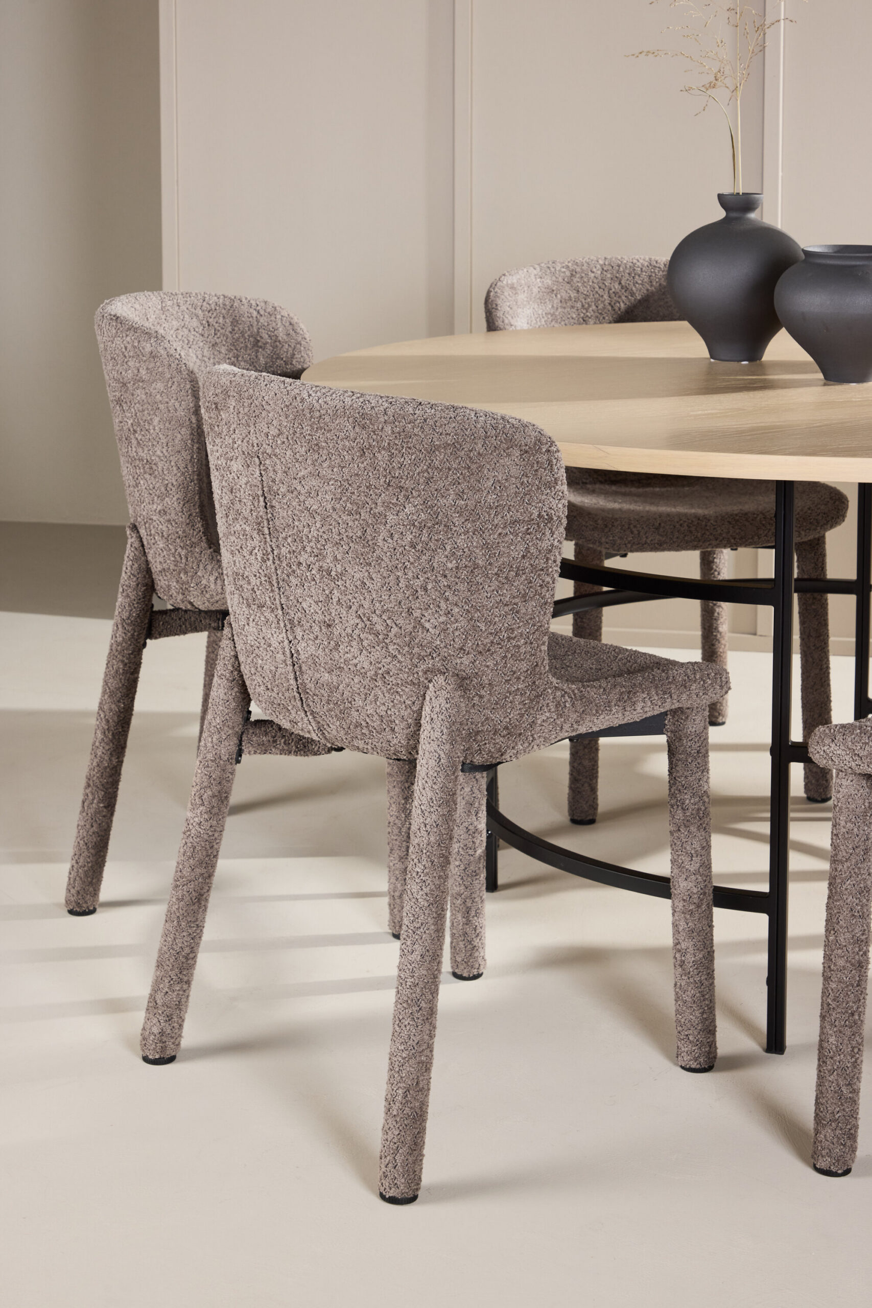 Lauaga on kaasas Astoria söögitoolid, mis on polsterdatud elegantse pruuni boucléga. Toolid õhkuvad soojust ja pakuvad mugavust oma rikkaliku tekstuuriga bouclé-kangaga. Sügavpruun toon ja pehme pind jätavad luksusliku ja külalislahke mulje, samas kui peen tekstuur sulandub sujuvalt nii kaasaegsesse kui ka klassikasse. Maksimaalse mugavuse tagamiseks loodud toolidel on kallistav seljatugi ja pehme istmepadi, mis muudab need ideaalseks pikkadeks ja lõõgastavateks eineteks.