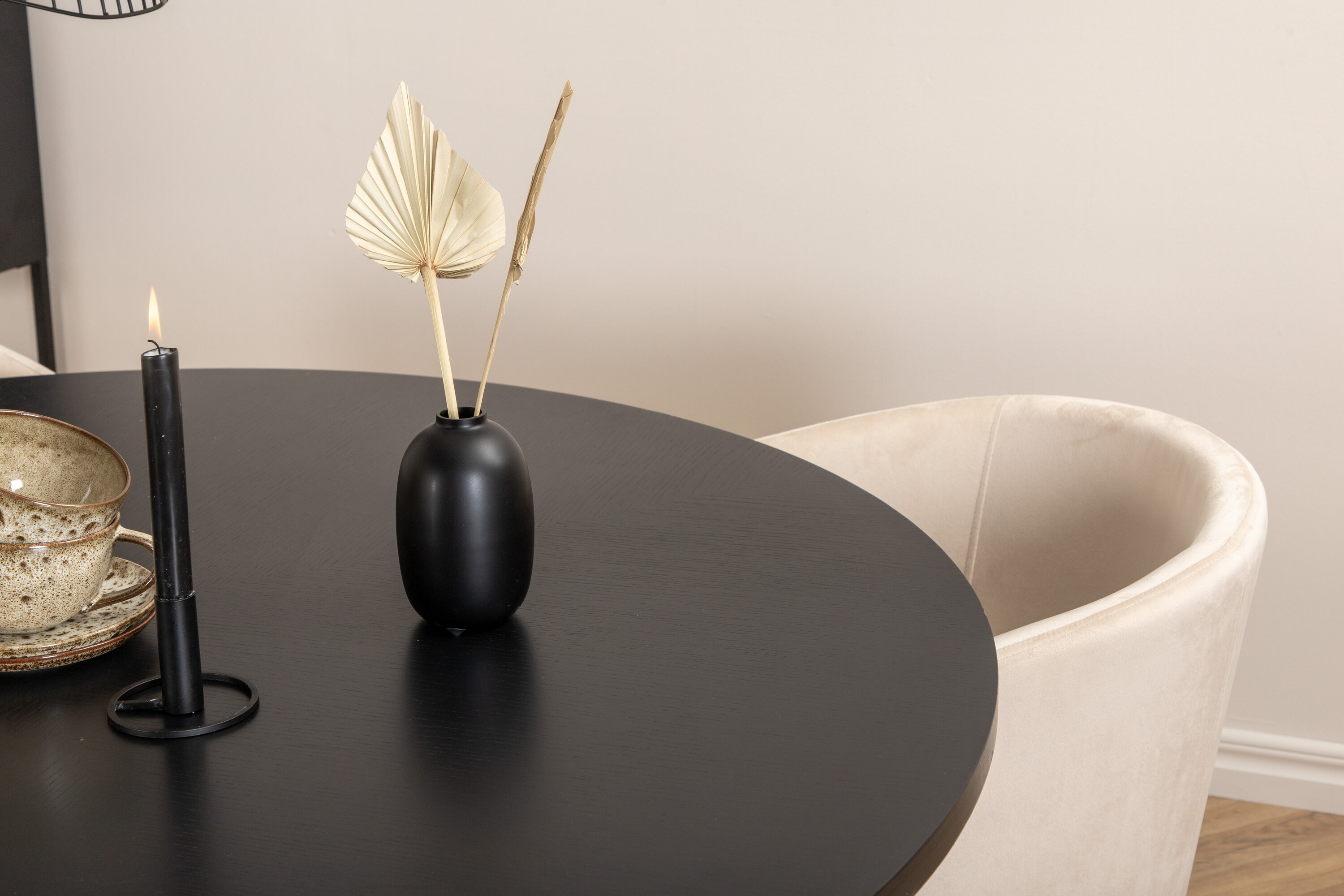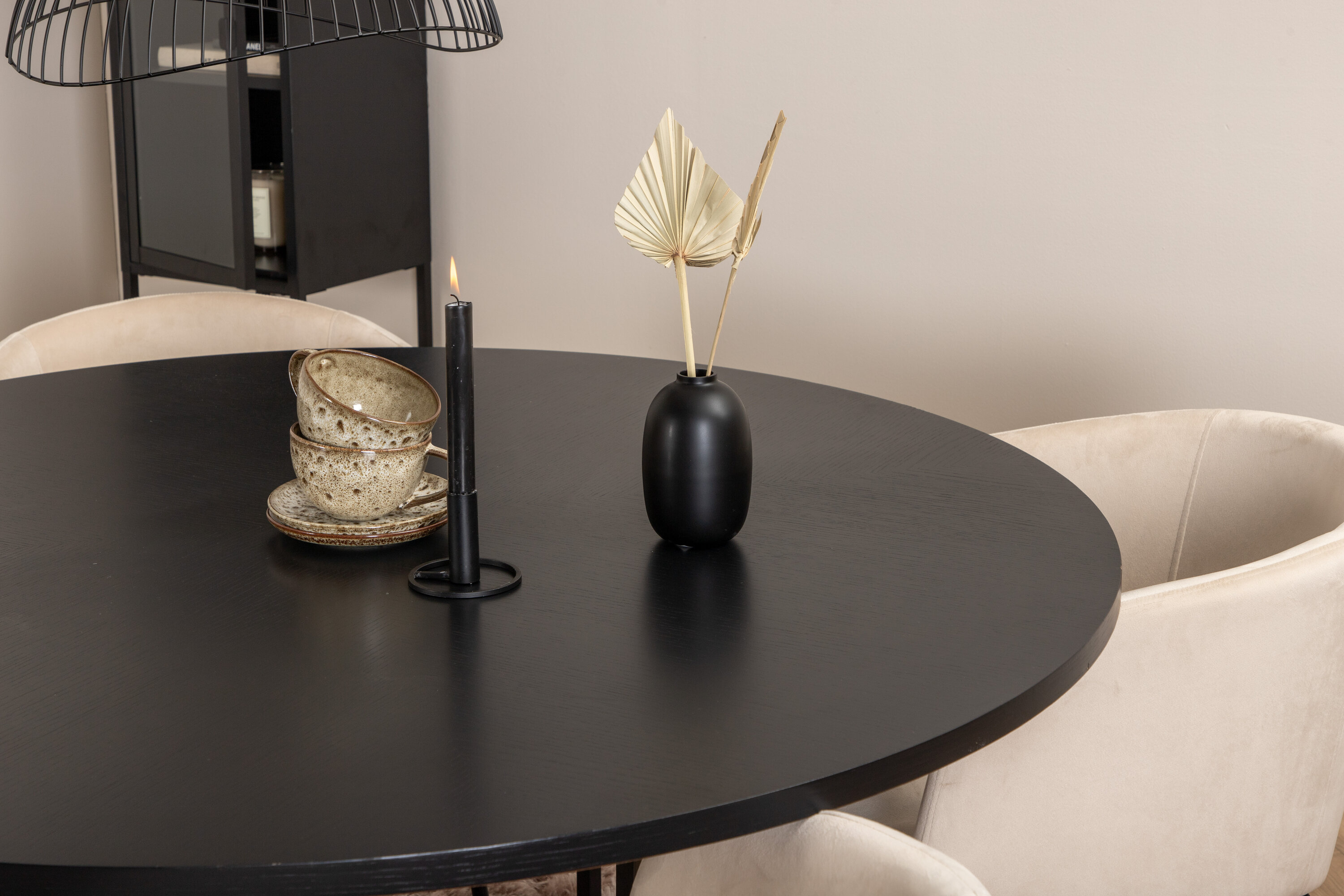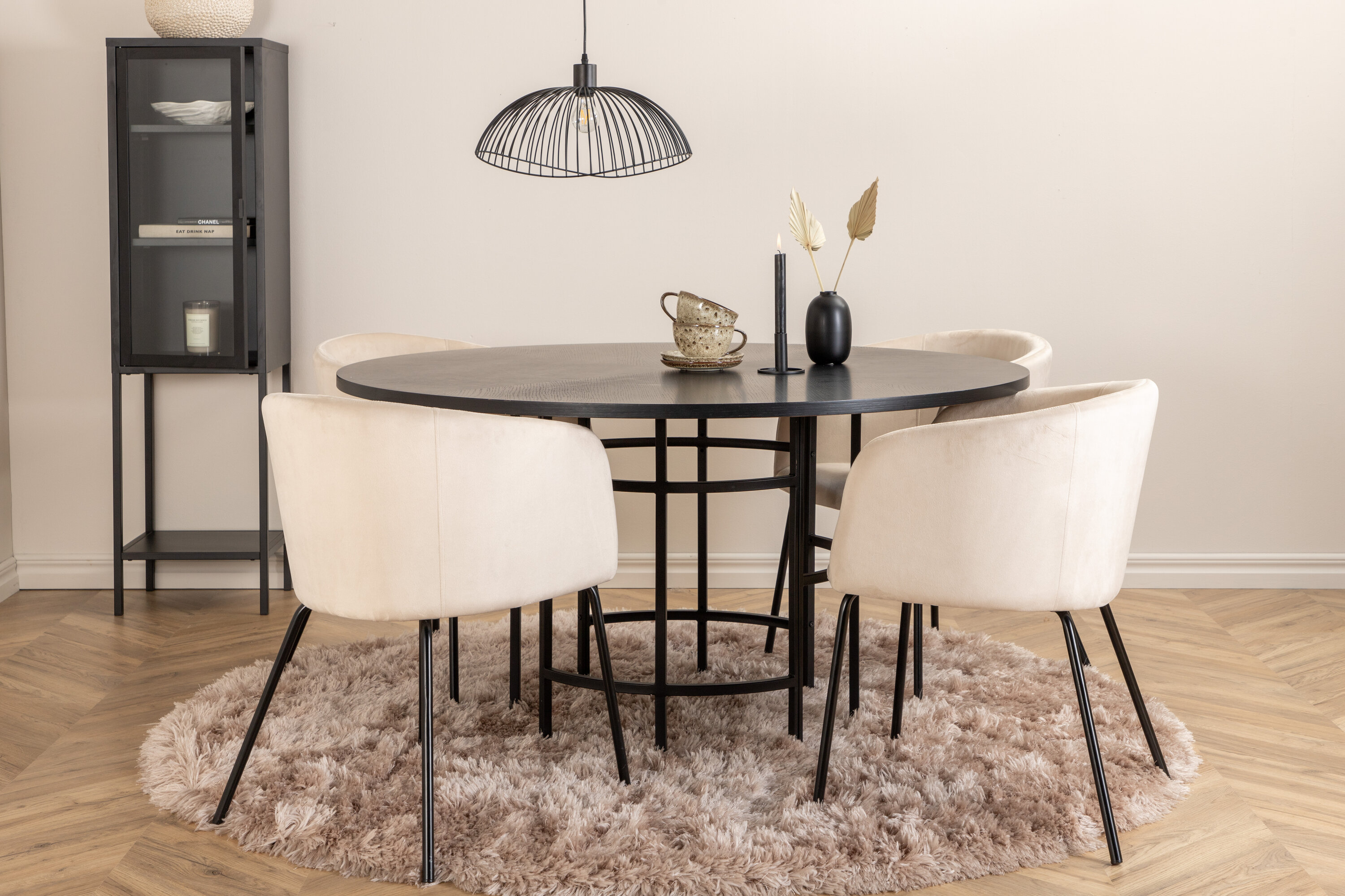 Looge moodsa välimusega ümmarguse toidugrupiga võluv keskpunkt kodu südames! Kopenhaageni söögilaud on trendikindla disainiga ühtlaselt mustas värvitoonis, spooniga MDF-plaadist lauaplaadi ja dekoratiivse silindrikujulise metallist veermikuga. Laua läbimõõt: läbimõõt: 140 cm, kõrgus: 74 cm. Siin sobib see kokku 4 luksusliku disainiga Beriti söögitooliga. Toolidel on mugav beežist sametist iste ja stiilselt kitsad rauast taburetijalad. Tooli mõõdud: kõrgus: 78 cm, istme kõrgus: 49 cm, laius: 55 cm, sügavus: 55 cm. Sisusta mõnusaks õhtusöögiks!