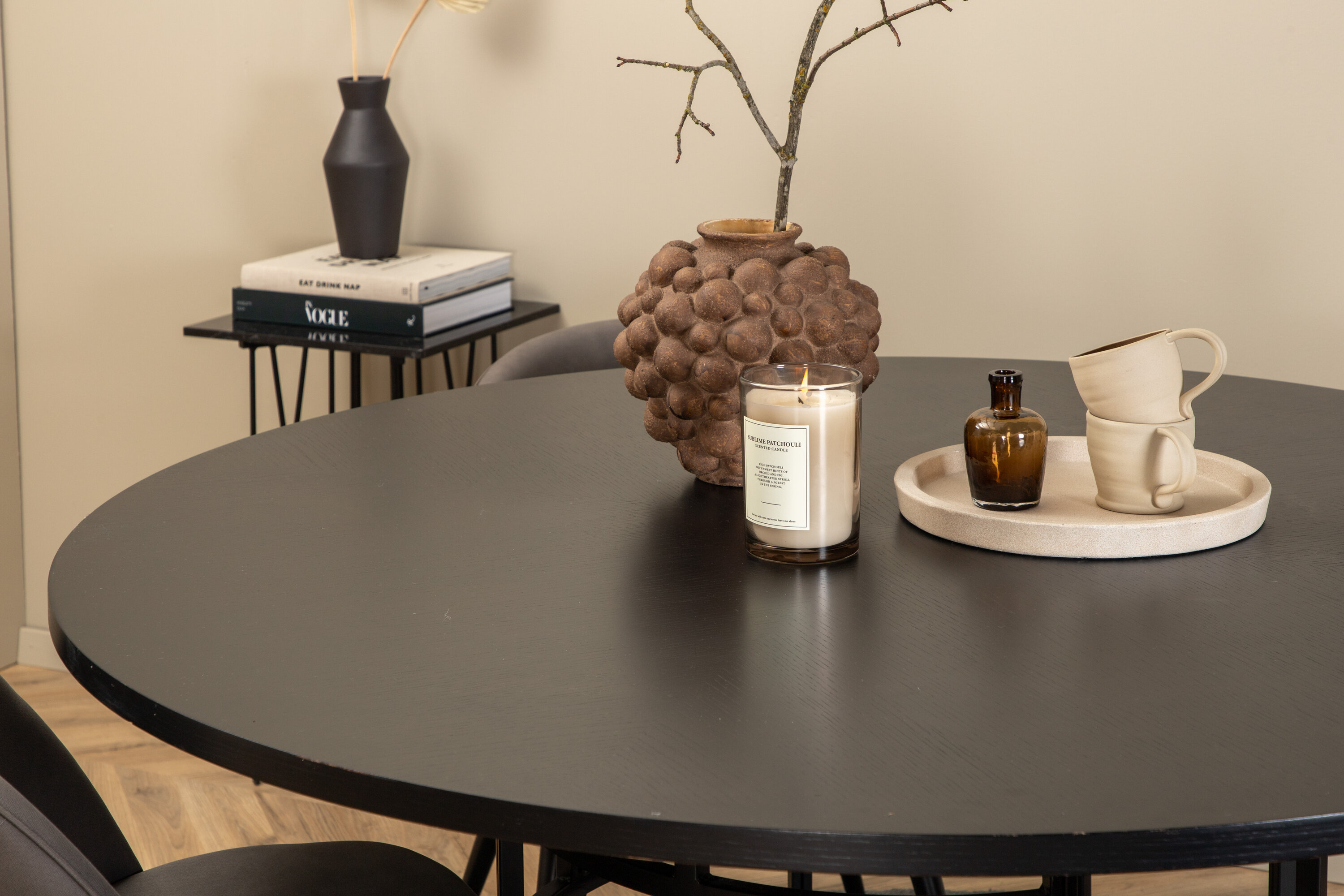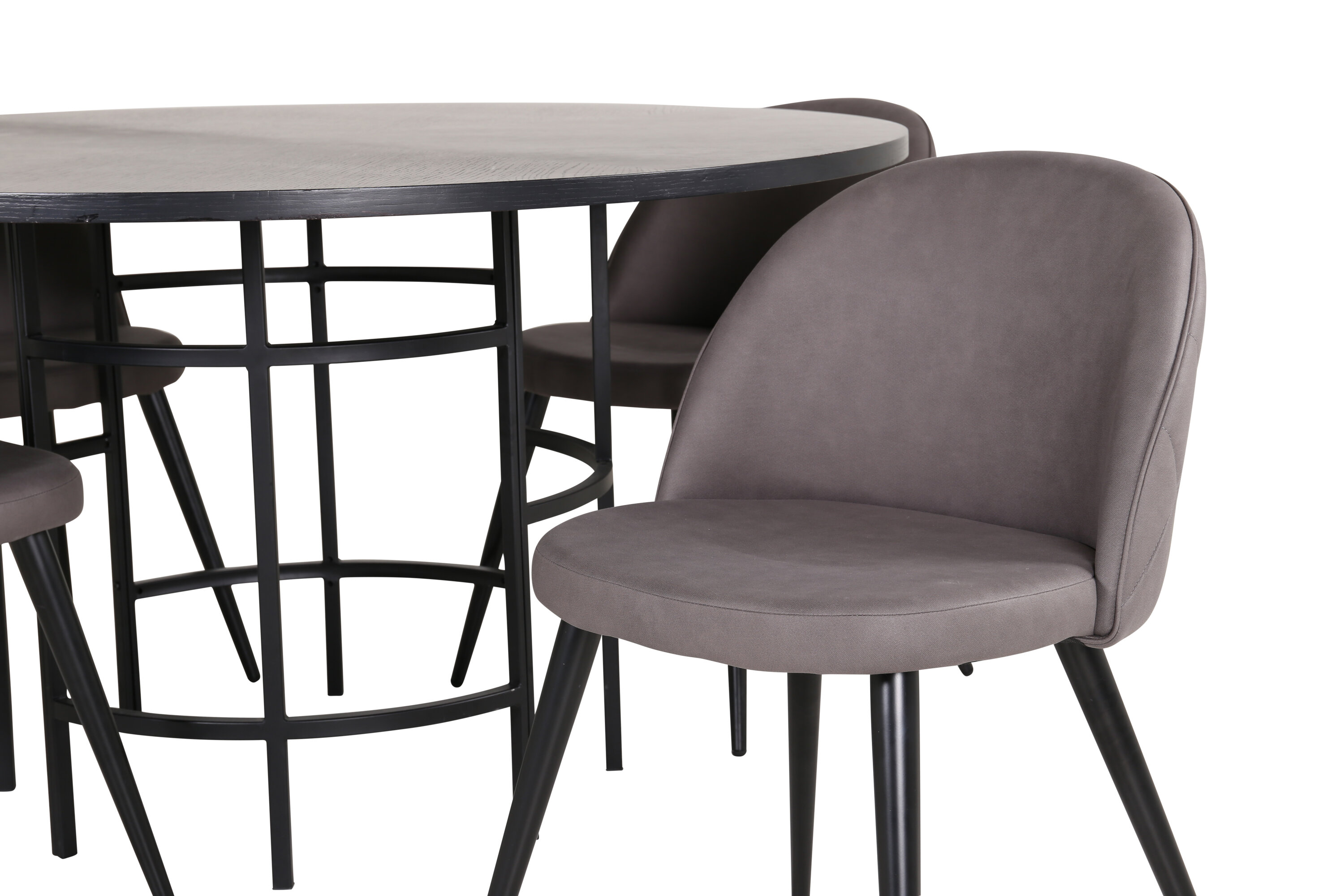 Sisustage elutuba kutsuvalt ja trendikindlalt! Kopenhaageni söögilaud on trendikindla disainiga ühtlaselt mustas värvitoonis, spooniga MDF-plaadist lauaplaadi ja dekoratiivse silindrikujulise metallist veermikuga. Laua läbimõõt: läbimõõt: 140 cm, kõrgus: 74 cm. Siin maitsev kombinatsioon 4 Velvet Stitches söögitooliga. Tooli jalad on kergesti laienevad rauast ja istmed hallid mikrokiust stiilse dekoorõmblusega. Tooli mõõdud: kõrgus: 76,5 cm, istme kõrgus: 46,5 cm, laius: 50 cm, sügavus: 57 cm. Sama hea välimusega silm kui mugav istuda!