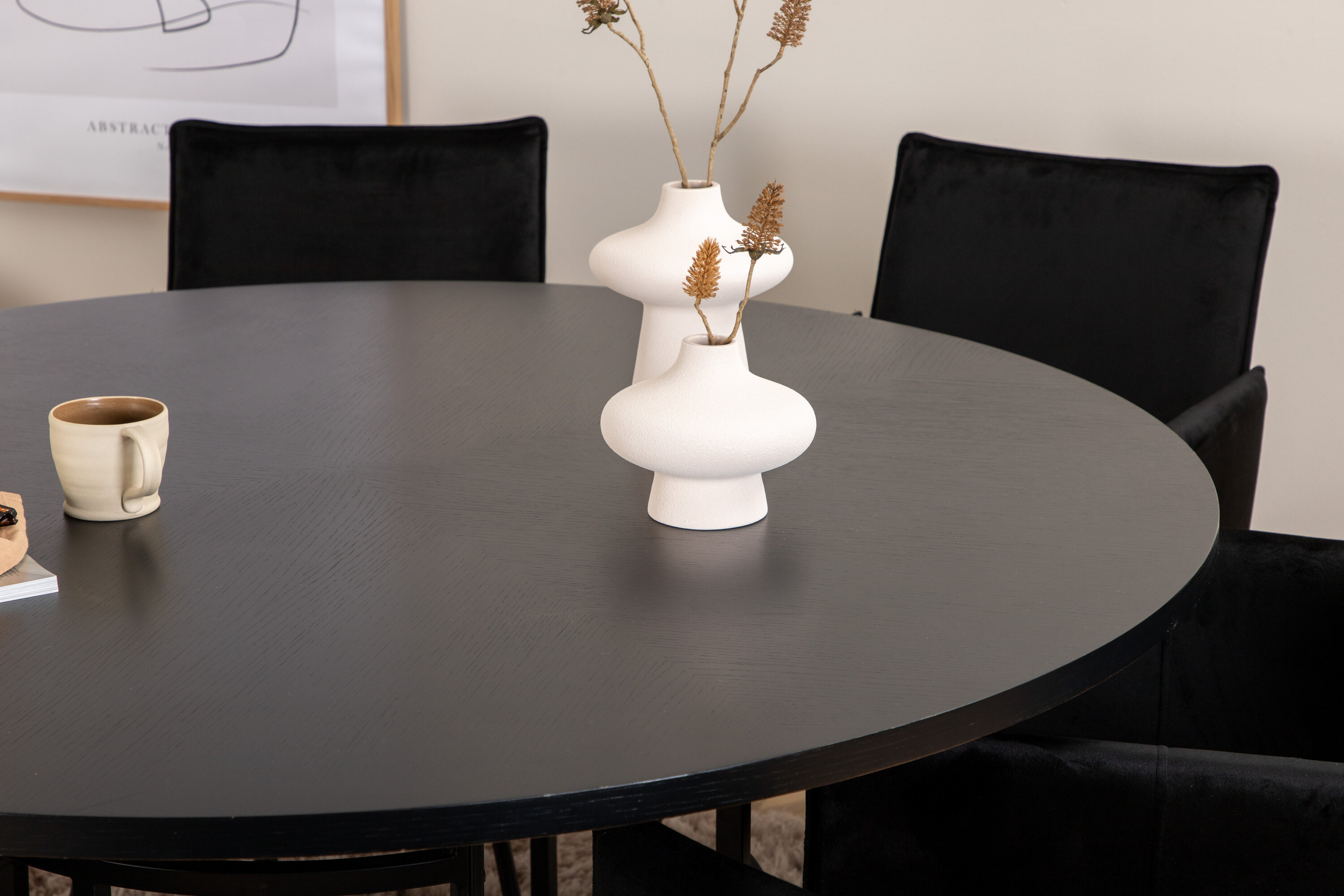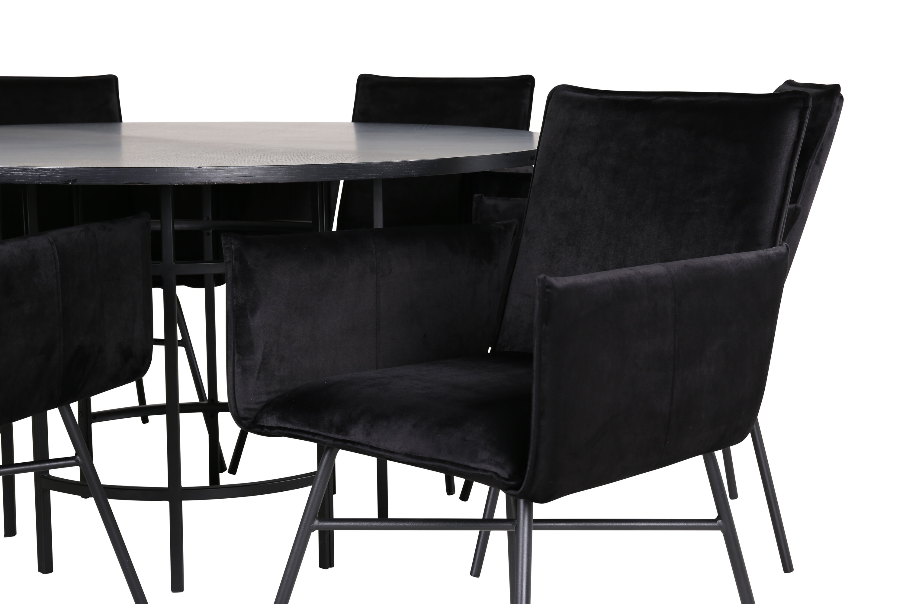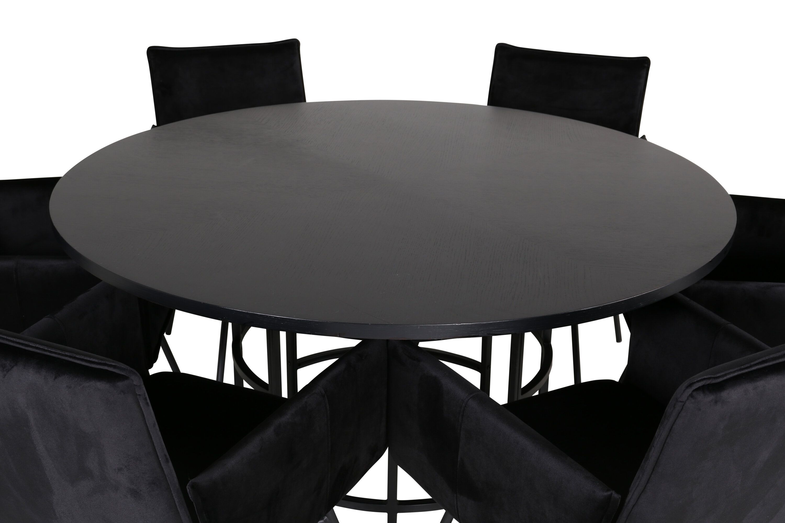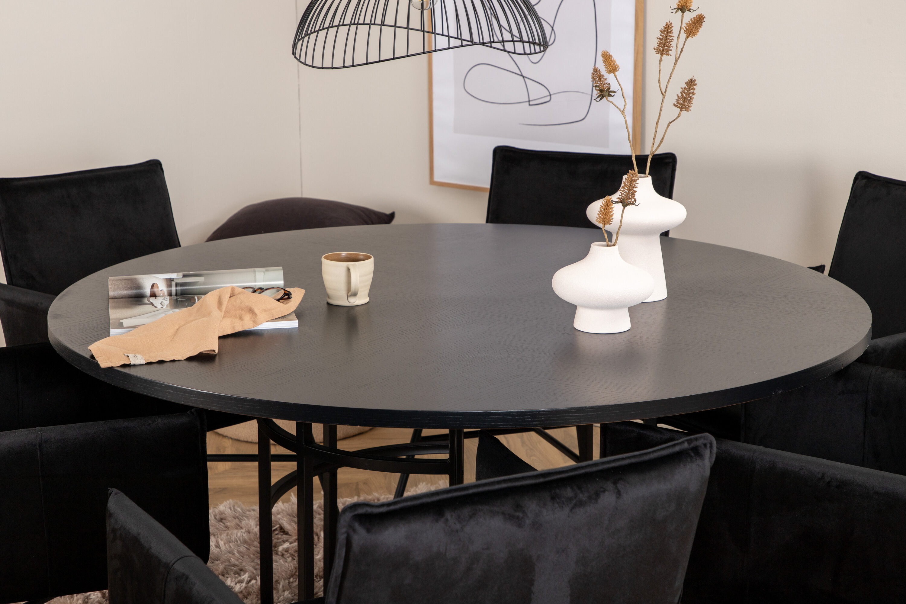 Kopenhaagen, meie populaarne ümmargune söögilaud kauni mustast spooniga MDF-plaadist lauaplaadi ja dekoratiivse silindrikujulise mustast metallist veermikuga. Laud on ühtlaselt elegantses mustas värvitoonis, mis annab ruumile pompoosse ja ülemeeliku ilme, kuid samas ka hõlpsasti sobitatav muu sisustusega. Laua läbimõõt: läbimõõt: 140 cm, kõrgus: 74 cm. Siin on see sobitatud 6 luksusliku disainiga Petra söögitooliga. Toolidel on mugav istmesügavus, musta sametist iste ja kitsad rauast toolijalad. Tooli mõõdud: kõrgus: 87 cm, istme kõrgus: 48 cm, laius: 57 cm, sügavus: 60 cm. Meeldiv toidugrupp igaks juhuks!
