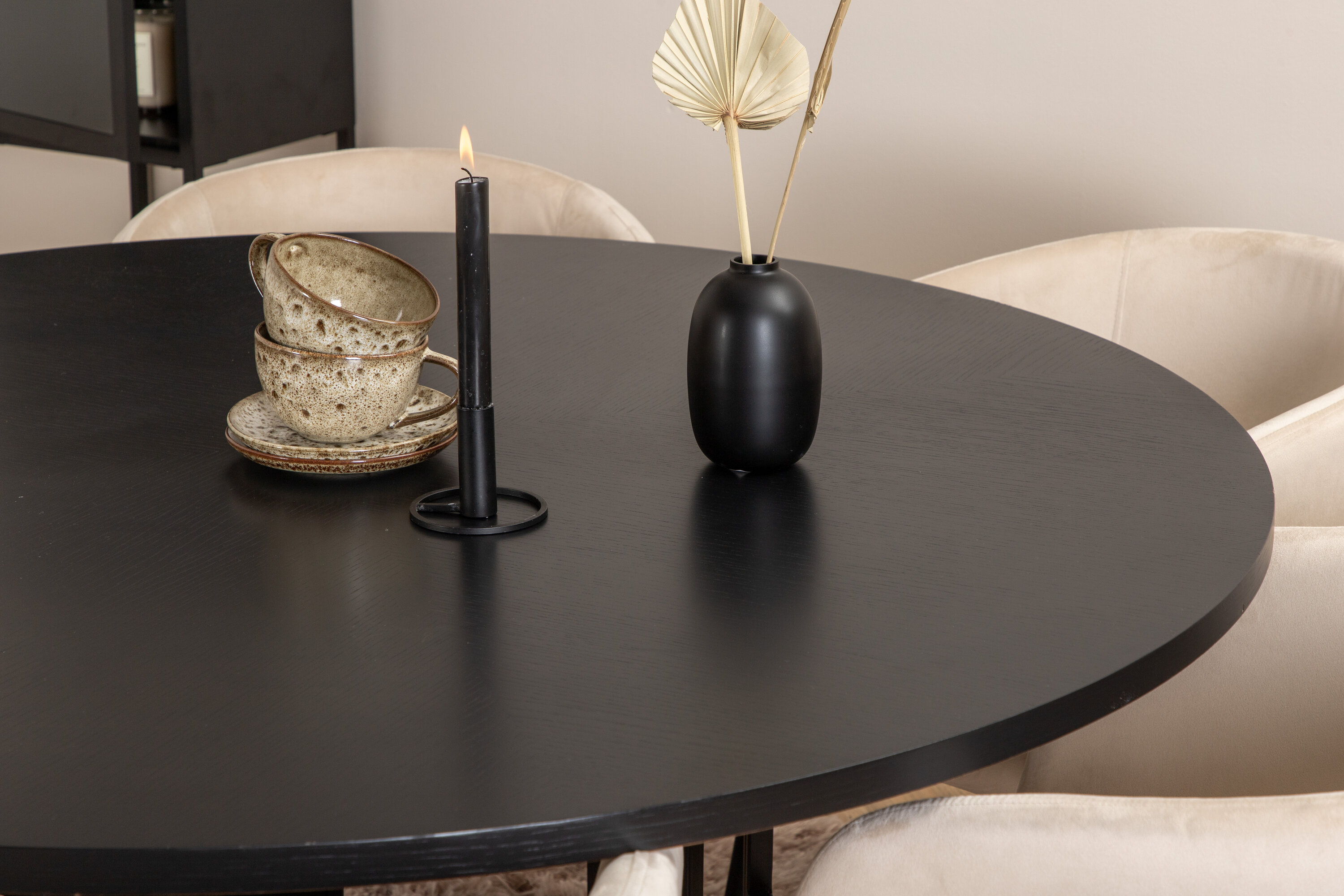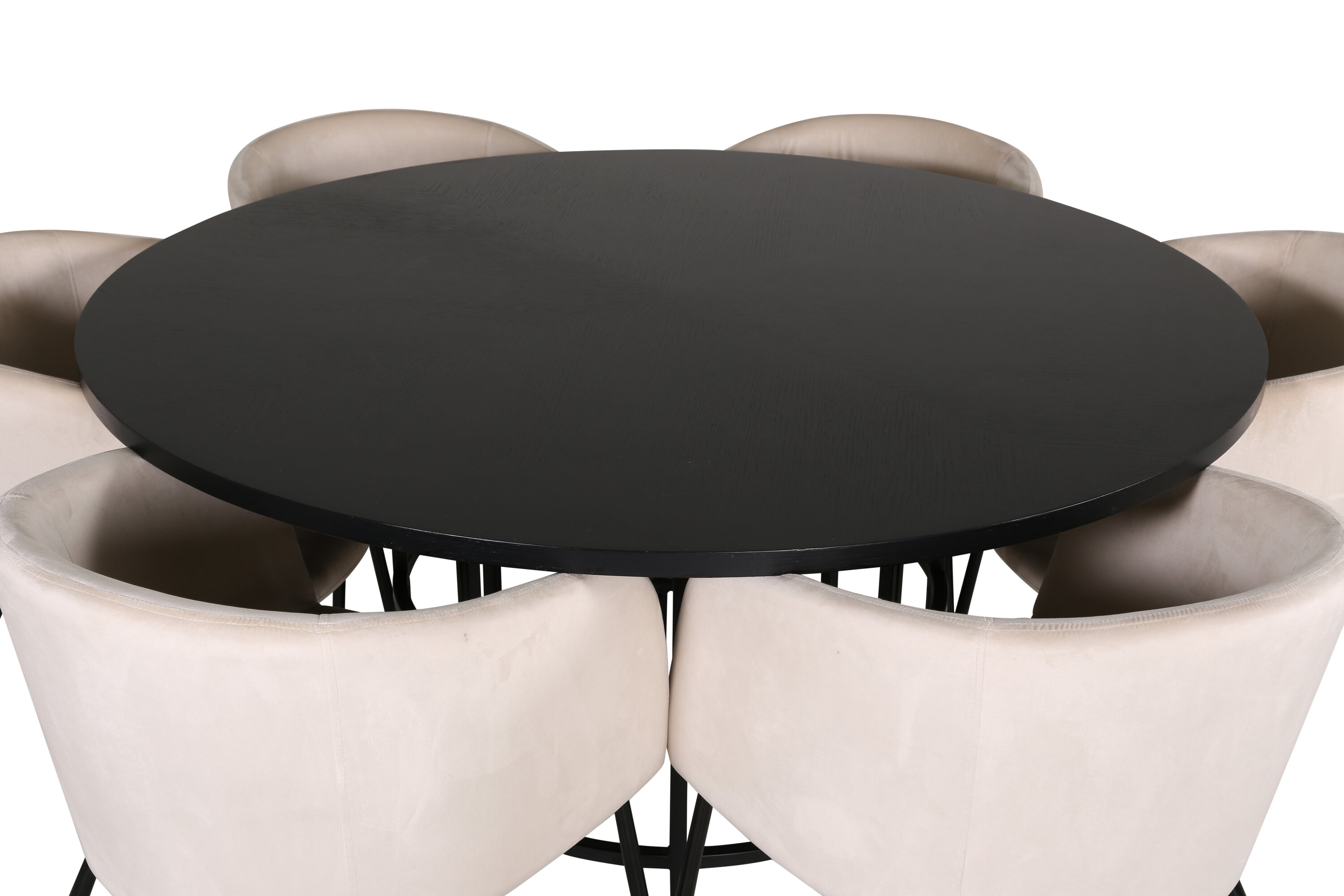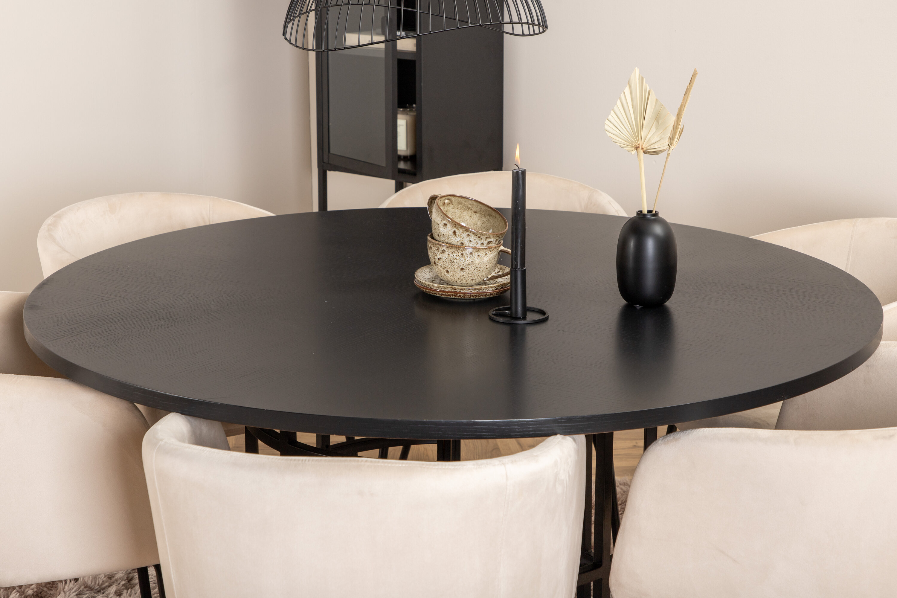 Looge moodsa välimusega ümmarguse toidugrupiga võluv keskpunkt kodu südames! Kopenhaageni söögilaud on trendikindla disainiga ühtlaselt mustas värvitoonis, spooniga MDF-plaadist lauaplaadi ja dekoratiivse silindrikujulise metallist veermikuga. Laua läbimõõt: läbimõõt: 140 cm, kõrgus: 74 cm. Siin on see sobitatud 6 luksusliku disainiga Beriti söögitooliga. Toolidel on mugav beežist sametist iste ja stiilselt kitsad rauast taburetijalad. Tooli mõõdud: kõrgus: 78 cm, istme kõrgus: 49 cm, laius: 55 cm, sügavus: 55 cm. Sisusta mõnusaks õhtusöögiks!