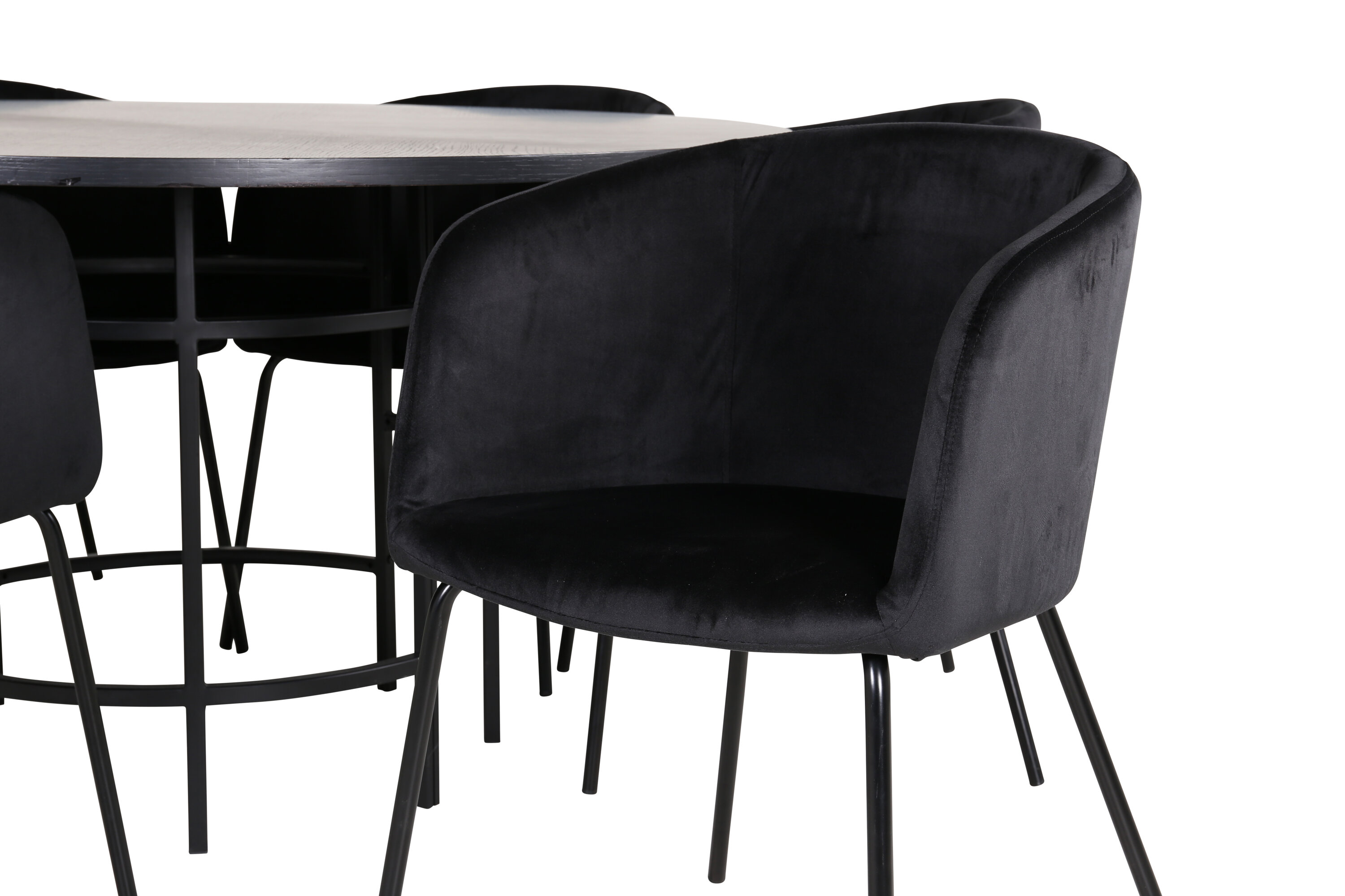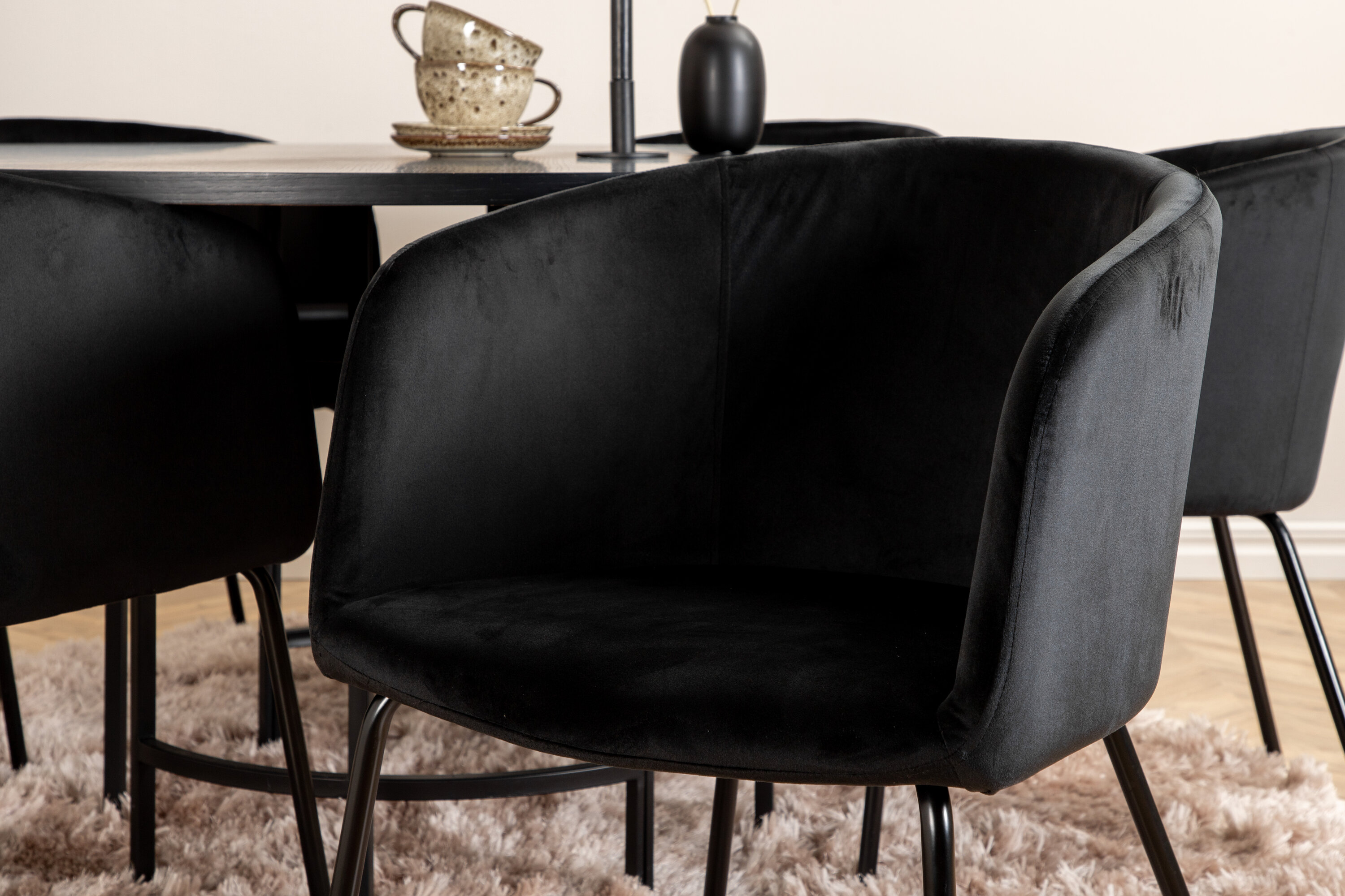 Looge moodsa välimusega ümmarguse toidugrupiga võluv keskpunkt kodu südames! Kopenhaageni söögilaud on trendikindla disainiga ühtlaselt mustas värvitoonis, spooniga MDF-plaadist lauaplaadi ja dekoratiivse silindrikujulise metallist veermikuga. Laua läbimõõt: läbimõõt: 140 cm, kõrgus: 74 cm. Siin on see sobitatud 6 luksusliku disainiga Beriti söögitooliga. Toolidel on mugav mustast sametist iste ja stiilselt kitsas rauast taburetijalg. Tooli mõõdud: kõrgus: 78 cm, istme kõrgus: 49 cm, laius: 55 cm, sügavus: 55 cm. Sisusta mõnusaks õhtusöögiks!