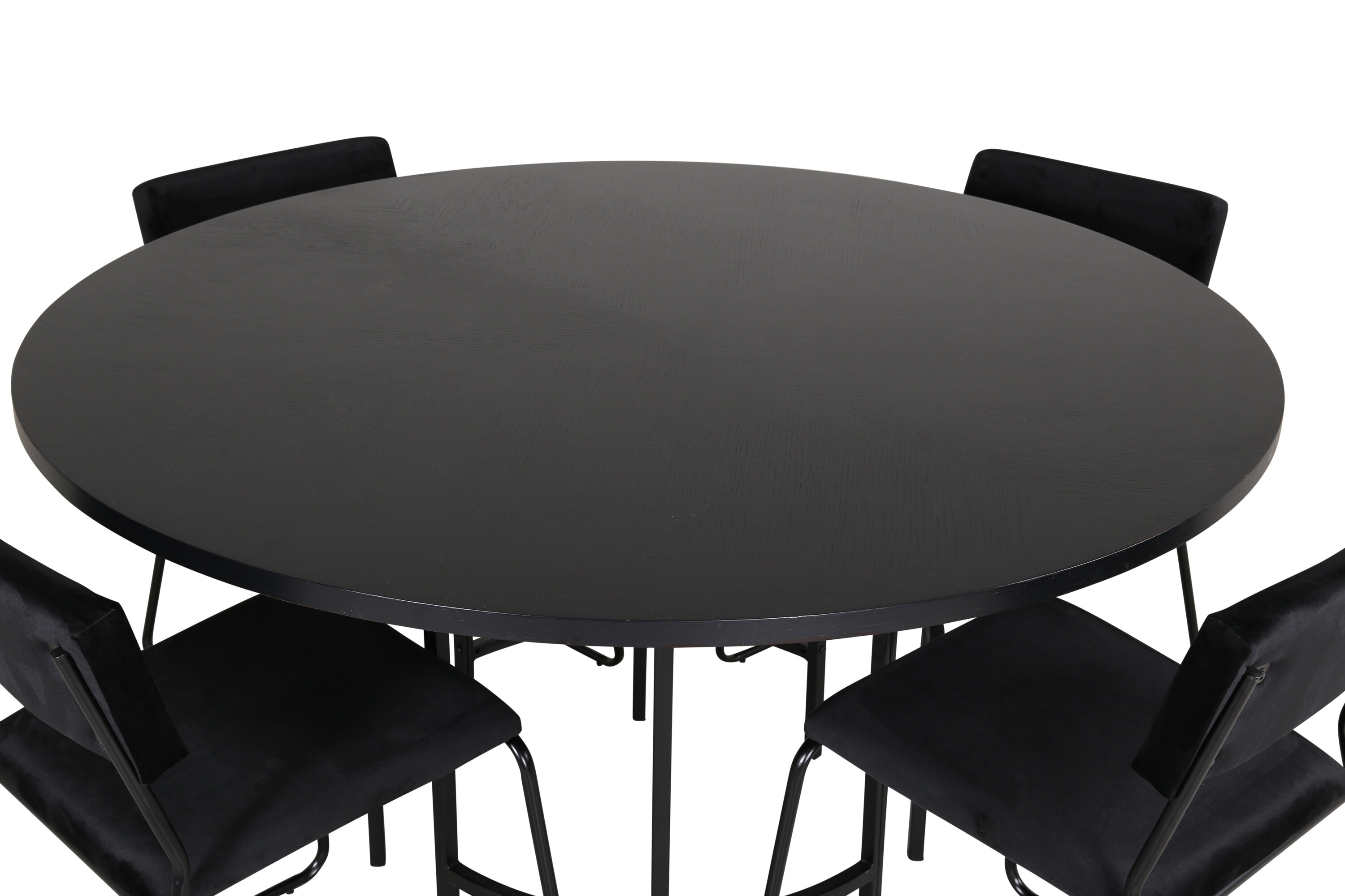Ühendage tööstuslik välimus minimalistliku sisekujundusega! Kopenhaageni söögilaud on trendikindla disainiga ühtlaselt mustas värvitoonis, spooniga MDF-plaadist lauaplaadi ja dekoratiivse silindrikujulise metallist veermikuga. Laua läbimõõt: läbimõõt: 140 cm, kõrgus: 74 cm. Sobib siia kokku 4 stiilse Kenth sarja söögitooliga. Toolijalad on rauast kitsad ja istmed mugavad mustast sametkangast. Tooli mõõdud: kõrgus: 76 cm, istme kõrgus: 48,5 cm, laius: 40 cm, sügavus: 52 cm. Loo võluv keskpunkt, et koguda perekonda ja sõpru!
